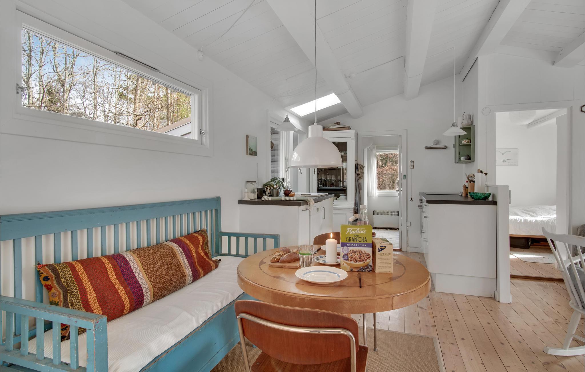 På en skovklædt grund ligger dette charmerende feriehus, som bliver jeres base til et par rolige dage ved vandet.