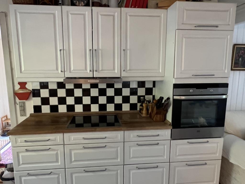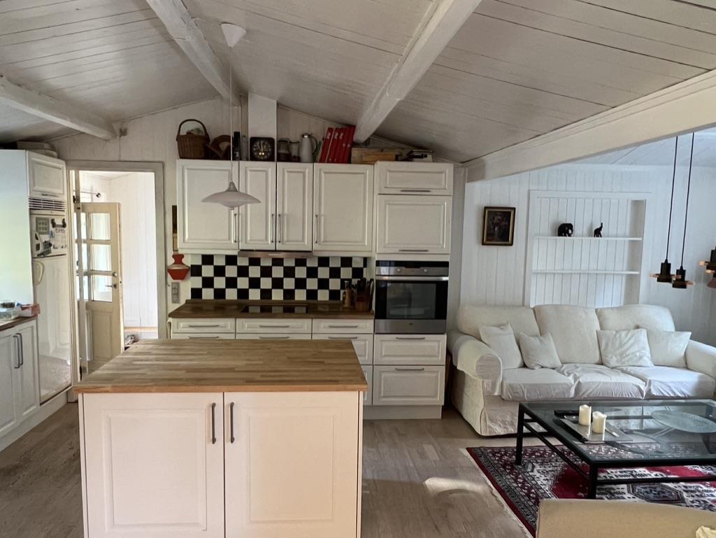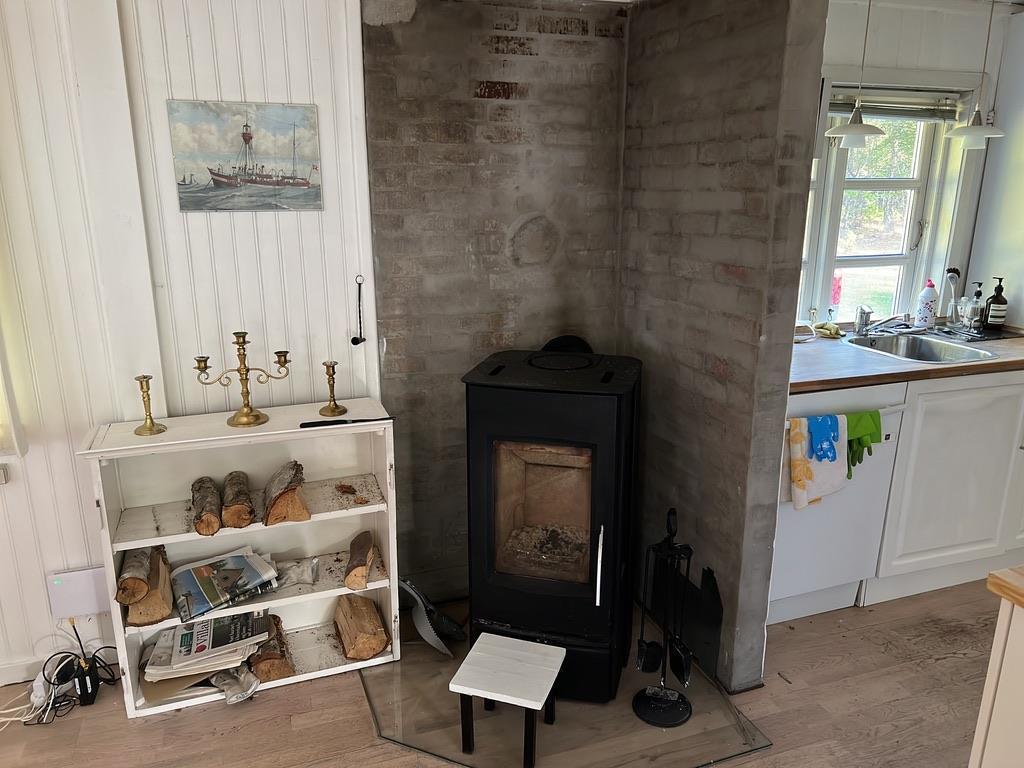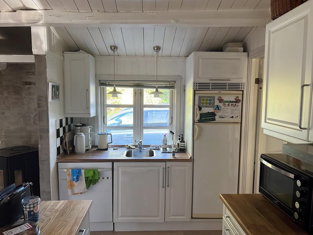 Dette hyggelige og oprindelige feriehus er renoveret og fremstår både lyst og indbydende. Her er et lækkert, velindrettet og veludstyret køkken - selvfølgelig med opvaskemaskine. Køkkenet ligger i åben forbindelse med den hyggelige stue, der har brændeovn. Der er et meget stort spisebord med plads til mange mennesker – et praktisk sted at spise sammen, men også en mulighed for at spille brætspil og lignende familieaktiviteter