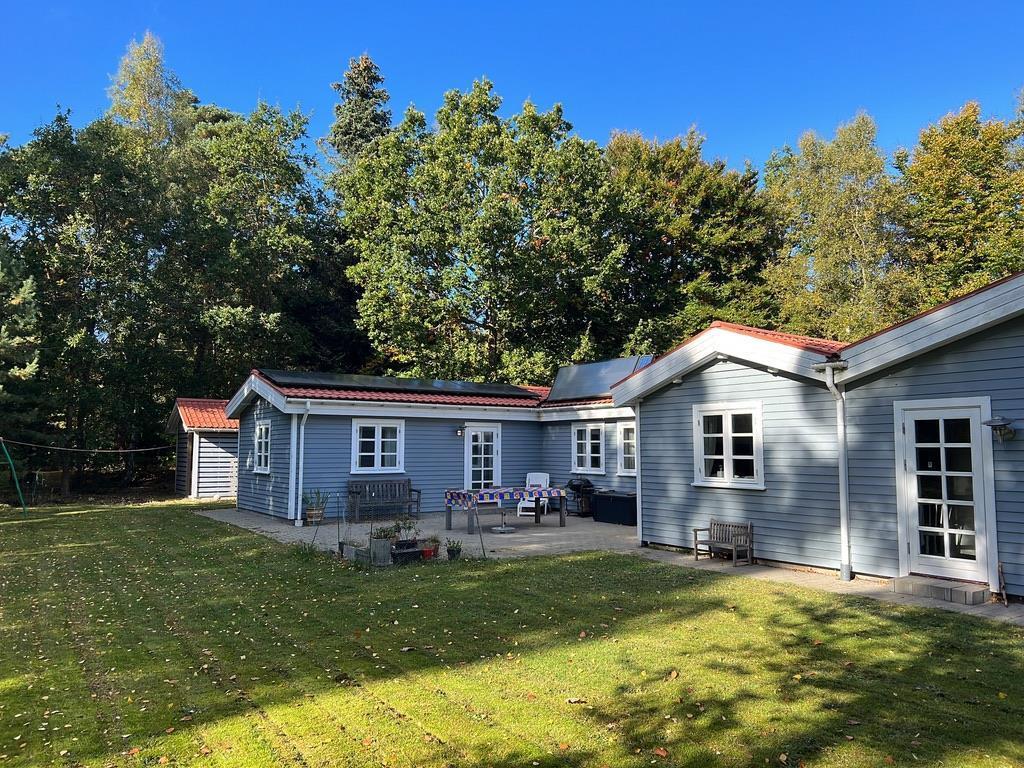 Udenfor er der en stor åben, ugeneret terrasse med havemøbler, liggestole og grill. Der er p-plads på grunden.