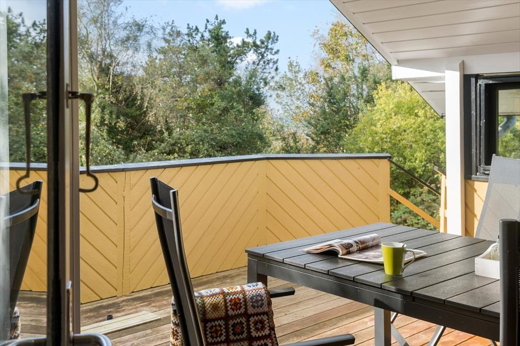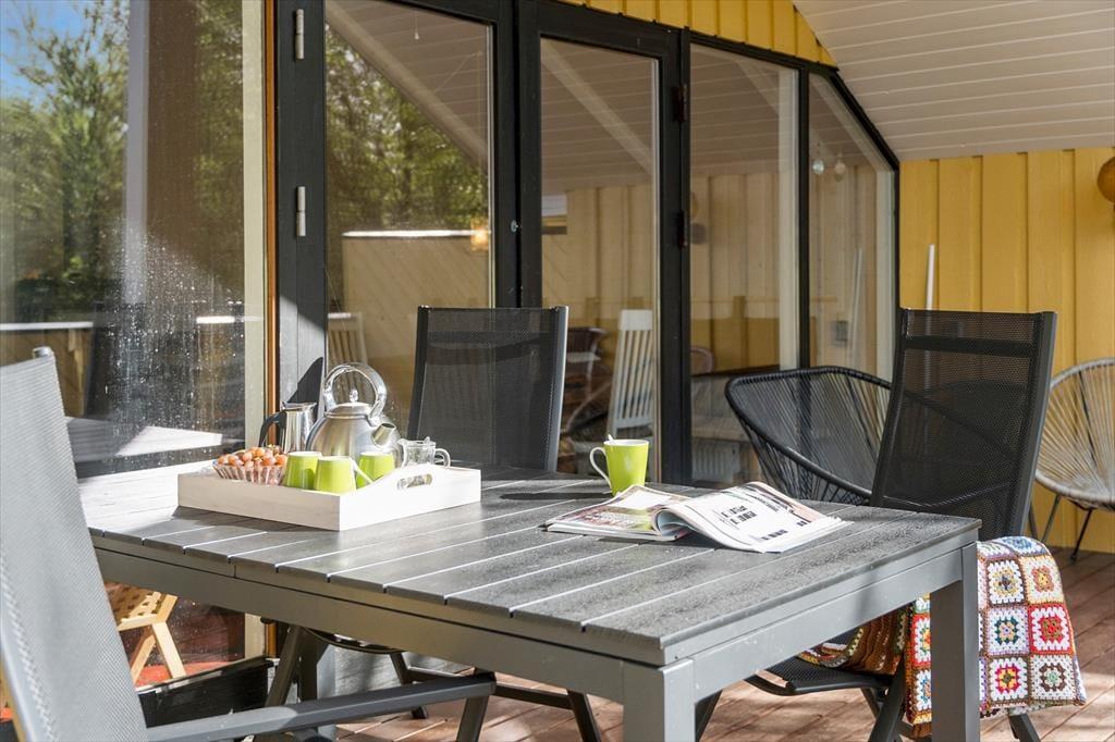 Huset er beliggende på en 1448 m2 natur grund og byder på flere terrasser. En delvis overdækket træterrasse og en åben fliseterrasse. Der er havemøbler og grill til rådighed