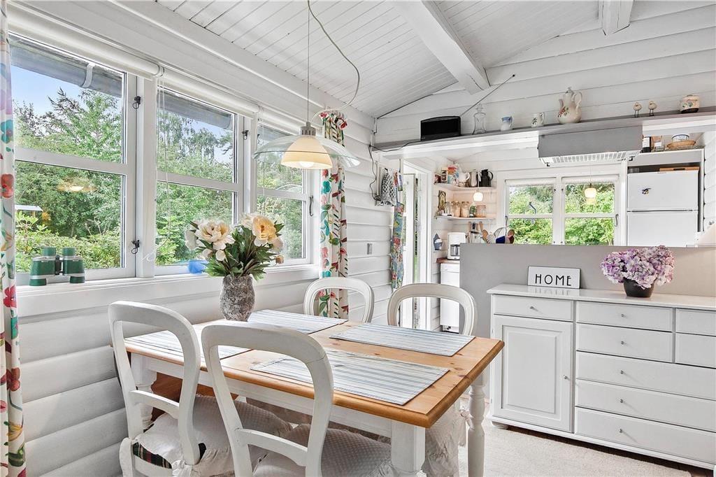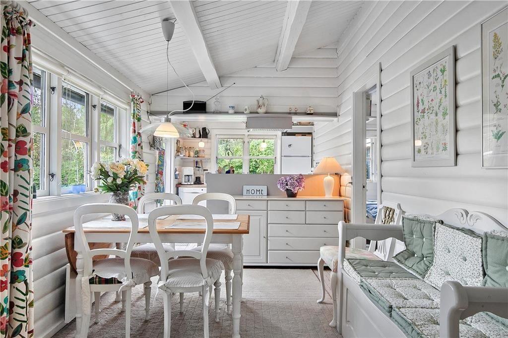 Feriehuset er indrettet med kombineret køkken og opholdsstue. Lyst Køkken som indeholder keramisk komfur , opvaskemaskine, mikroovn og køleskab med fryser. Opholdsstue med udgang til terrasse, pejs, sofa, lænestole, tv med danske, svenske, norske og tyske programmer, dvd og hyggelig spiseplads. Badeværelse med klinkegulv, gulvvarme, bruseniche, vaskemaskine og tørretumbler. Tre soveværelser, et med dobbeltseng, et med 2 enkeltsenge og et med 1 enkeltseng. Huset opvarmes med varmepumpe, Brændeovn og elvarme.