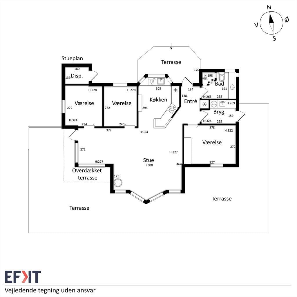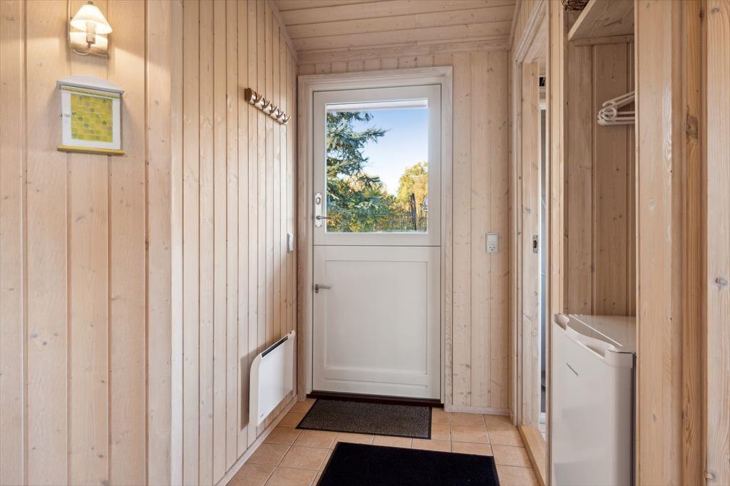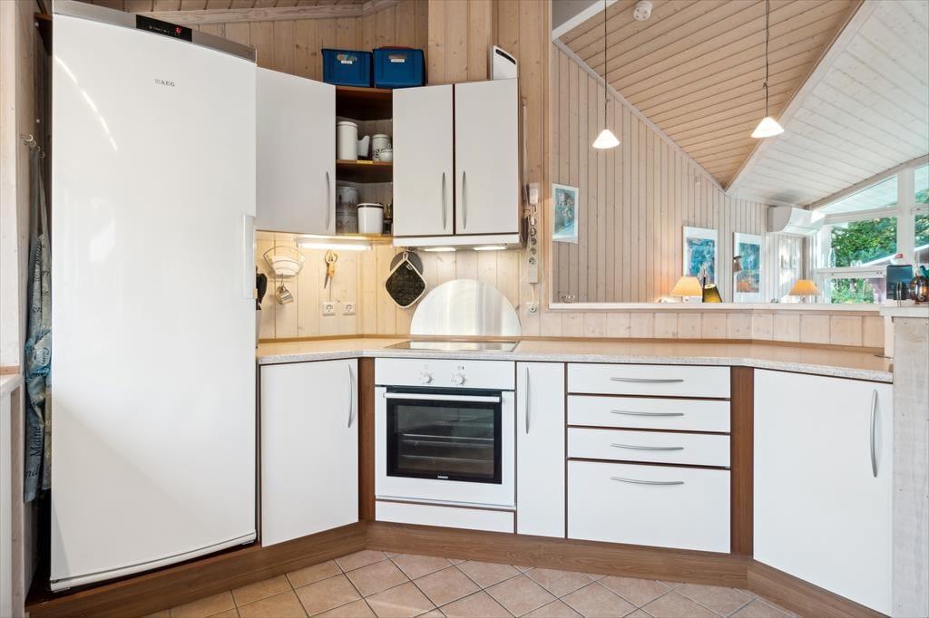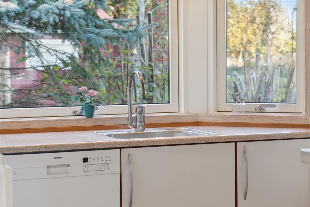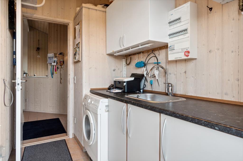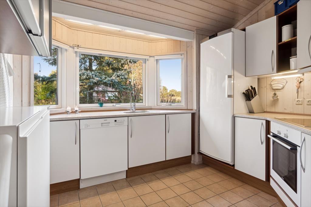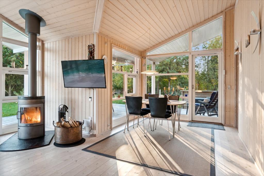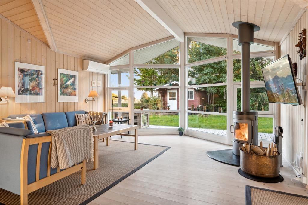 Velkommen indenfor: Indendørs finder du store glaspartier med masser af lys og luft og et indbydende opholdsrum, hvor familien kan samles. Her er stuen og køkkenet etableret i åben forbindelse, og udover det rige lysindfald er rummet understøttet af, at loftet er ført til kip. Tænd gerne op i brændeovnen på de køligere dage, og lad roen sænke sig. Køkkenafdelingen er i et enkelt og lyst design og fra opholdsrummet er der adgang til alle tre værelser. Der er skydedøre, hvilket frigiver en del plads og boligen bliver fuldendt af et fint badeværelse og et praktisk bryggers med vaskemaskine.