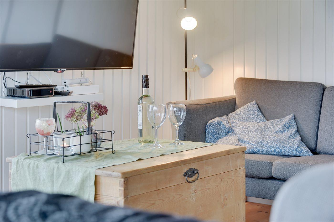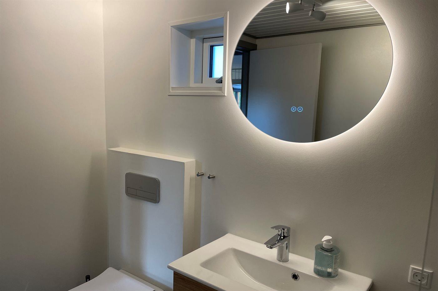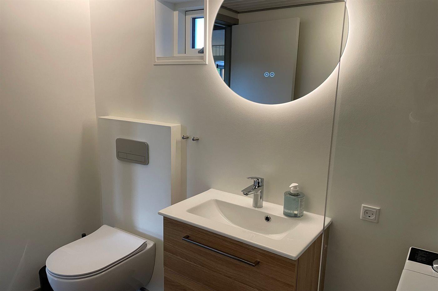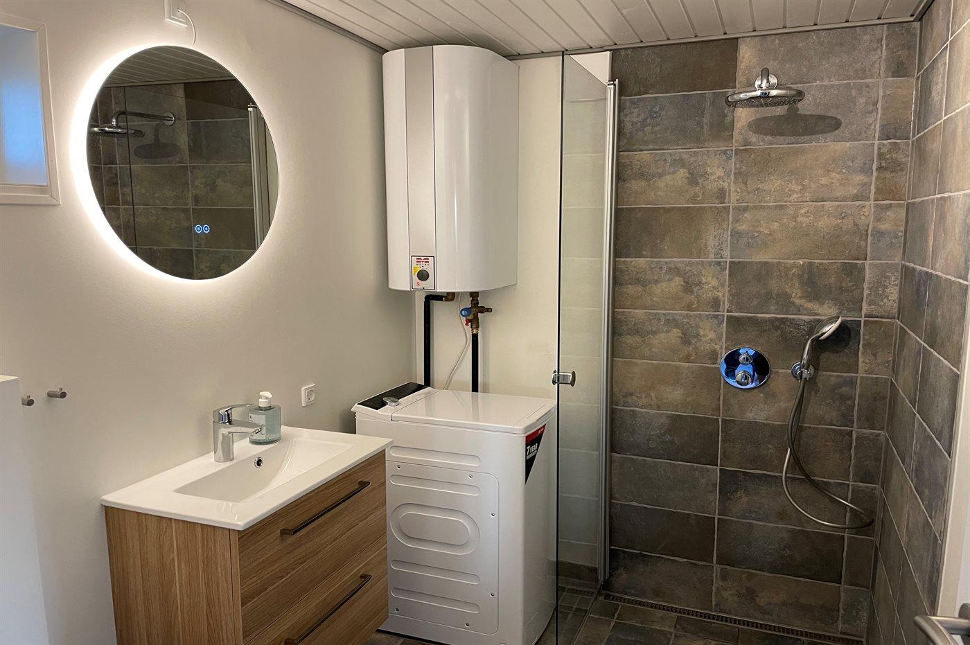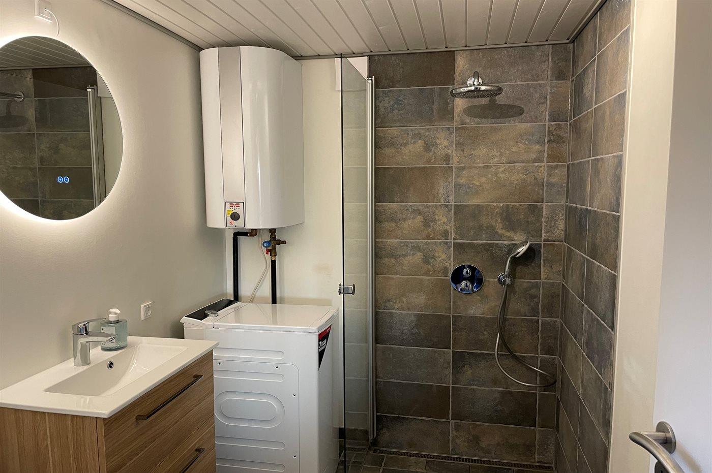 Der er 1 badeværelse fra 2025 med bruseniche,1 toilet og vaskemaskine. Der er gulvvarme på badeværelse. Der 1 TV med danske og tyske kanaler samt trådløst internet.