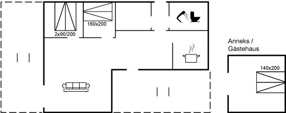 Der er i alt 2 soveværelser som fordeler sig med 1 værelse med dobbeltseng og 1 værelse med 1,5 mandsseng. Derudover anneks med dobbeltseng. Der er 1 barneseng samt 1 barnestol.