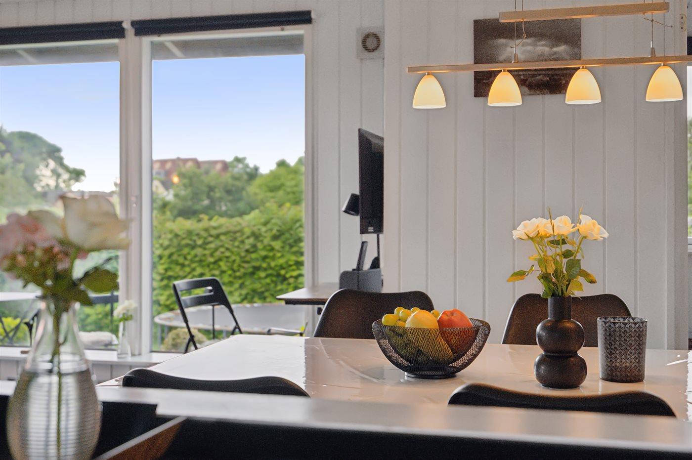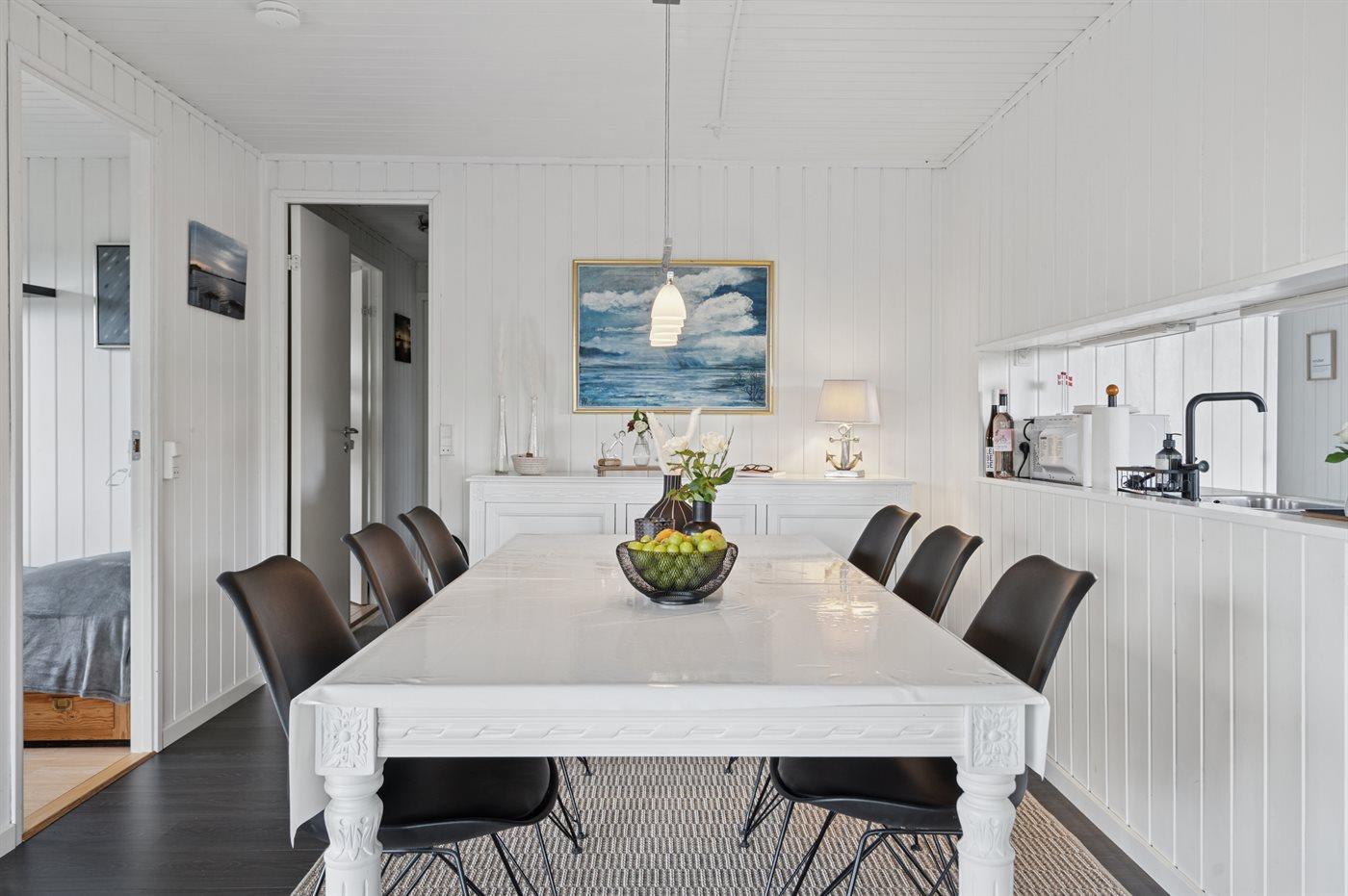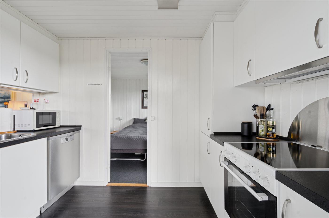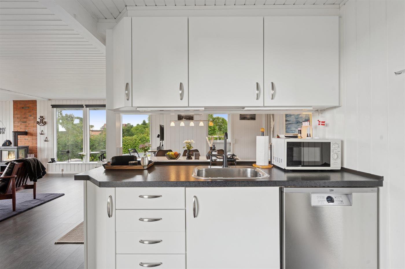 Det åbne køkken er veludstyret med køleskab, fryser (50 liters kapacitet), komfur med varmluftsovn, mikroovn, opvaskemaskine og andre nyttige apparater, og indbyder til at lave mad sammen.