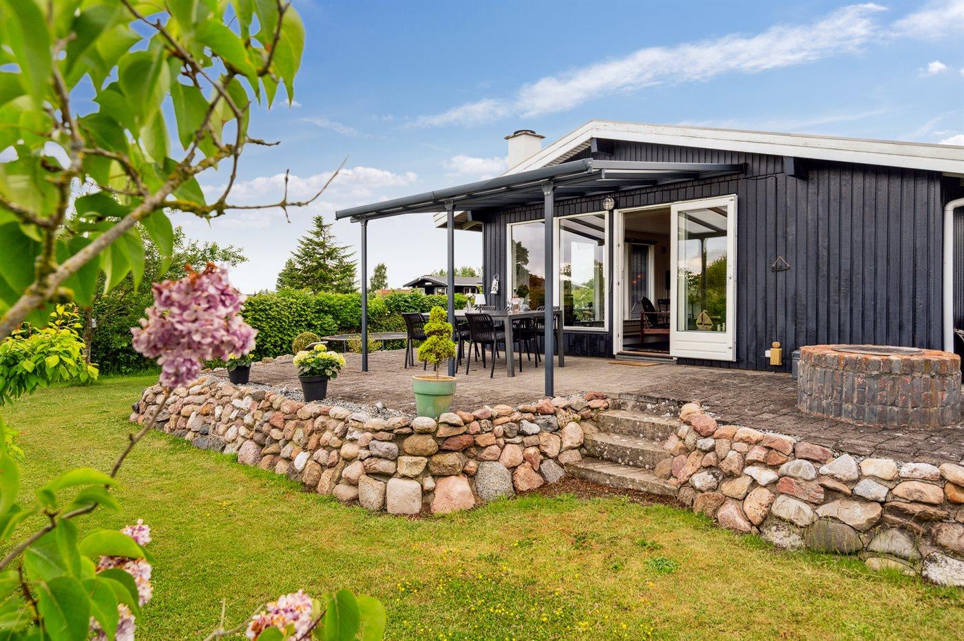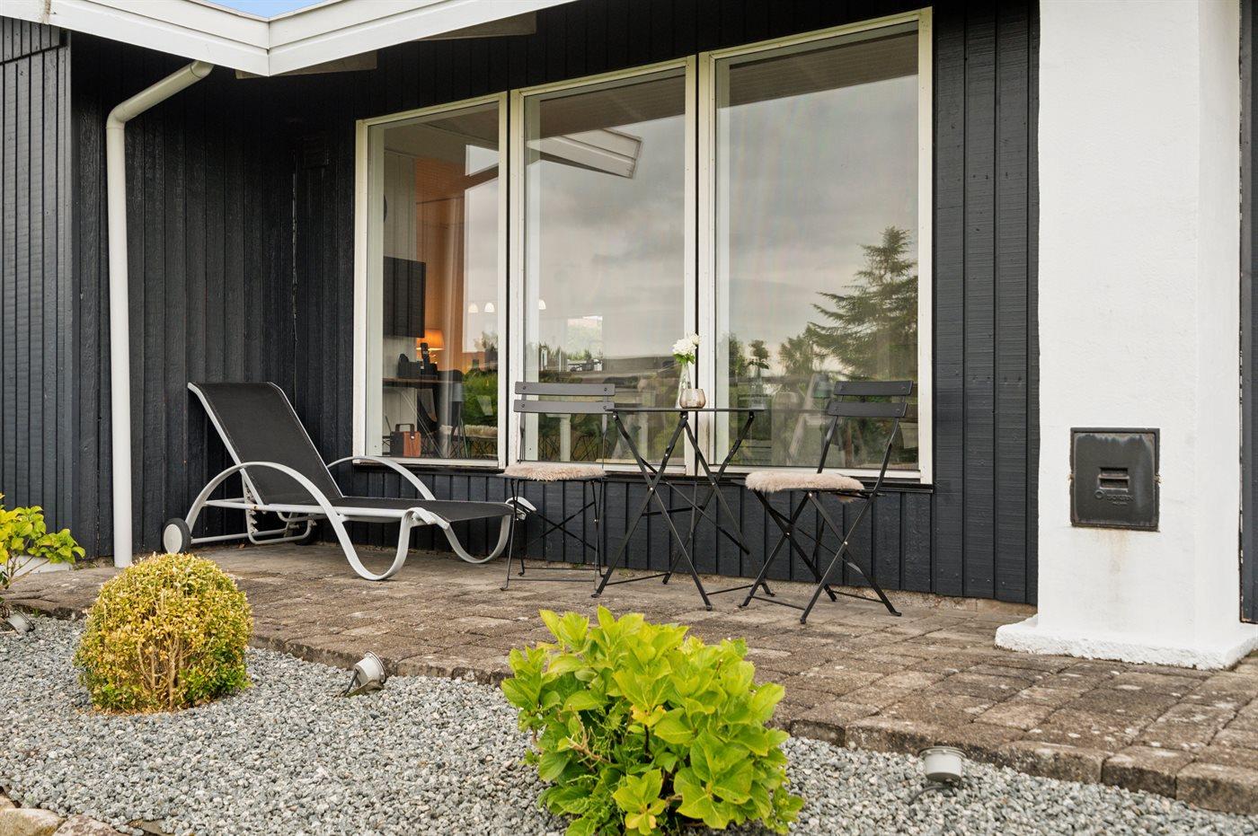 Den velholdte have byder på et terrasseområde, som er delvist overdækket. Der er hyggelige, rolige hjørner til læsning, afslapning og selvfølgelig til at spise sammen udendørs. To kulgrill er tilgængelige til dette formål.
