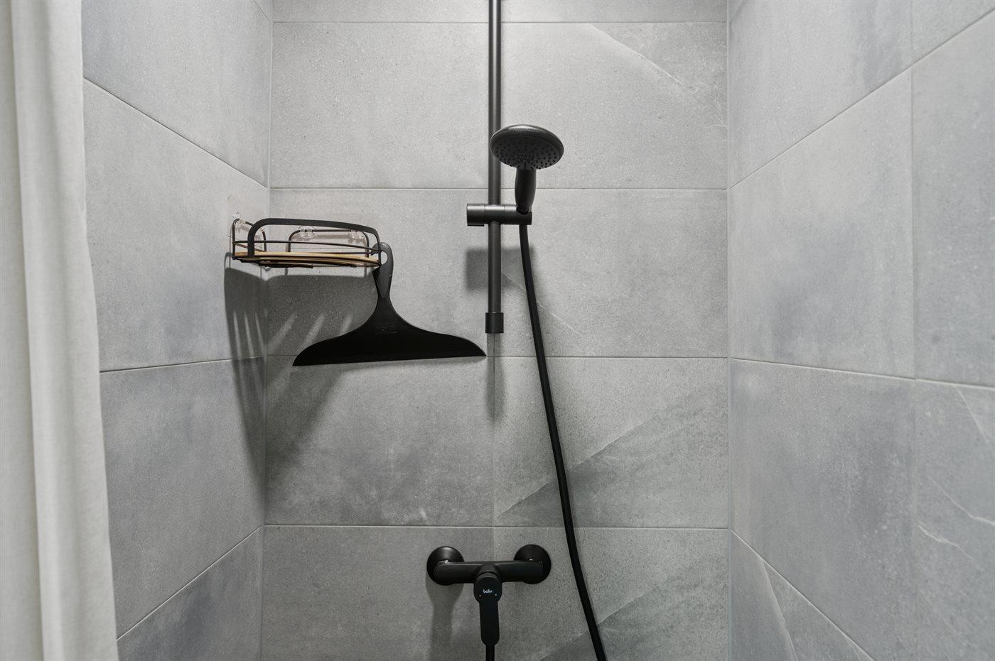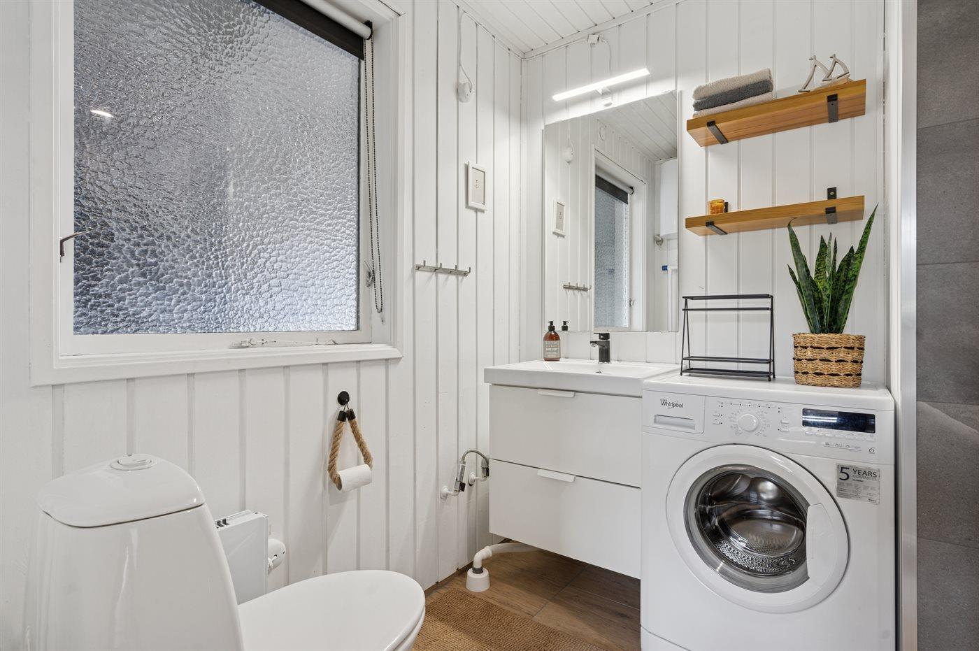 Badeværelset med bruser og toilet har også en vaskemaskine.