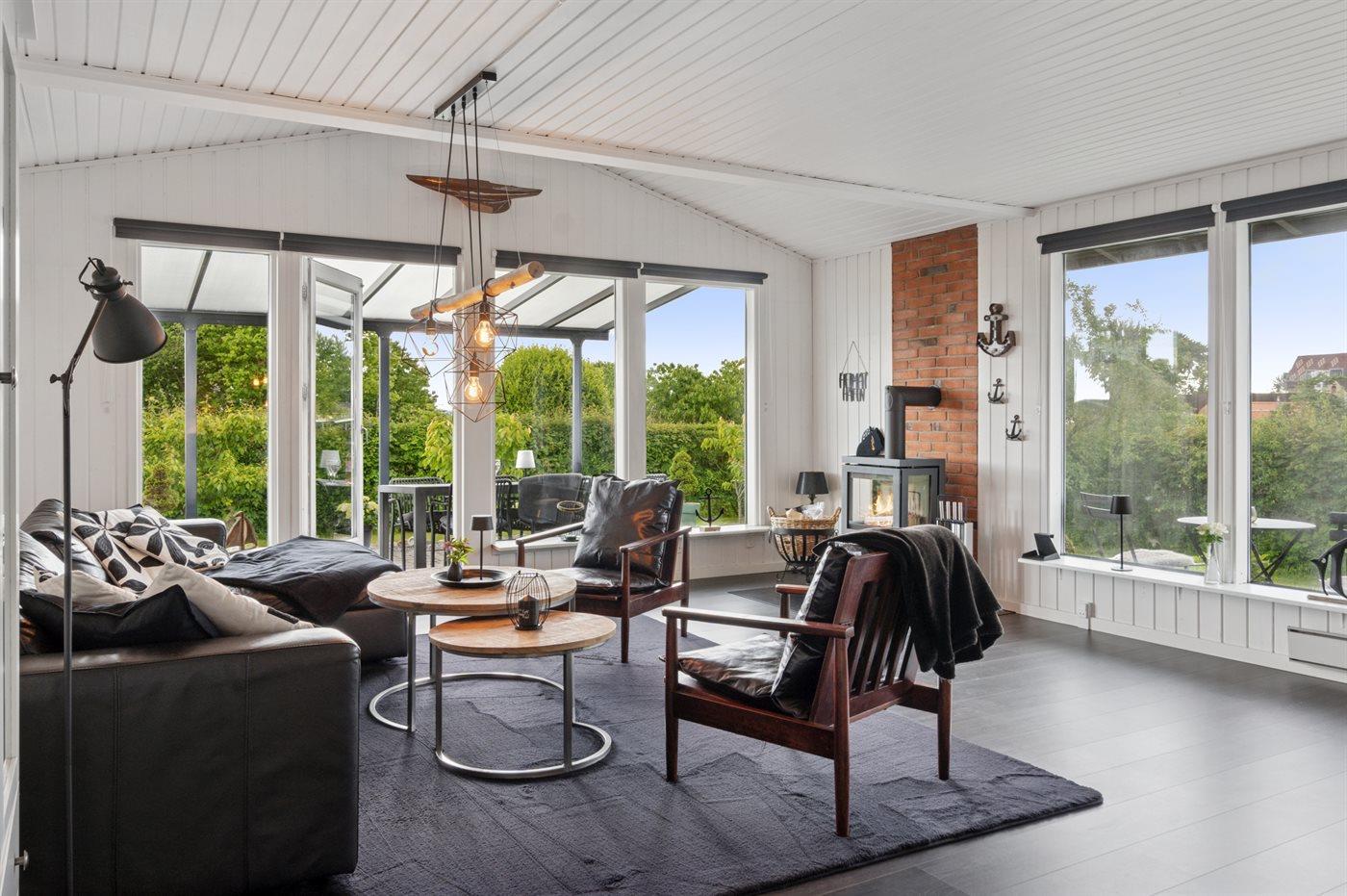 De store vinduespartier giver en storslået udsigt over det omkringliggende landskab og fjorden i baggrunden