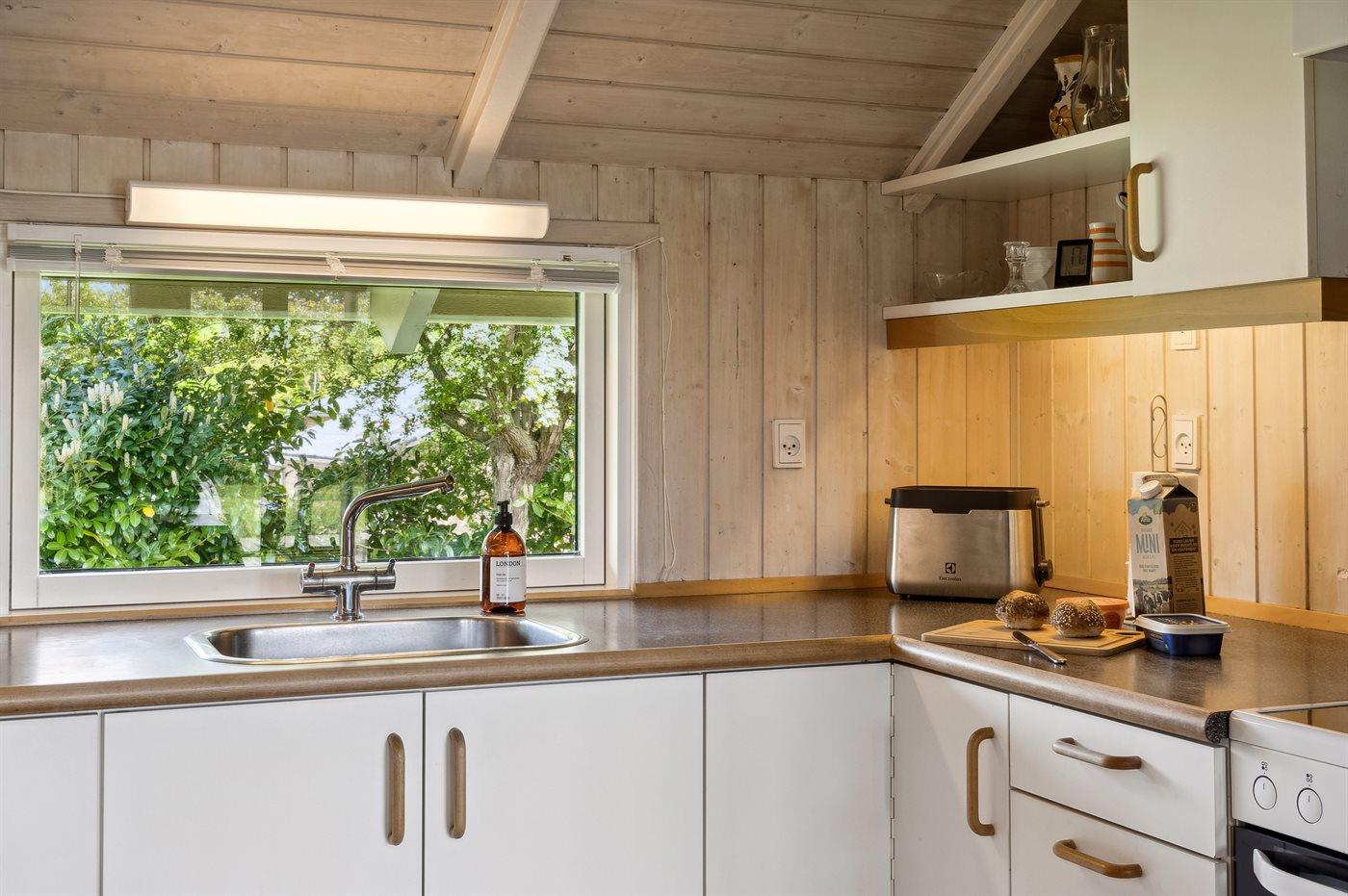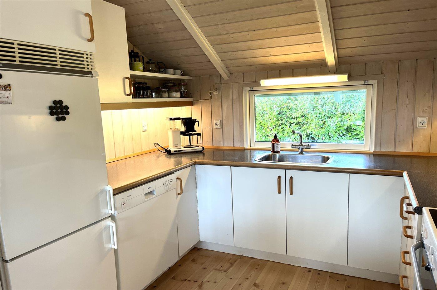 Køkkenet er udstyret med 1 køleskab. Der er 4 induktionskogeplader, varmluftovn, mikrobølgeovn samt opvaskemaskine.