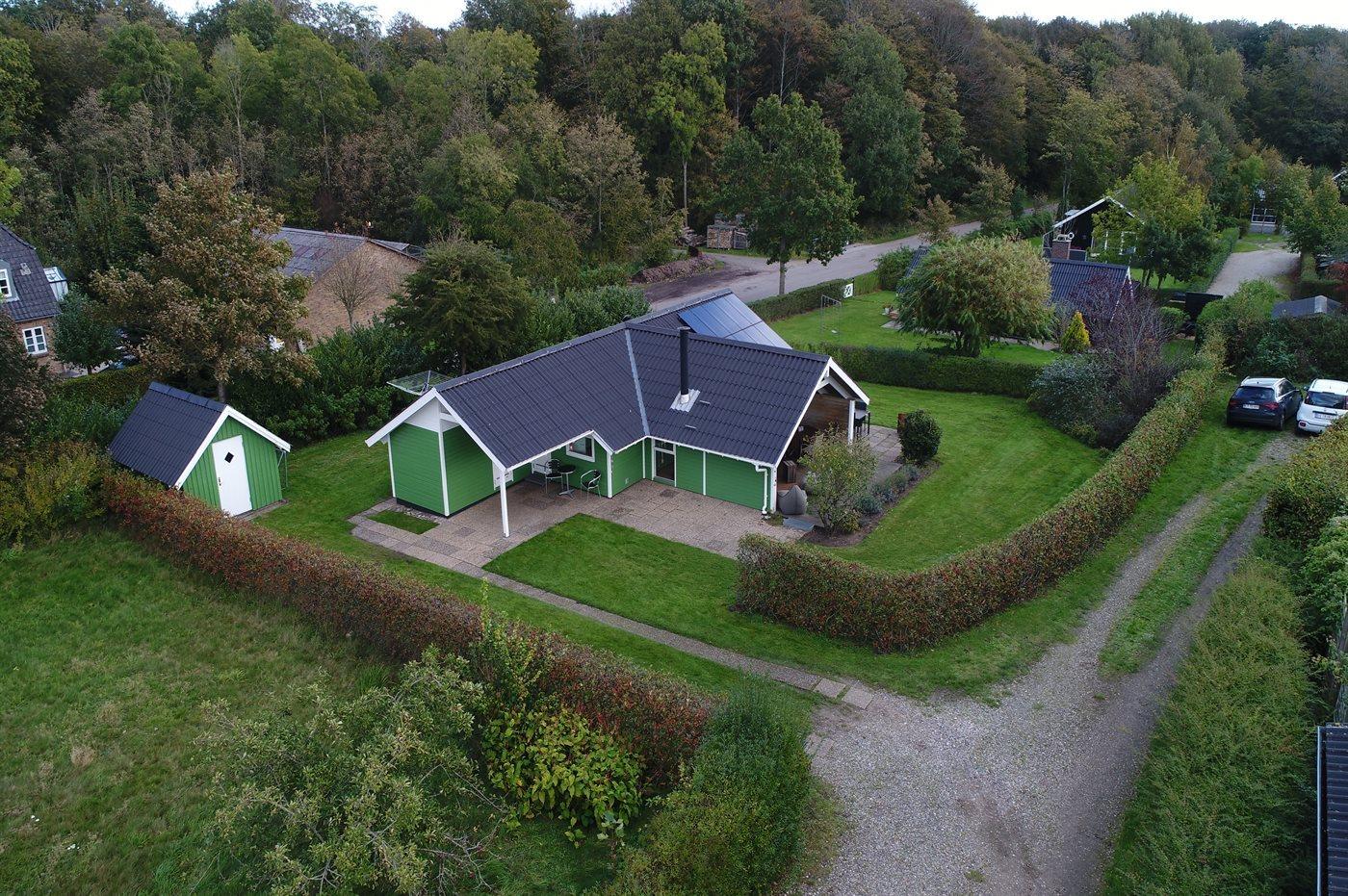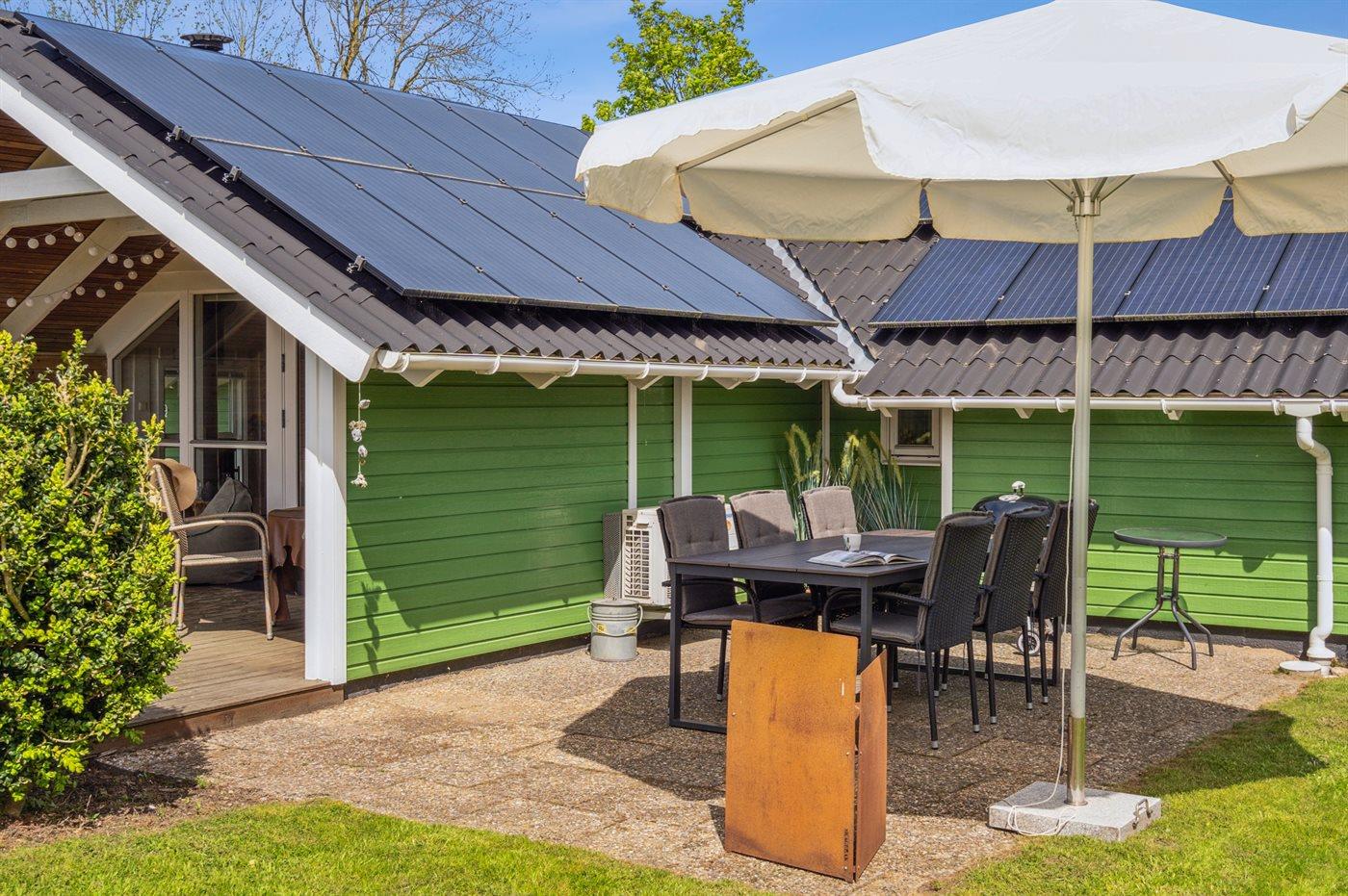 Ferieboligen er beliggende på en 800 m² stor naturgrund. Der er 500 m til havet. Nærmeste forretning er beliggende i en afstand af 3000 m. Der er en golfbane i en afstand af 14000 m. Til ferieboligen hører åbent og 15 m2 overdækket terrasseareal. Der er redskabsrum. Sandkasse. Fodboldmål. Grill til rådighed. Der er installeret stik til opladning af elbil. Type 2 stik. Med 11 kW ladeeffekt. Parkering ved ferieboligen.