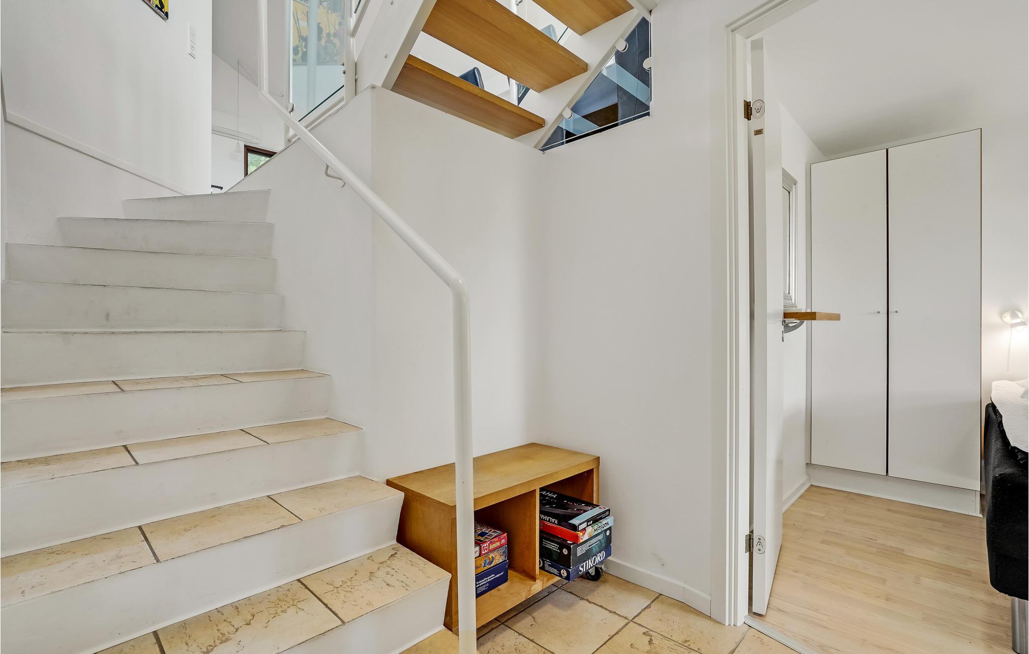 Fra husets stue og balkon har I en smuk udsigt over Flensborg Fjord. Huset er praktisk indrettet med et køkkenområde ved siden af spisepladsen og lidt forskudt herfra - 4 trin op - ligger den pænt indrettede stue med udgang til balkonen. Det store sydvestvendte vinduesparti giver masser af udsigt og lys. Det rummelige hus med flere gode soveværelser, stort badeværelse og gæstetoilet gør opholdet behageligt og afslappende.