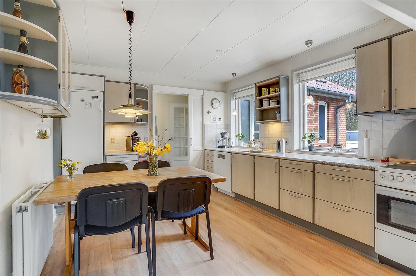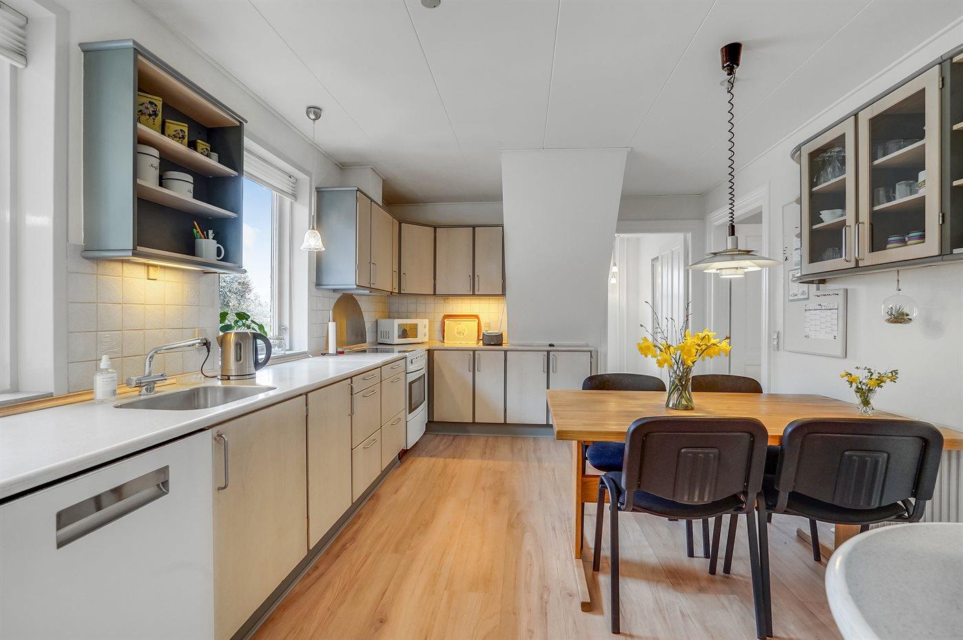 Køkkenet er udstyret med 1 køleskab. Der er 4 keramiske kogeplader, varmluftovn, mikrobølgeovn samt opvaskemaskine.