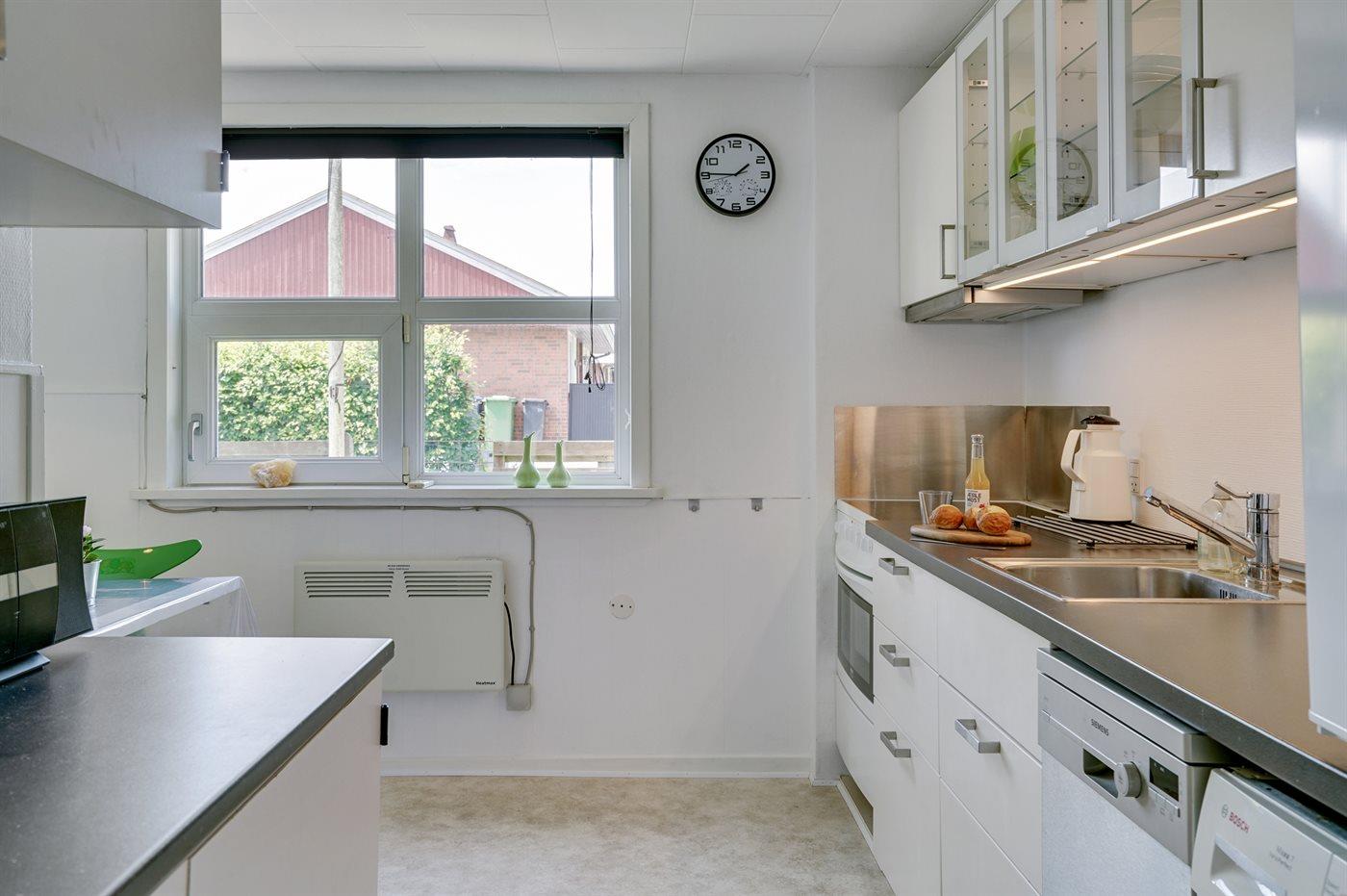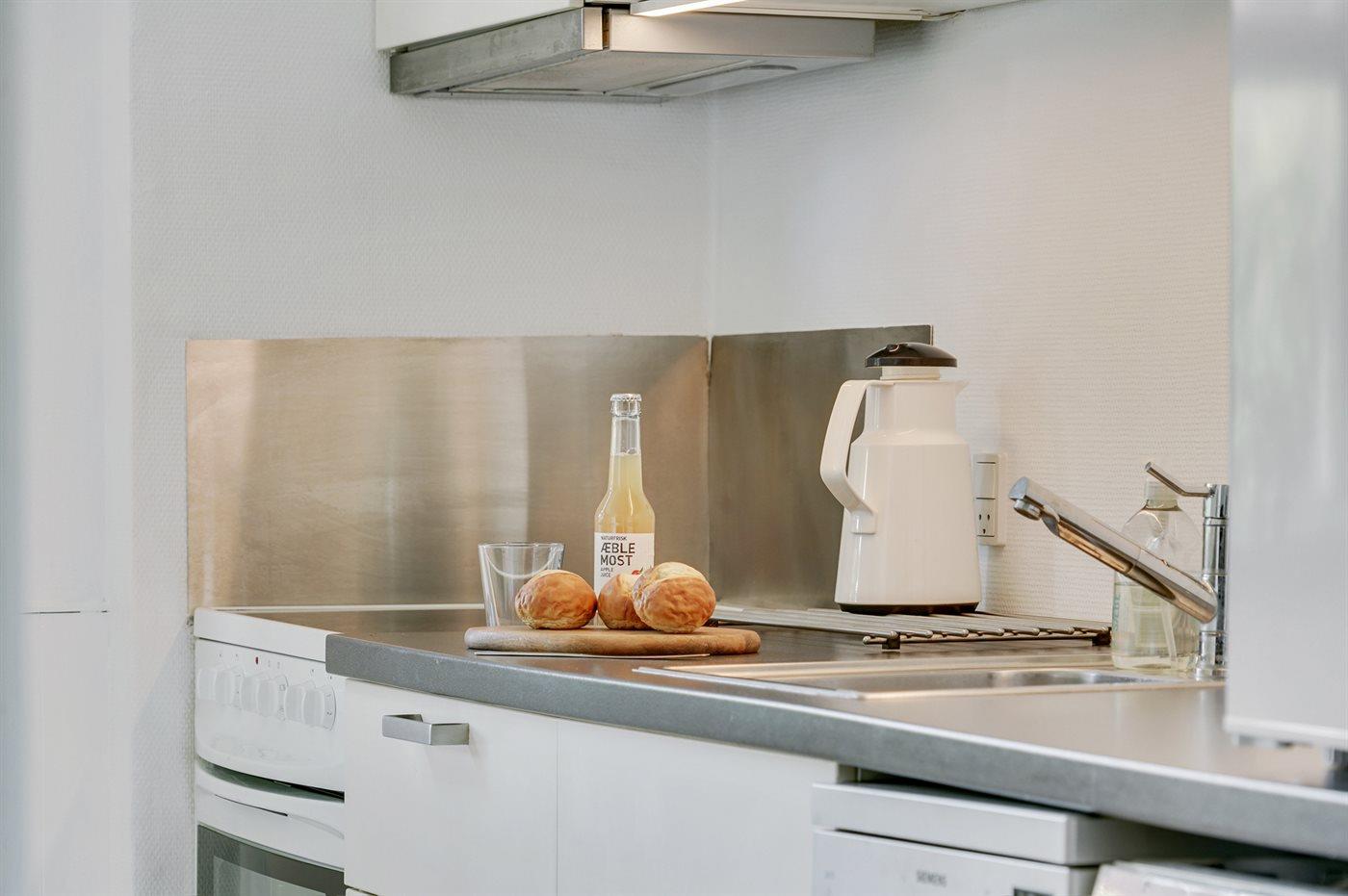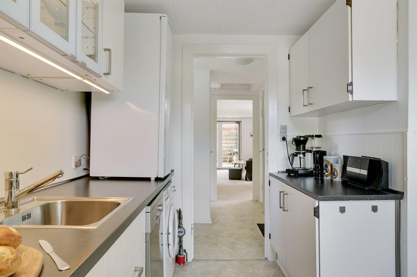Køkkenet er udstyret med 1 køleskab. Der er 4 keramiske kogeplader, varmluftovn, mikrobølgeovn, Airfryer samt opvaskemaskine.