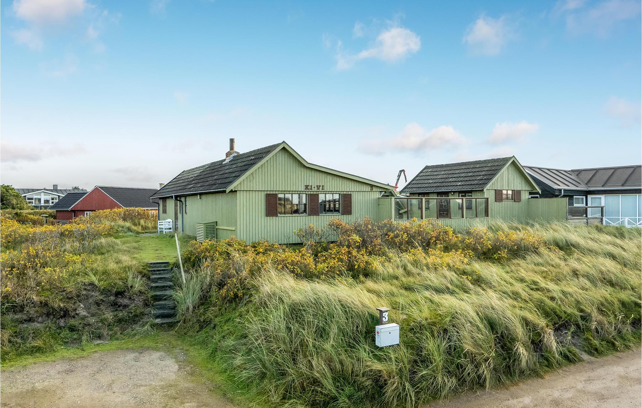 Dette hyggelige træhus er placeret på en højtliggende klitgrund i Rindby, tæt ved stranden.