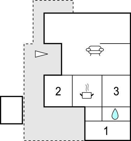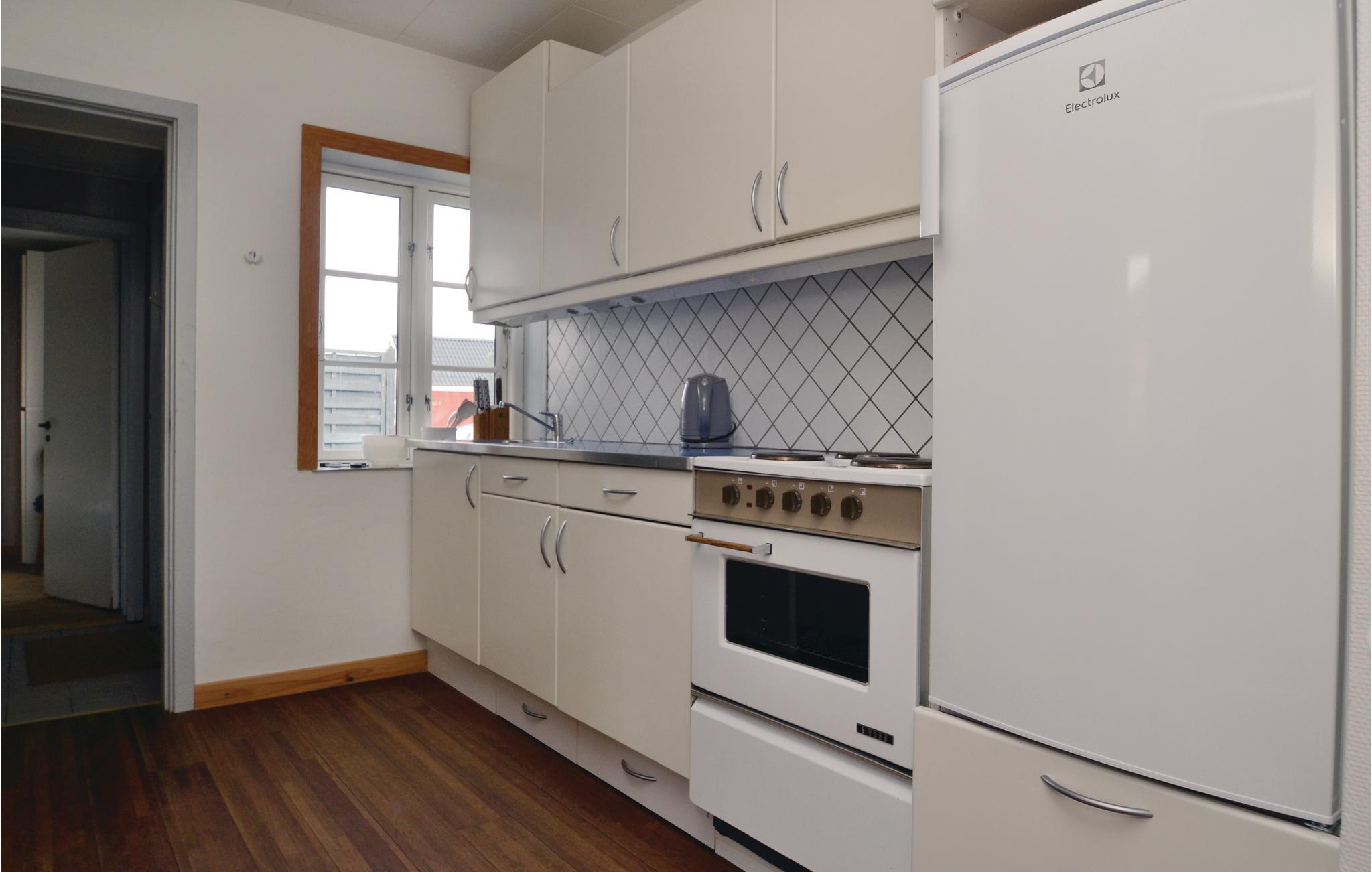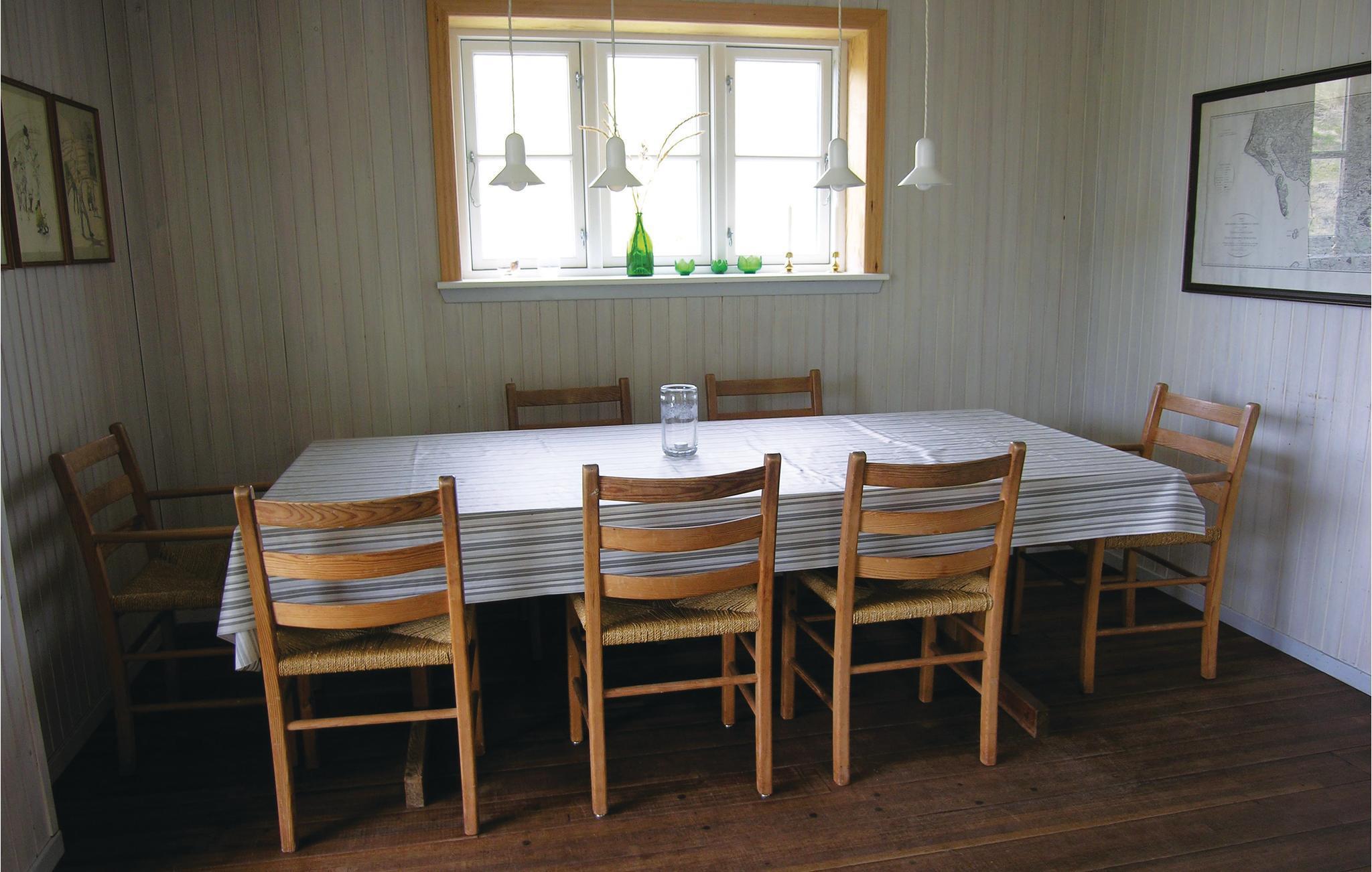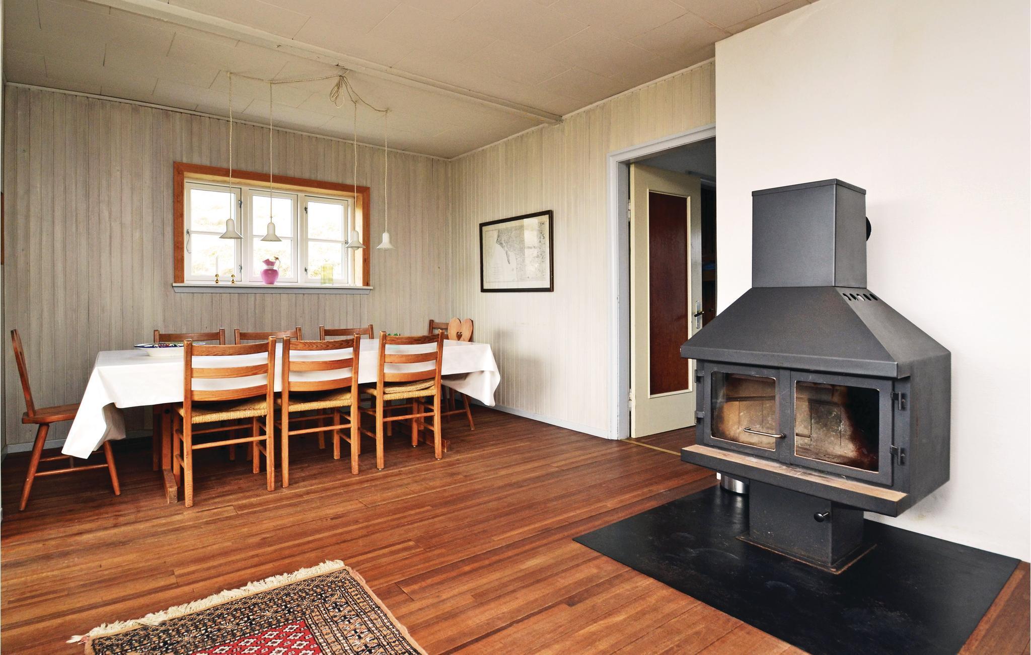 Indenfor finder I en rummelig stue med panoramavinduer, der giver direkte udsigt over klitlandskabet. Slap af, slap af på den komfortable sofa og nyd det naturlige lys, der overbader rummet. Det tilstødende køkken fungerer også som et gennemgangsrum og tilbyder de nødvendige faciliteter til at tilberede jeres måltider. Spiseområdet lægger op til hyggelige timer med familie eller venner.