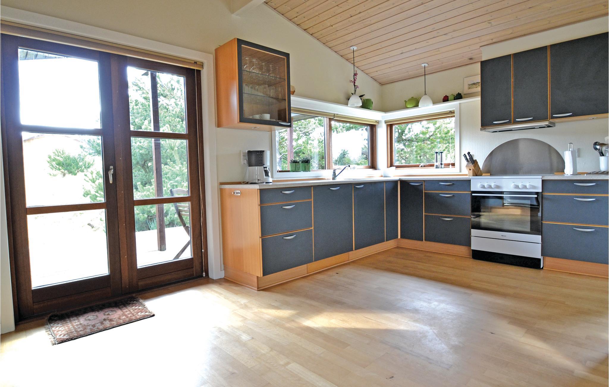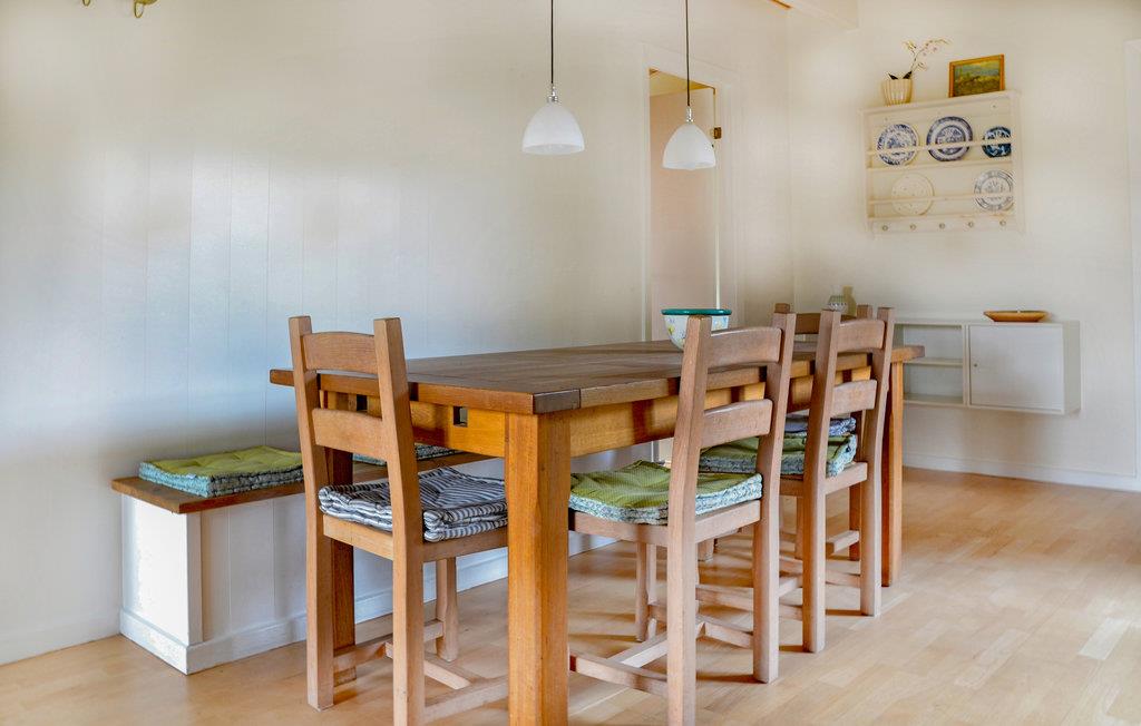 Det er arkitekttegnet med mange spændende detaljer, dvs. at der er tale om et velindrettet, veldisponeret og flot feriehus med plads til otte personer. Det indeholder fire gode soveværelser og to badeværelser, hvoraf det ene både har spabad og sauna. Det dejlige køkken/alrum ligger i forbindelse med en hyggelig stue med brændeovn.