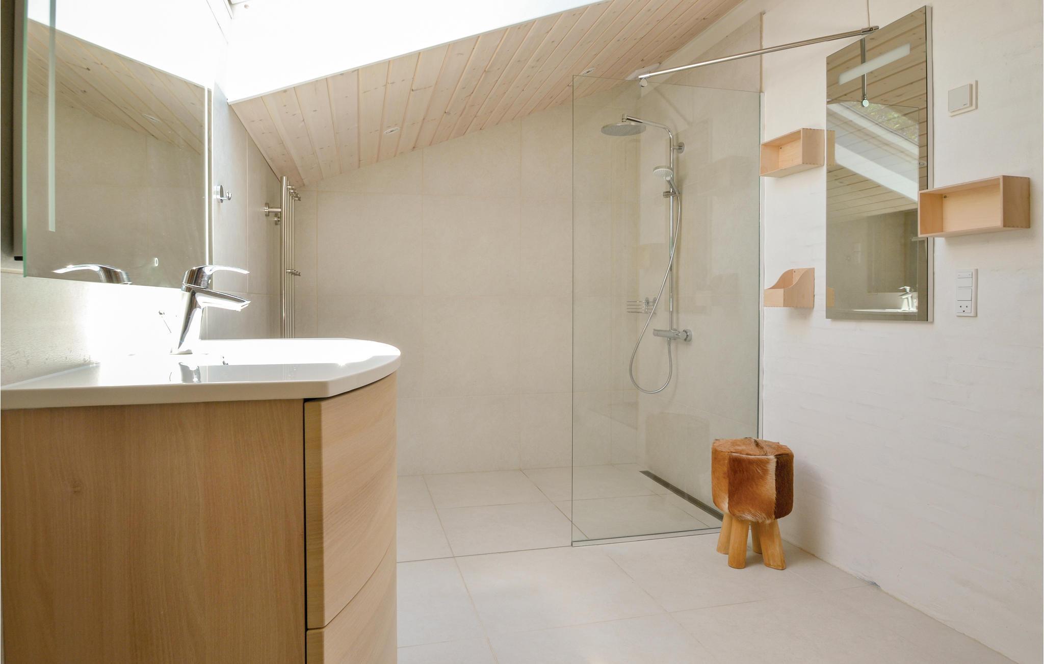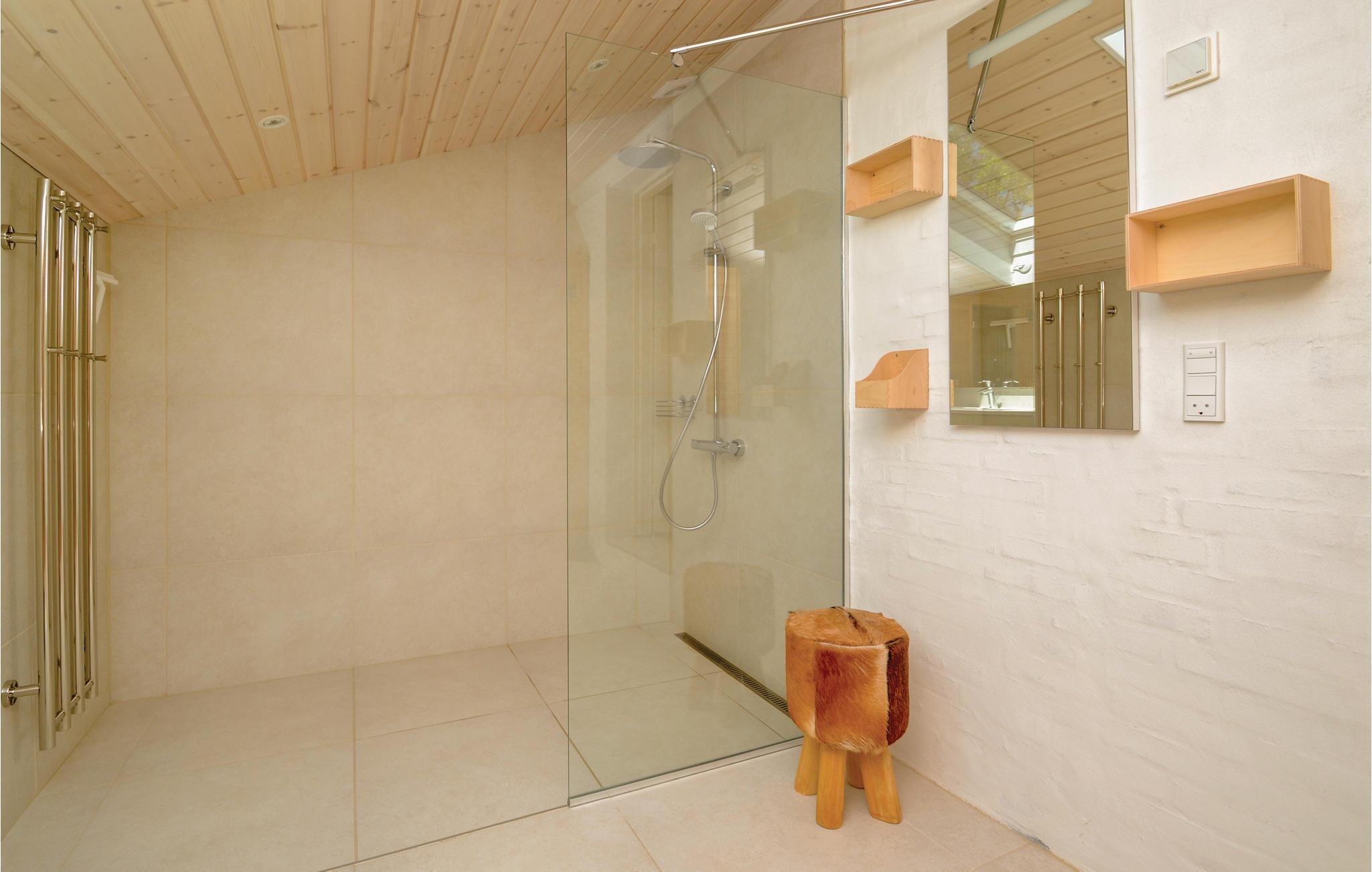 Her får I et velindrettet feriehus med pæne soveværelser som alle har adgang via den store stue. Stuen får sit gode lysindfald fra de store glaspartier i begge ender af huset. I den ene ende af huset er der udsigt til sø og grund fra sofaen, ligesom der er adgang til en dejlig træterrasse. Terrassen kan skærmes af ved behov, og skaber dermed en perfekt privat hyggekrog til mange gode timers samvær.