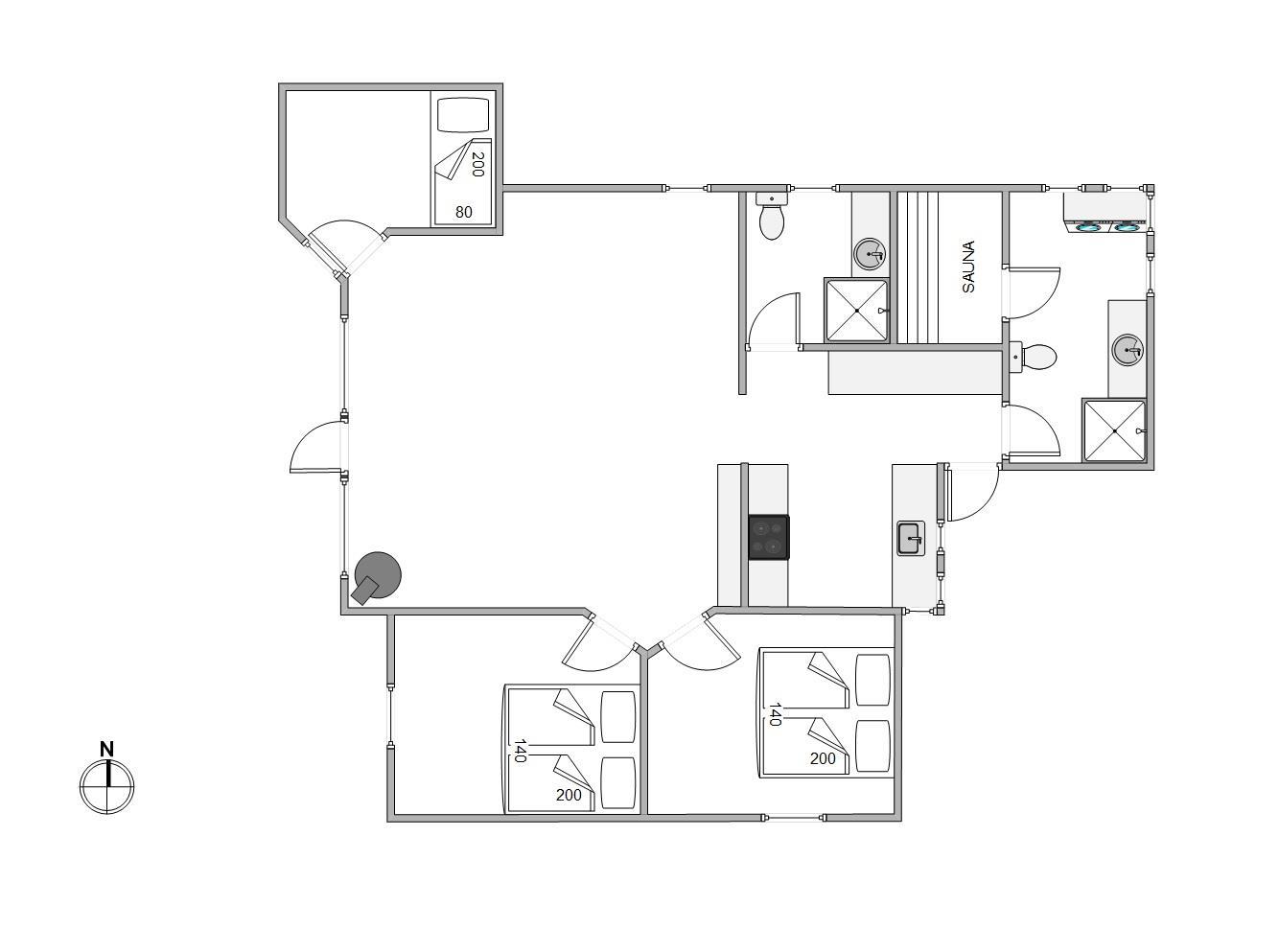 Der er hele 2 badeværelser i sommerhuset. I det største finder I desuden vaskemaskine, tørretumbler og en sauna, hvor I kan forkæle jer selv med varme og velvære.