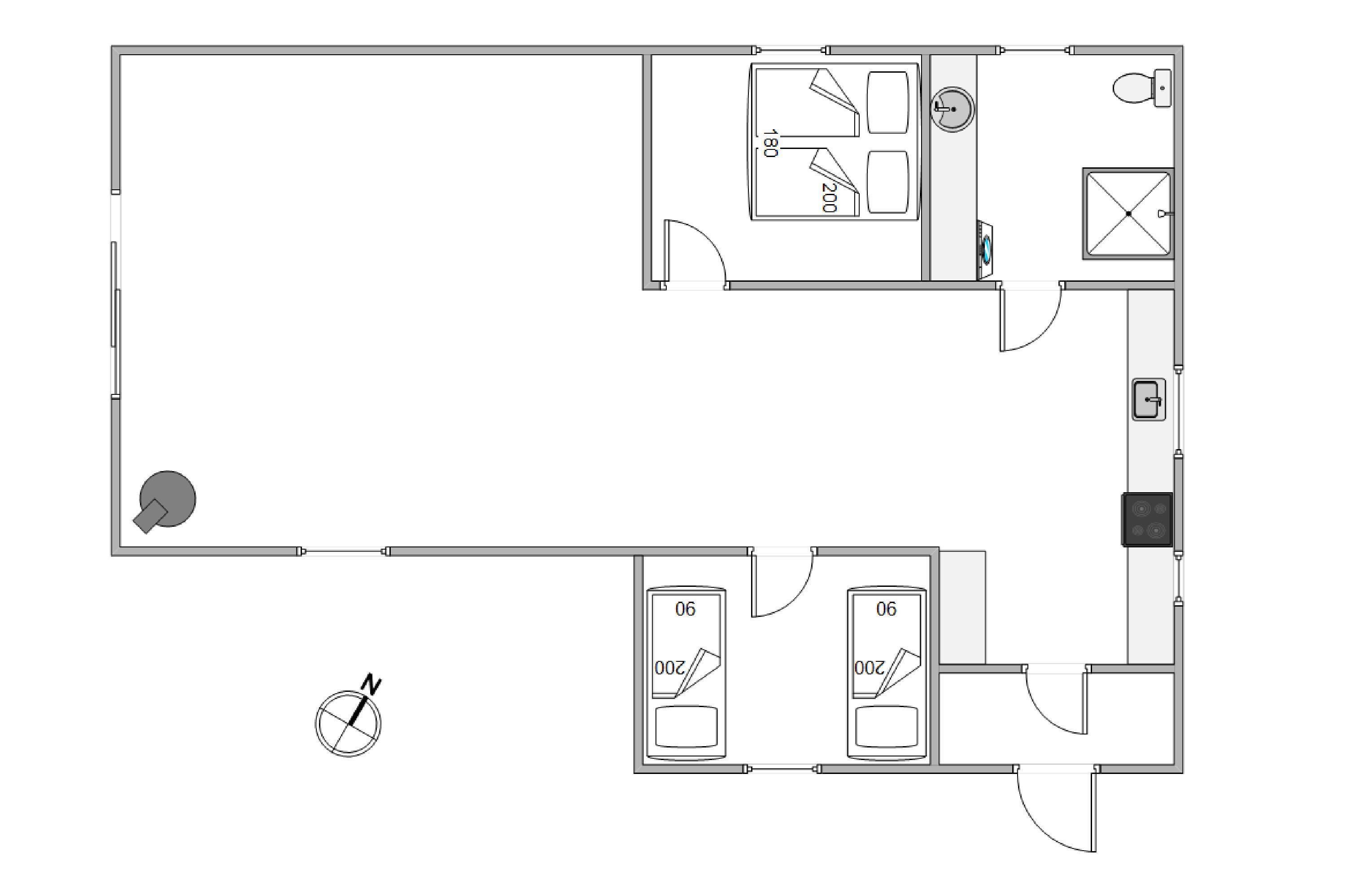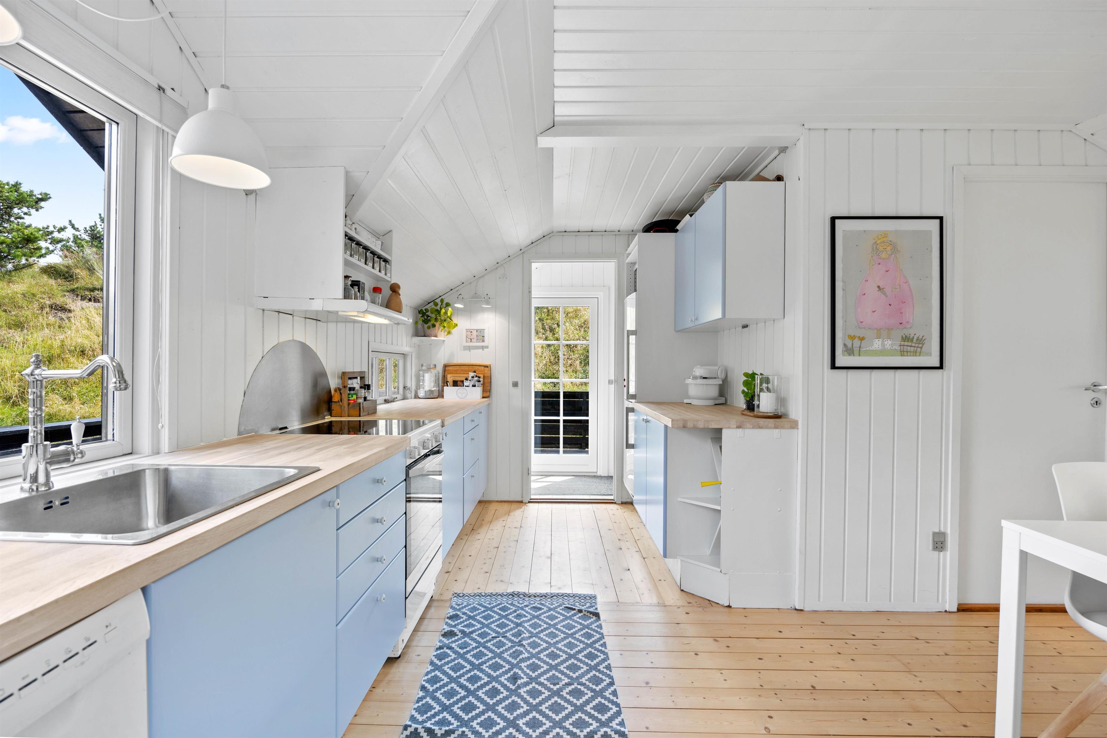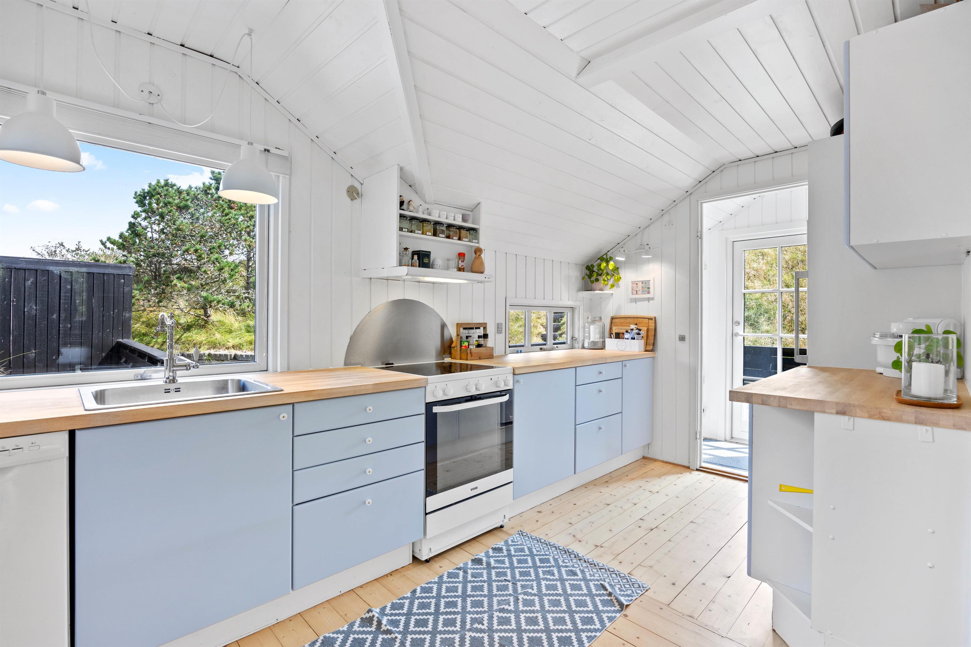 Det komfortabelt indrettede køkken har alle de faciliteter, du har brug for i ferien, herunder mikrobølgeovn, induktionskogeplade og opvaskemaskine. Det store spisebord lige ved siden af køkkenet indbyder til mange hyggelige timer sammen. Som prikken over i'et er der en brændeovn i stuen og en energibesparende varmepumpe til køligere dage.