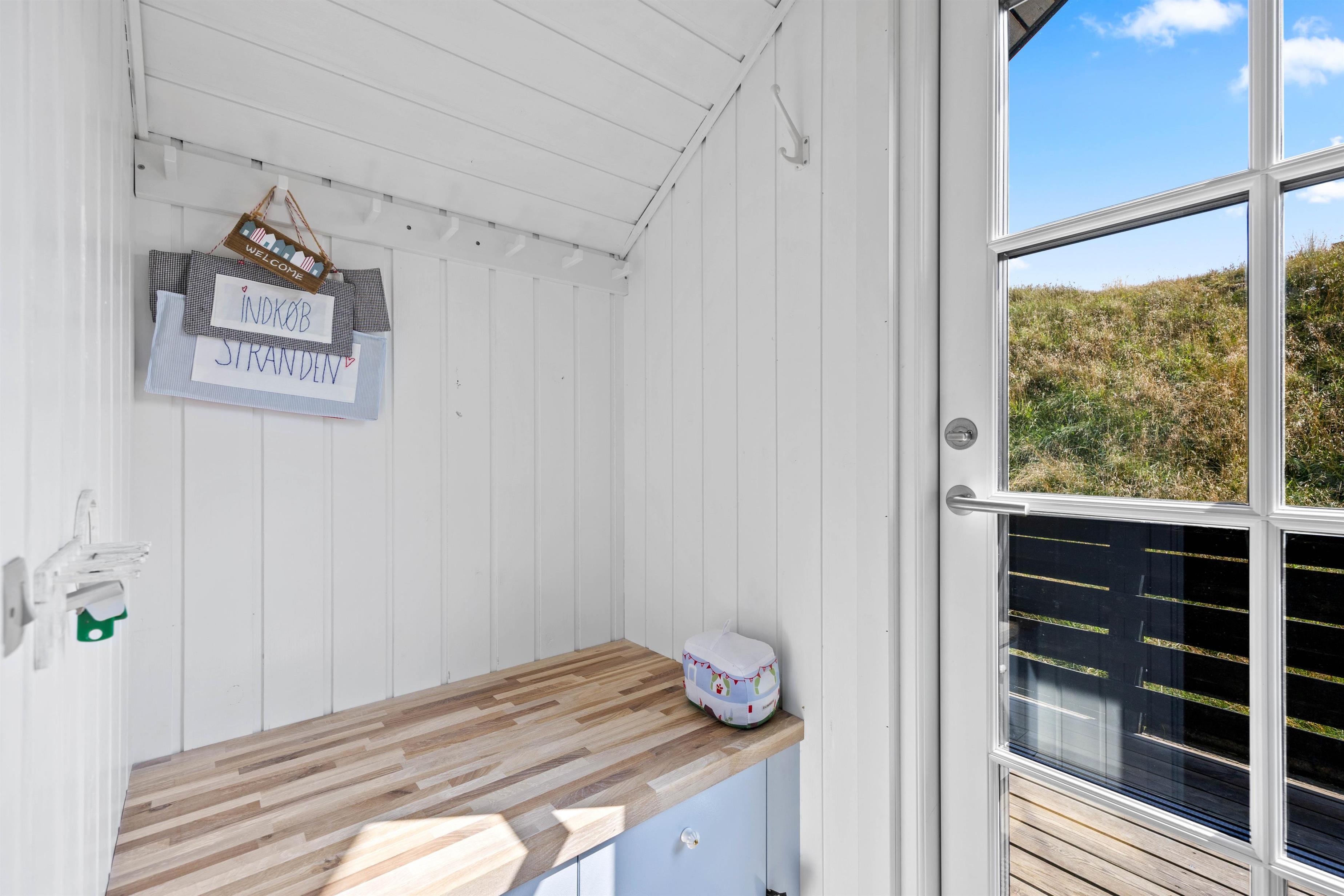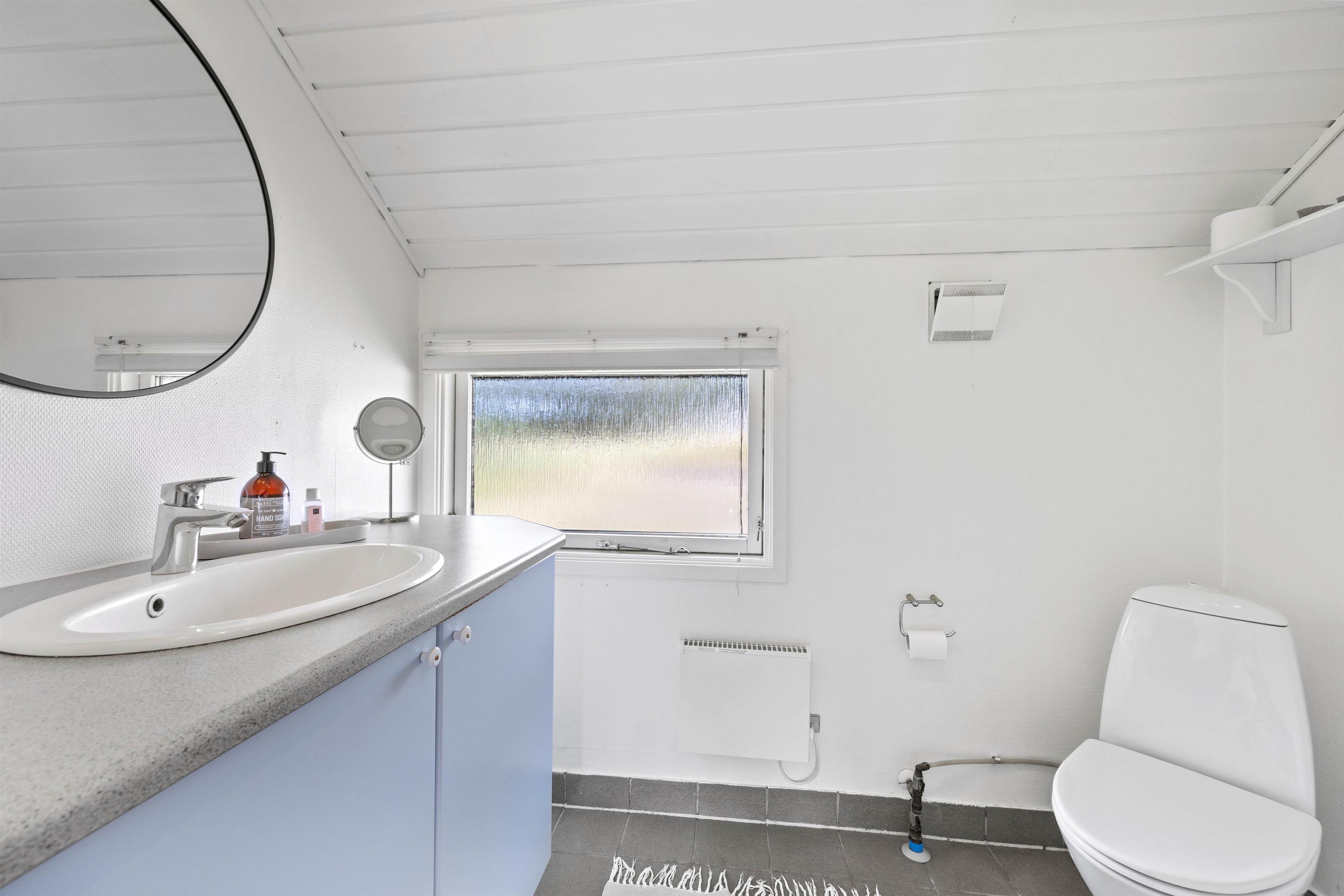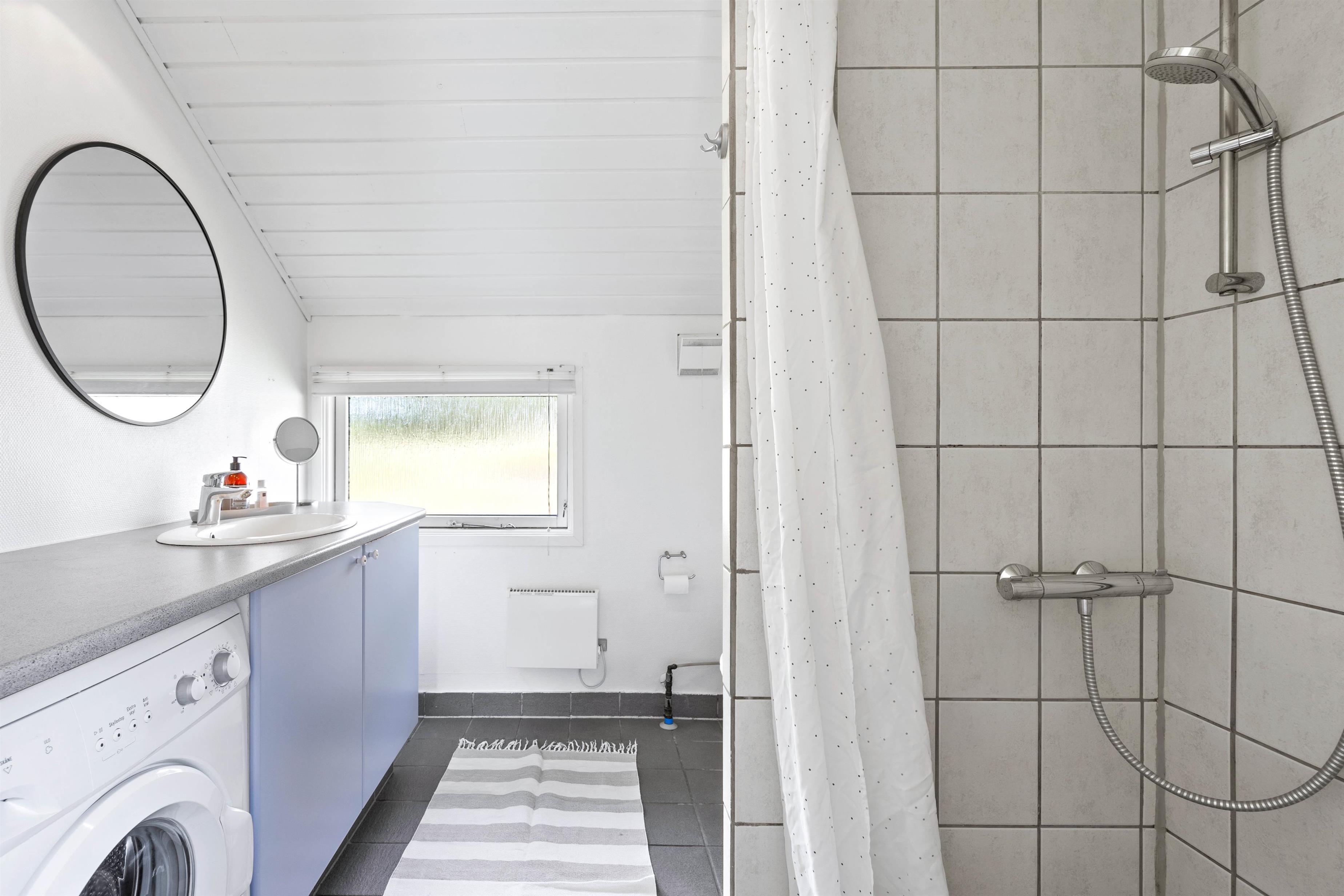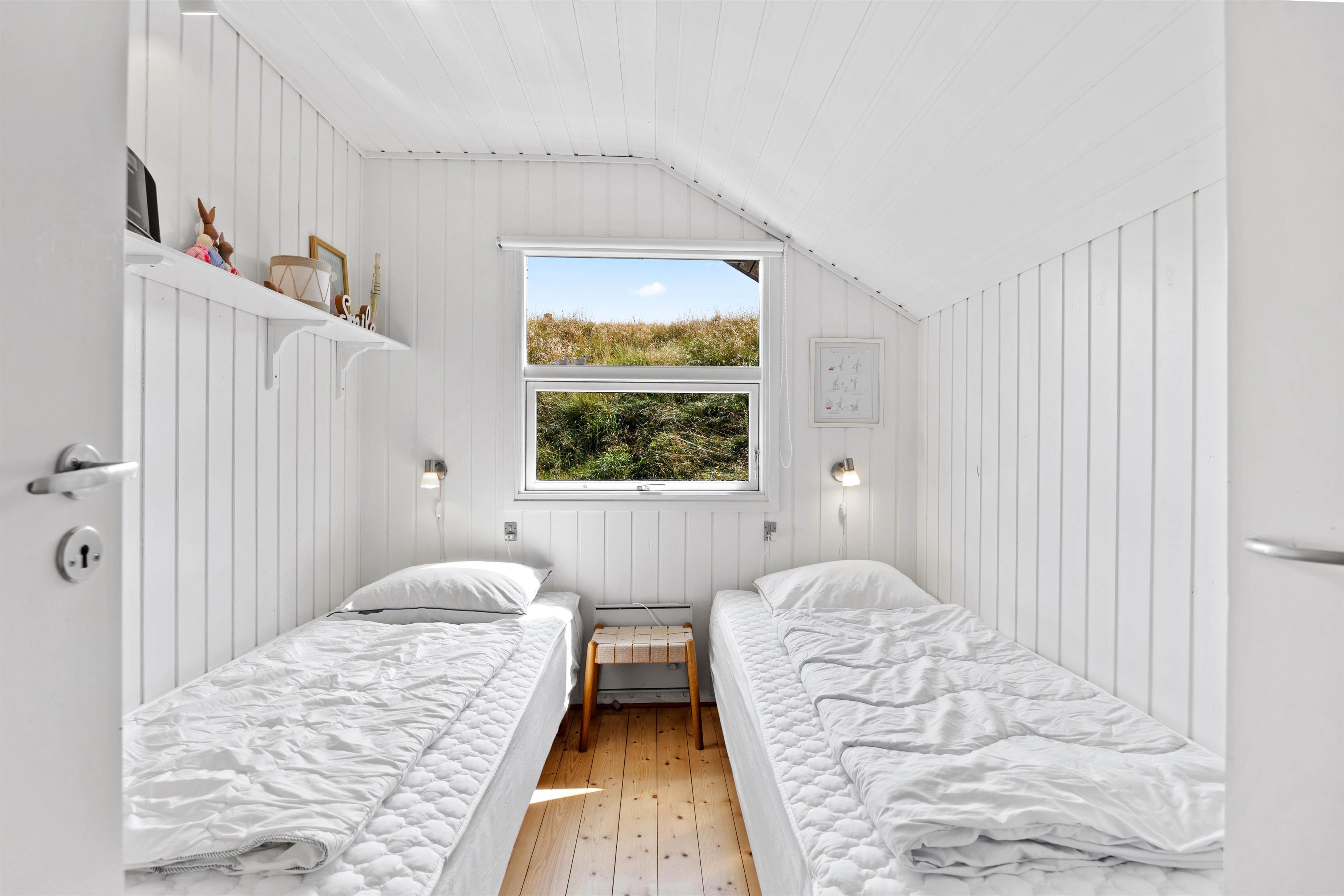 De lyse trævægge og -lofter går også igen i det lyse badeværelse, hvor der også er gulvvarme. Efter en lang dag i den friske luft kan I glæde jer til at komme i seng og få en god nats søvn. I det ene soveværelse er der en stor, komfortabel dobbeltseng. Det andet soveværelse har 2 enkeltsenge. Læg mærke til, at den friske vesterhavsluft gør noget godt for nattesøvnen.