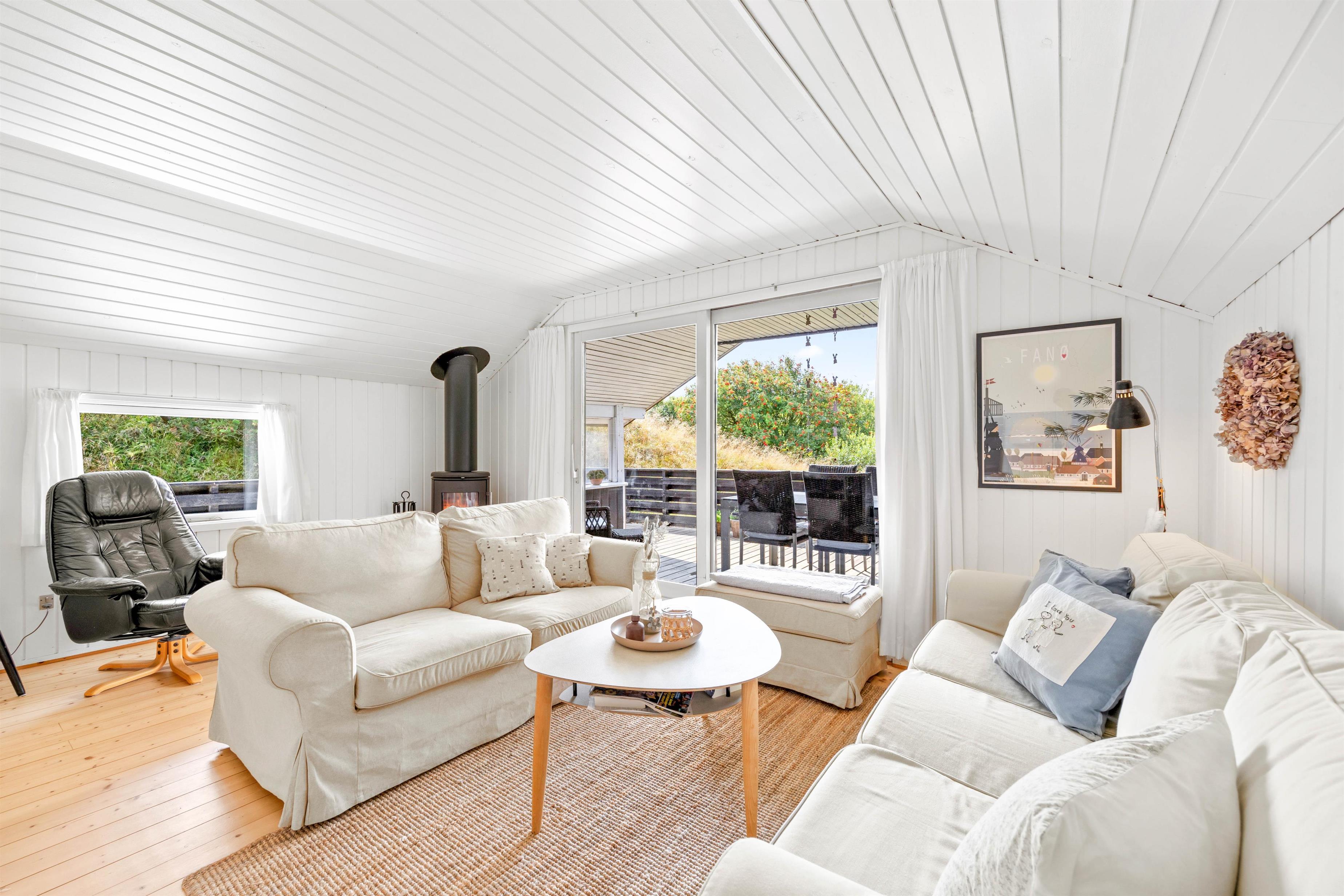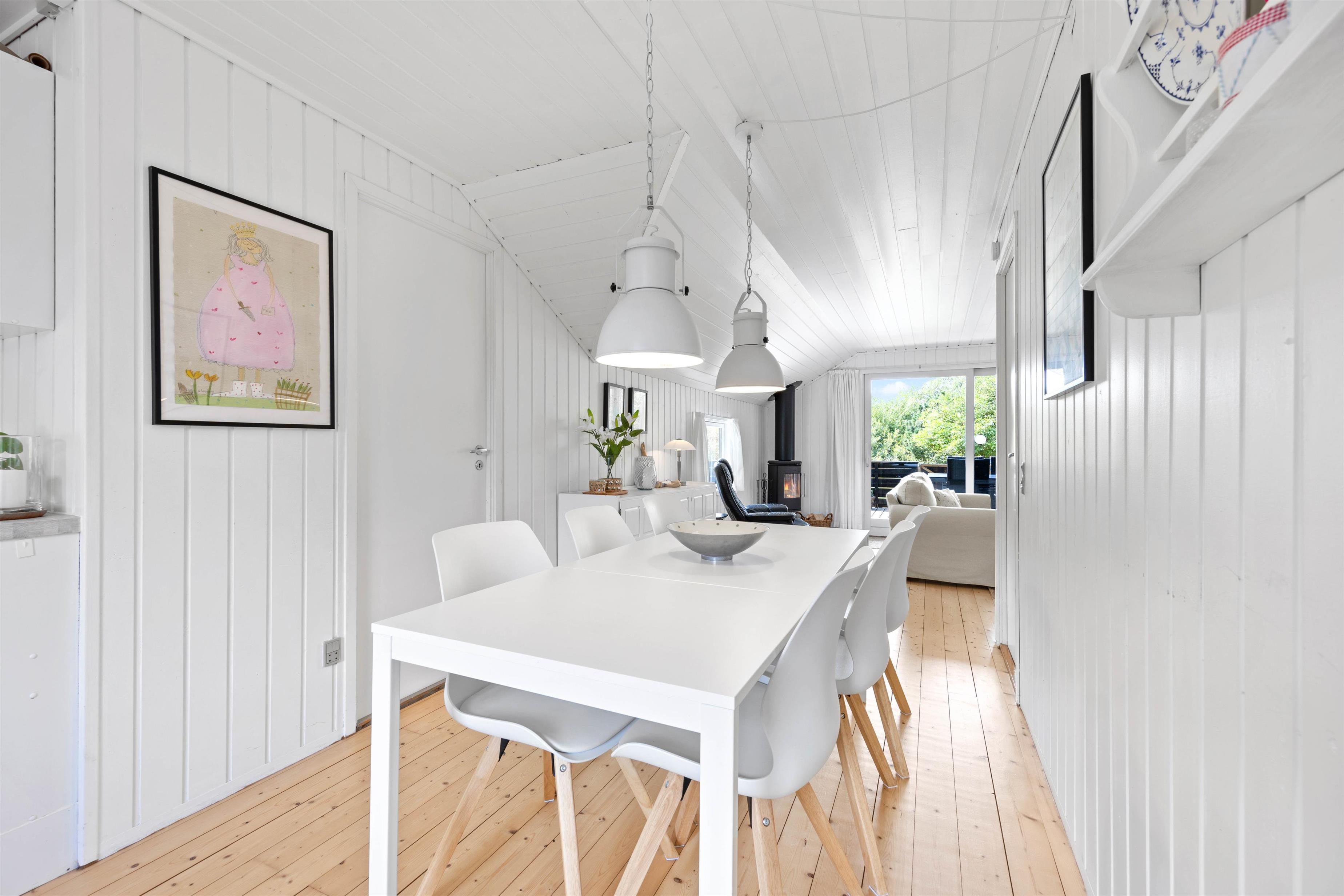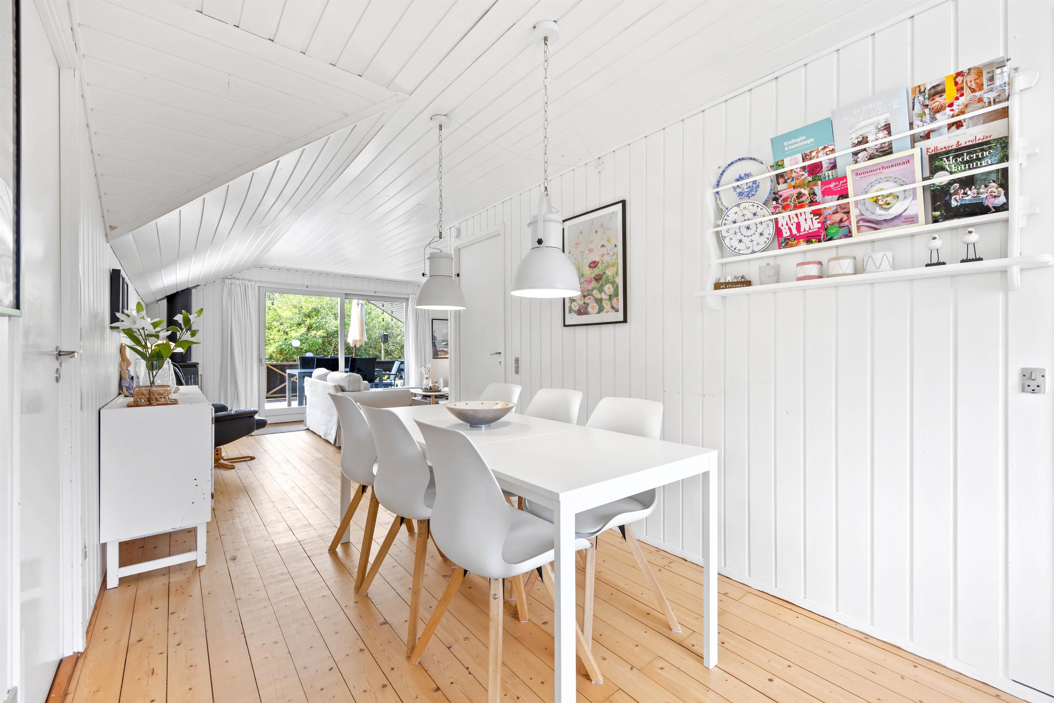 Så snart du træder ind i sommerhuset, vil du mærke feriestemningen. Omdrejningspunktet i det smagfuldt indrettede sommerhus er det hyggelige og lyse opholdsrum, hvor stue, køkken og spisestue er samlet i ét rum. De lyse trævægge og -lofter i hele sommerhuset giver en lys og venlig stemning. Alle kan få sit eget yndlingshjørne i det harmoniske opholdsrum. Uanset hvor, man befinder sig, føler man sig tæt på naturen.