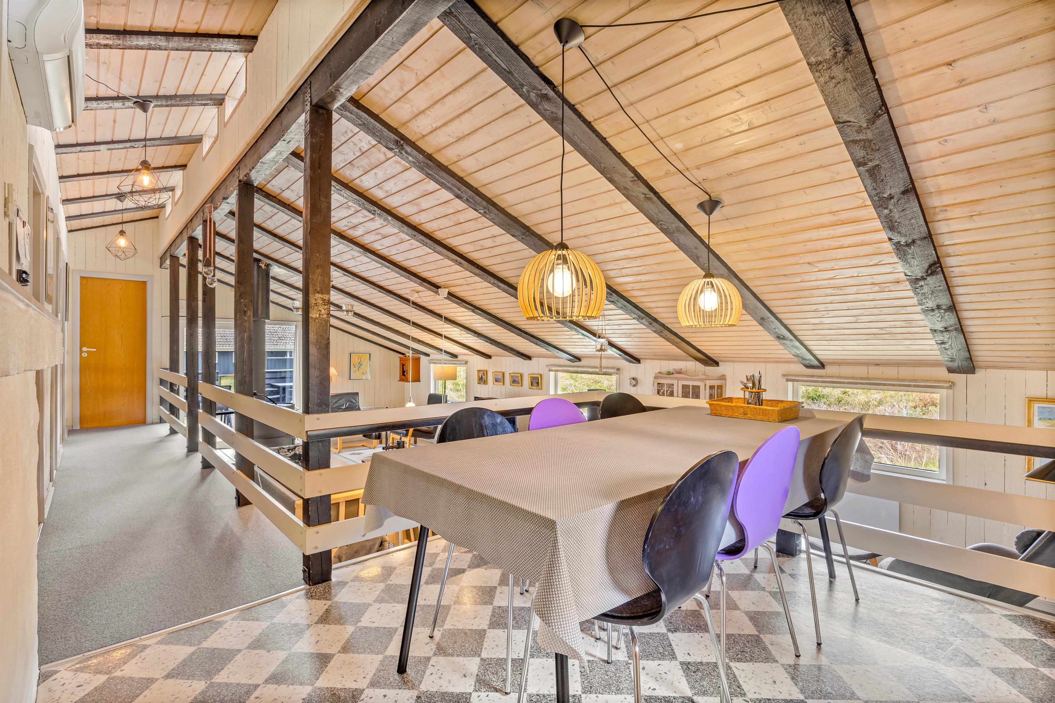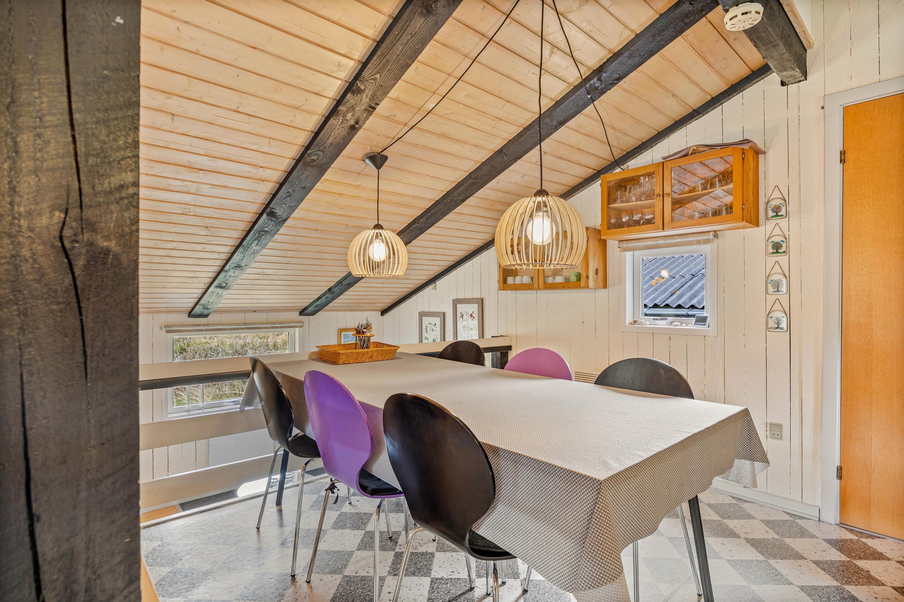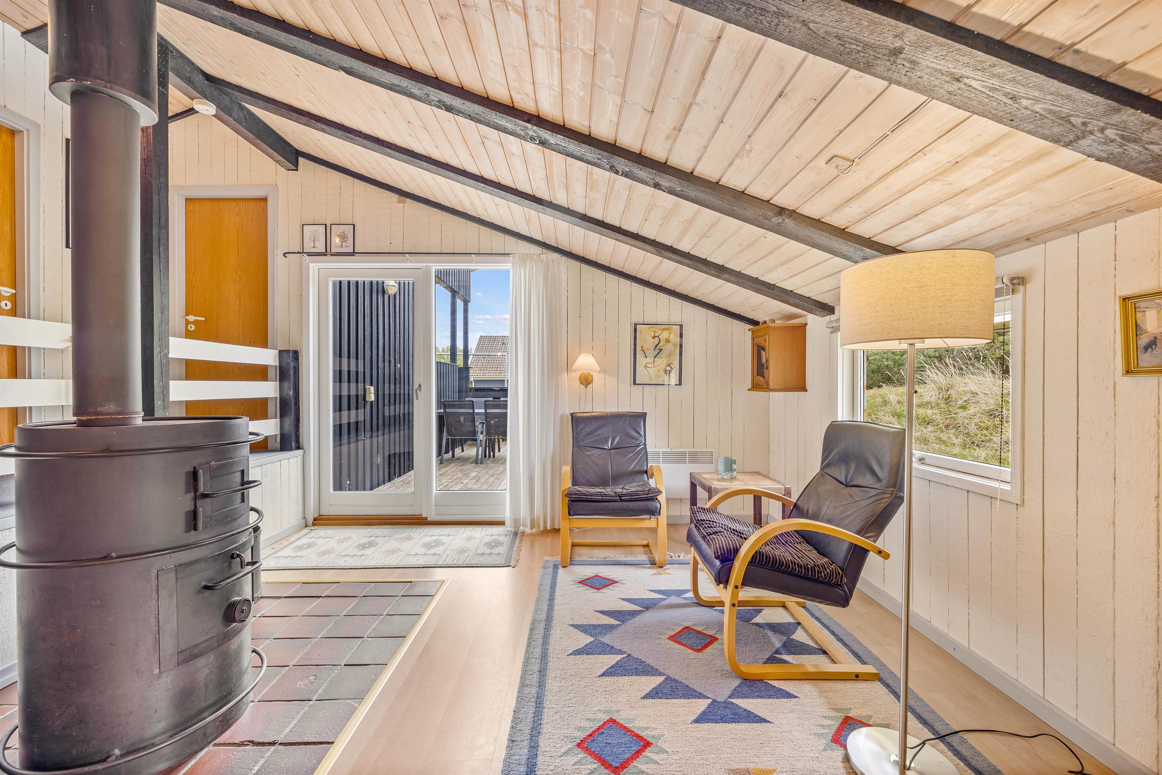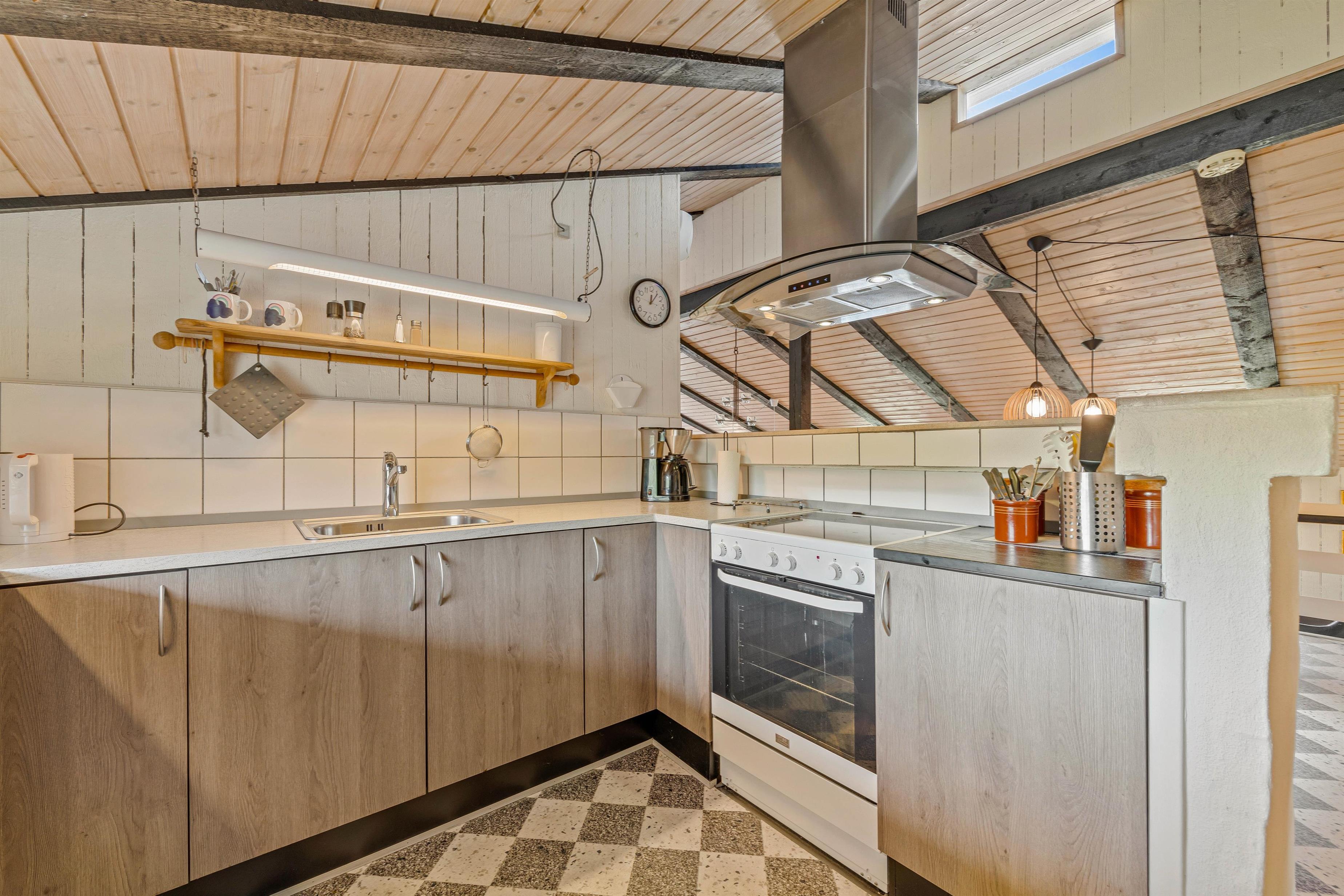 Feriehuset emmer af ren hygge og velvære for hele familien - her kan I virkelig slappe af og nyde jeres ferie i fulde drag. Det funktionelle køkken, som er udstyret med mikrobølgeovn og opvaskemaskine, byder på rig mulighed for at tilberede lækre måltider af lokale råvarer. Køkkenet som ligger i åben forbindelse til spisepladsen, har kik ned til stuen der er nedsunket fra resten af feriehuset. Her hyggeligt indrettet med komfortable møbler og fjernsyn, så I kan sætte jer til rette og se en god film om aftenen. Som prikken over i’et er der her også brændeovn, der sørger for rigtig hygge stemning.