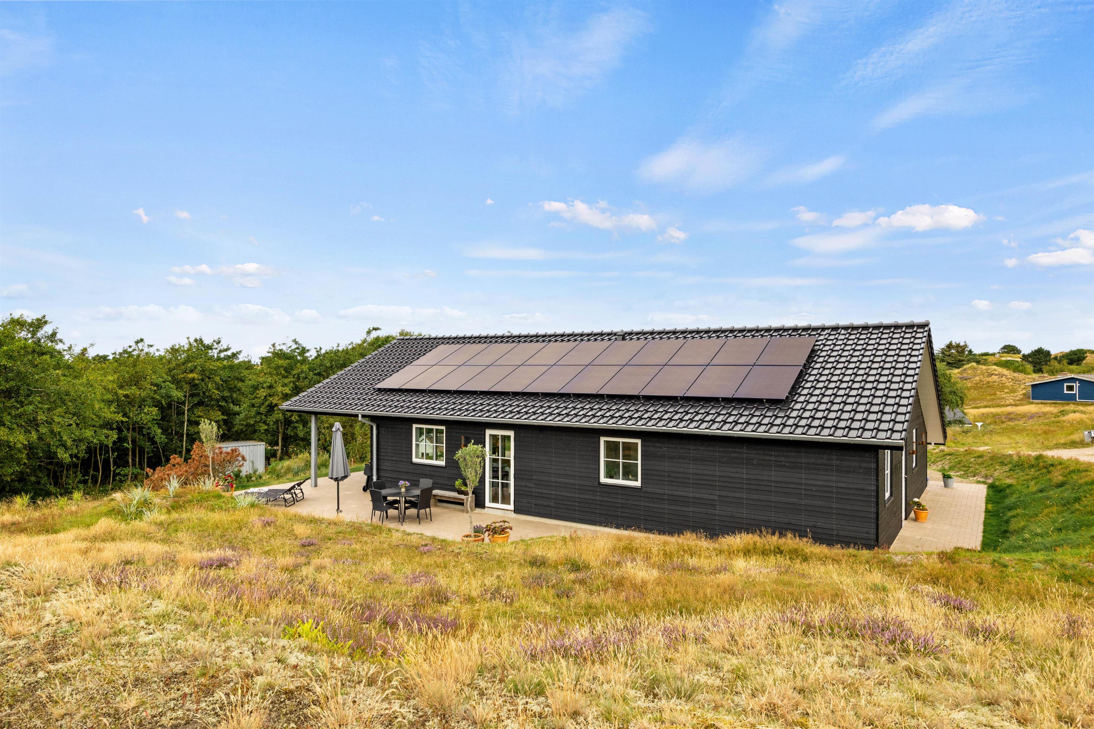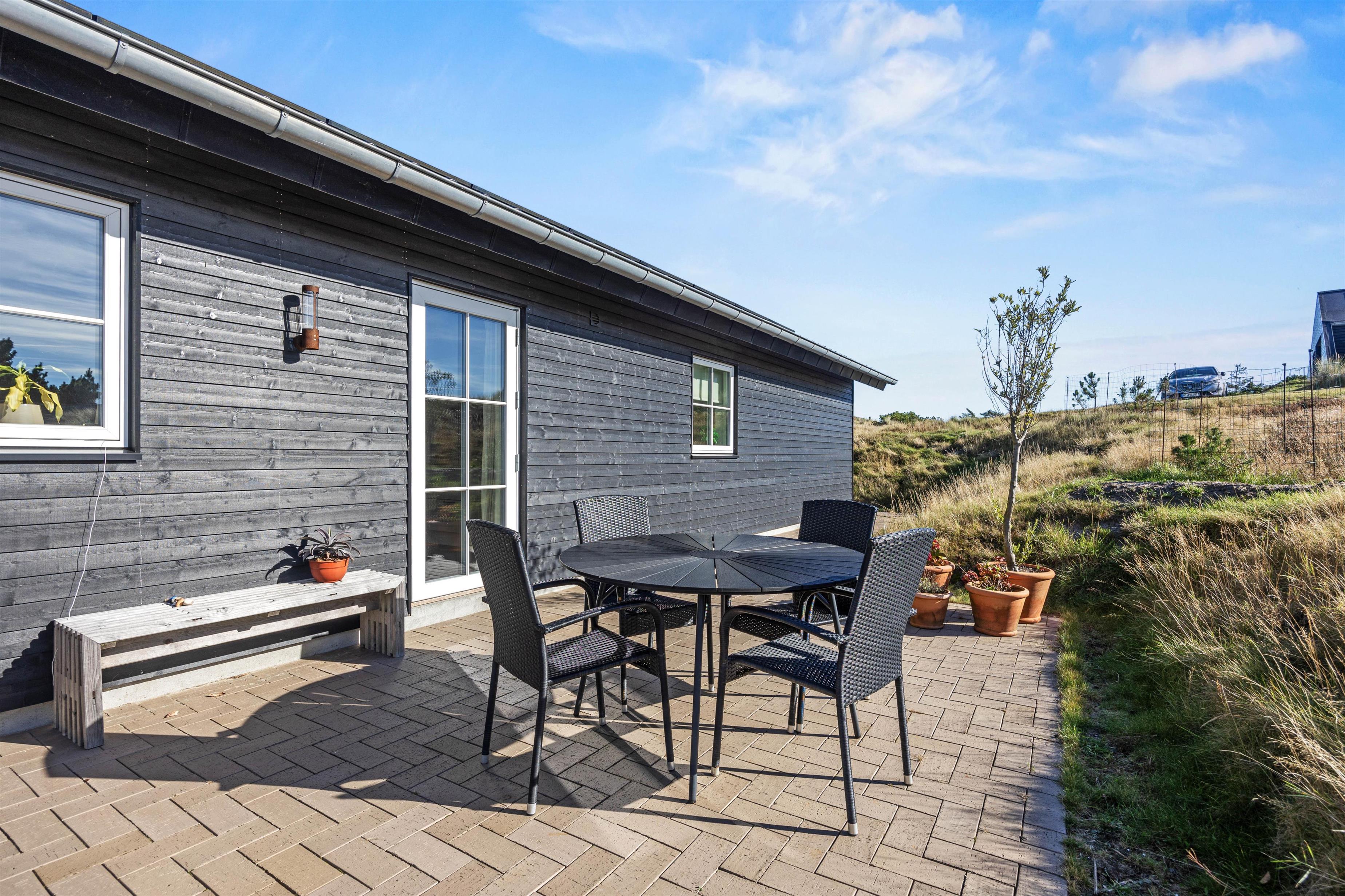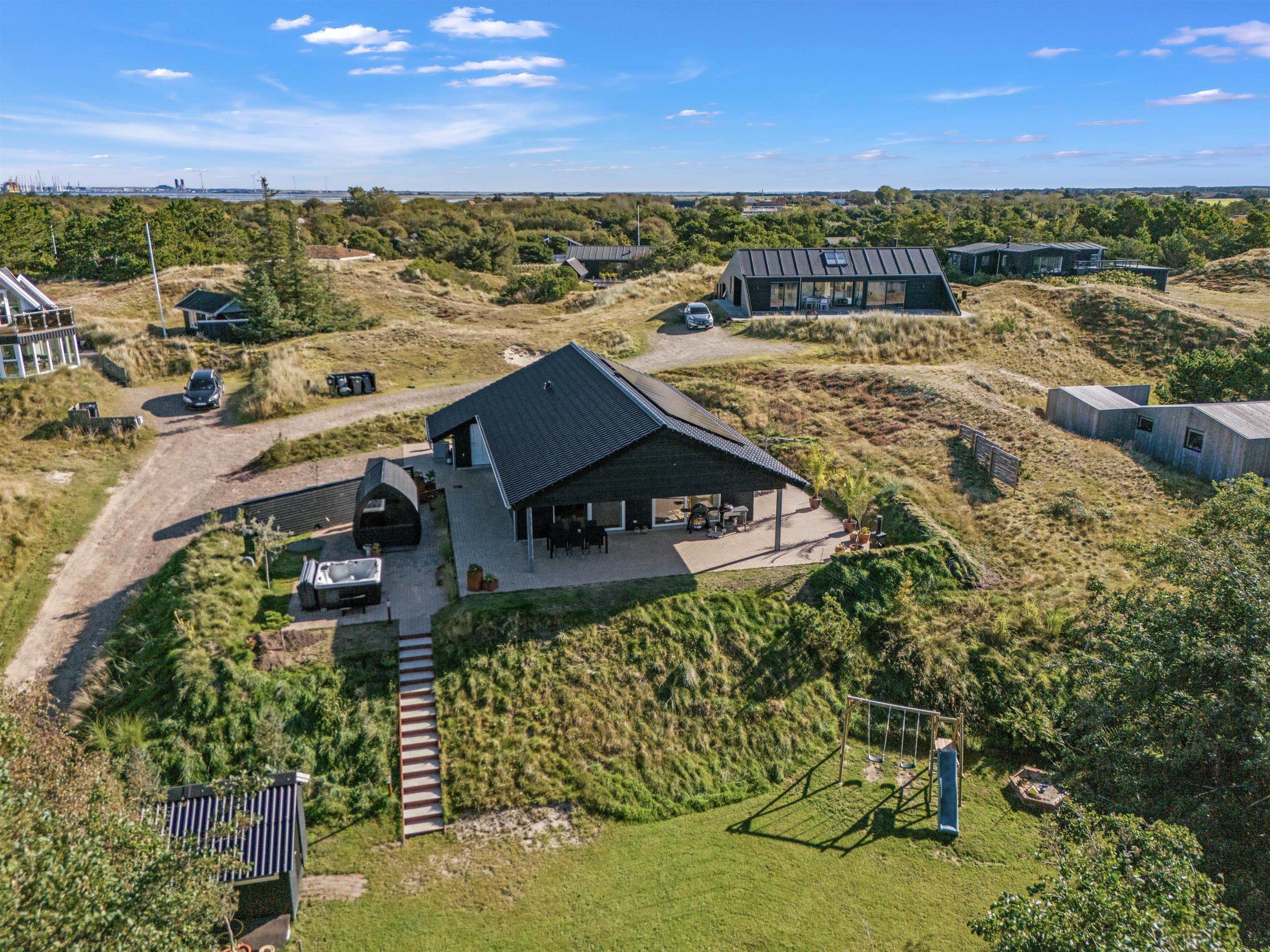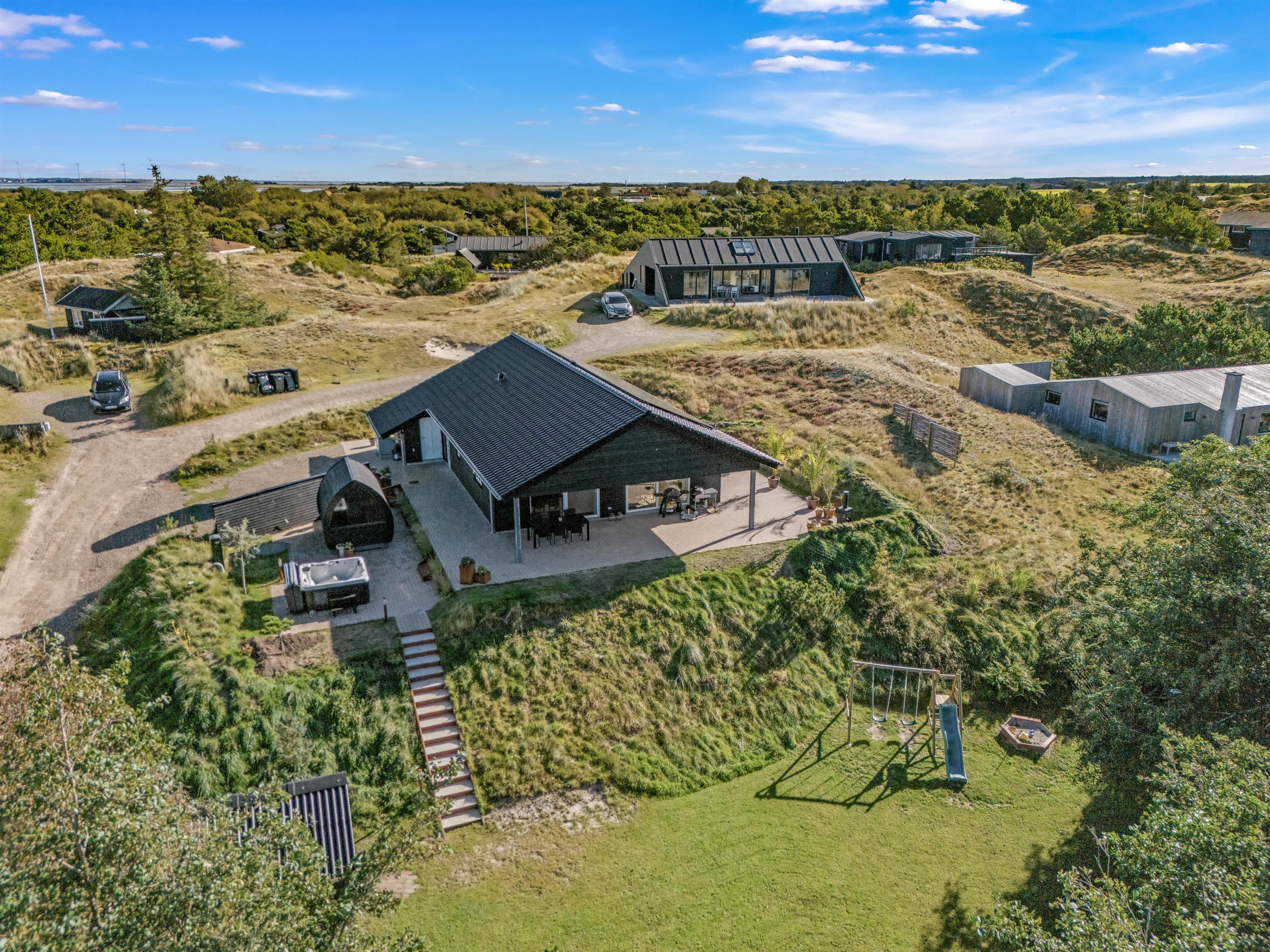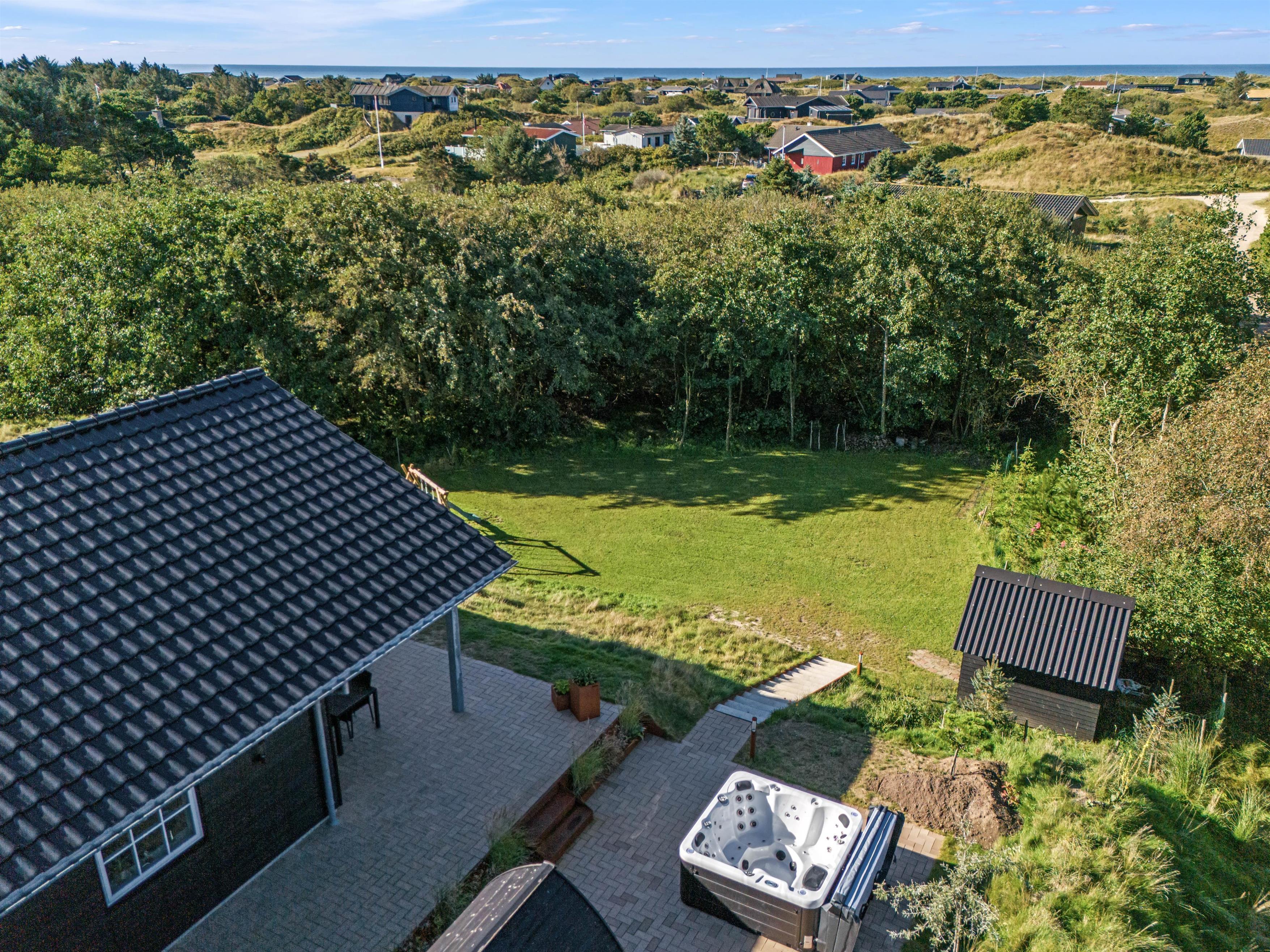 Udeområdet byder på en skøn terrasse rundt om feriehuset, hvor der både er et åbent og et overdækket afsnit. Den skønne naturgrund ligger på en bakketop med skøn udsigt til store vidder med lyngklædt hede og bølgende klitlandskab. Her kan I dase i havemøbler og solvogne og grille, mens solen går ned, og naturligvis nyde livet i den varme udespa til 6 personer.
