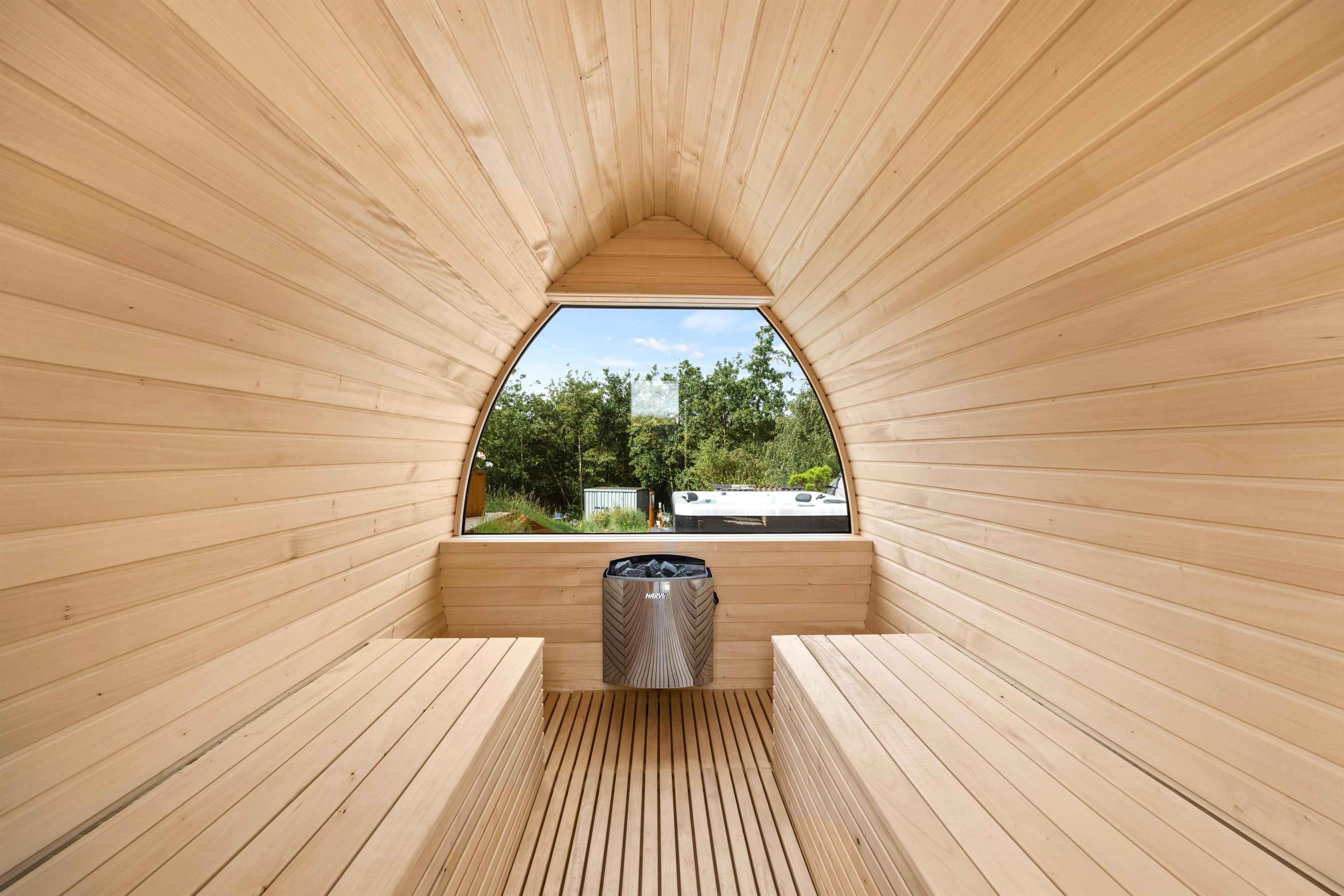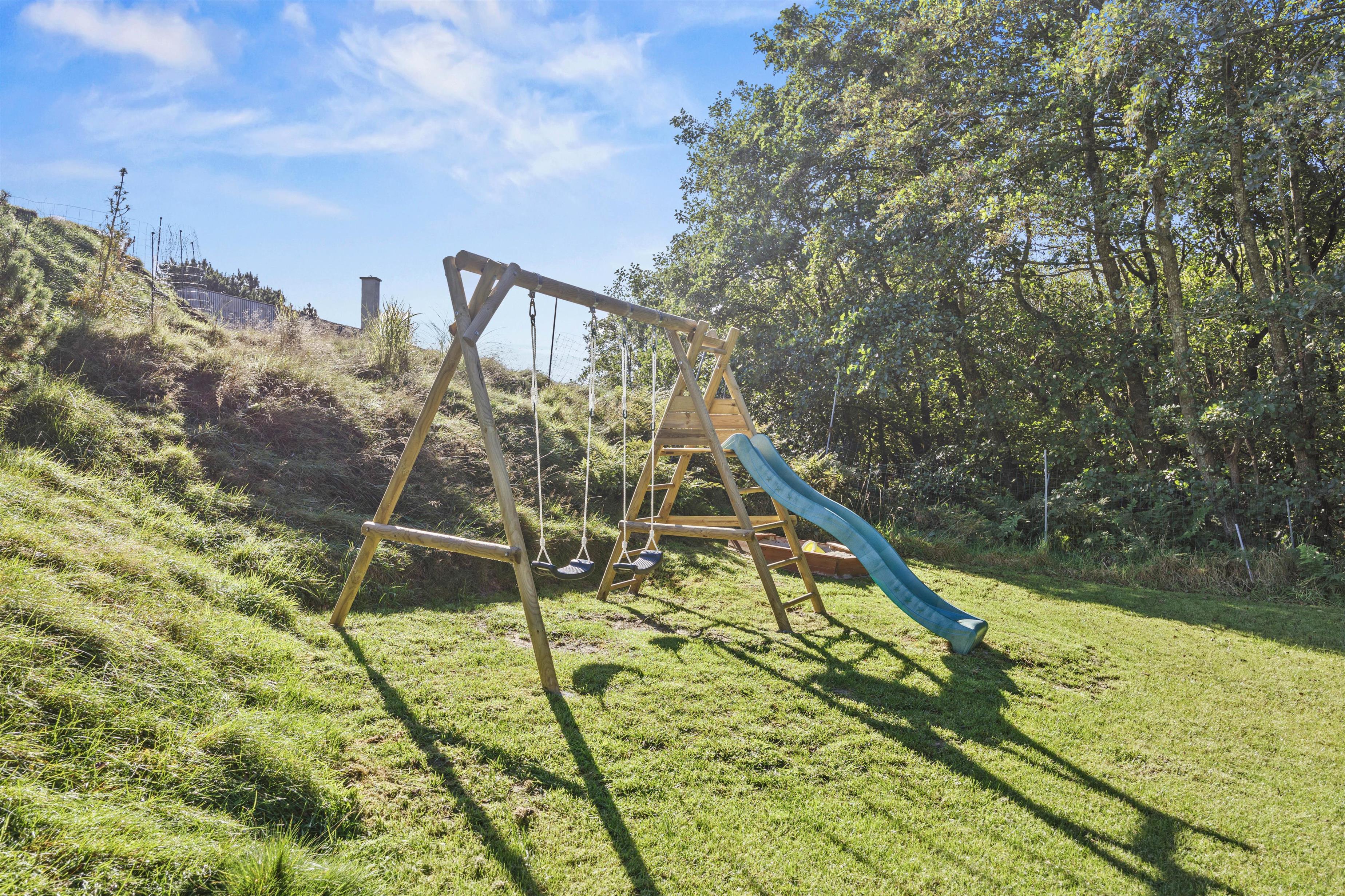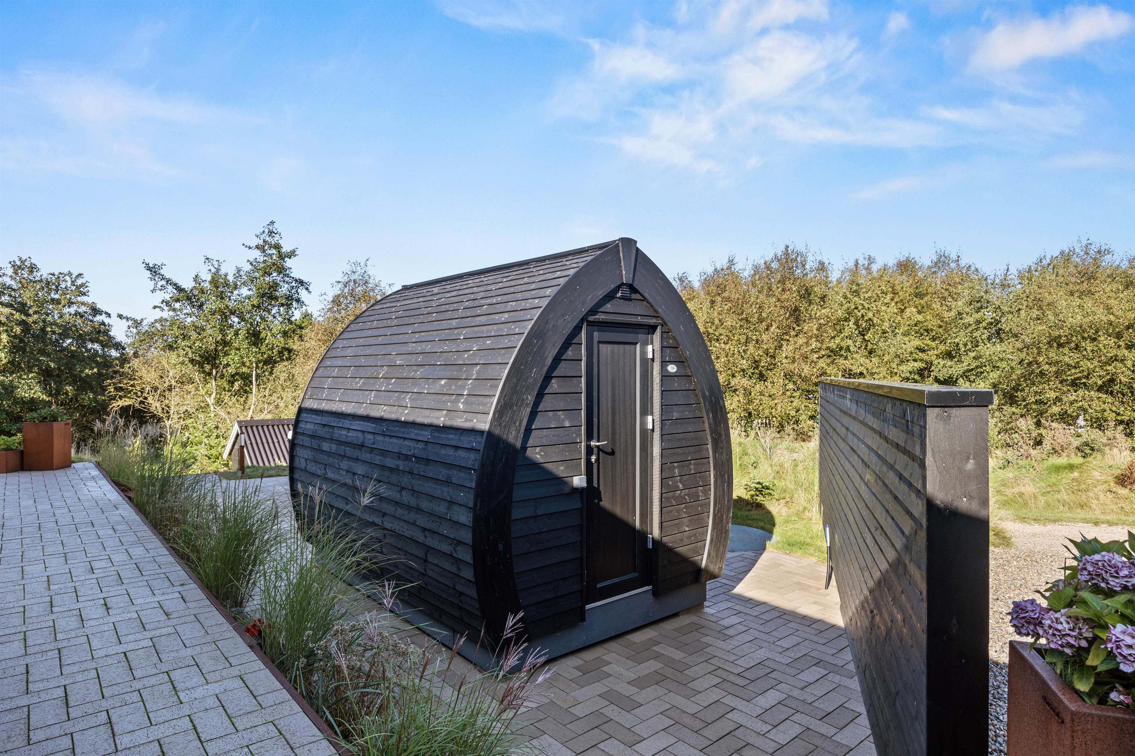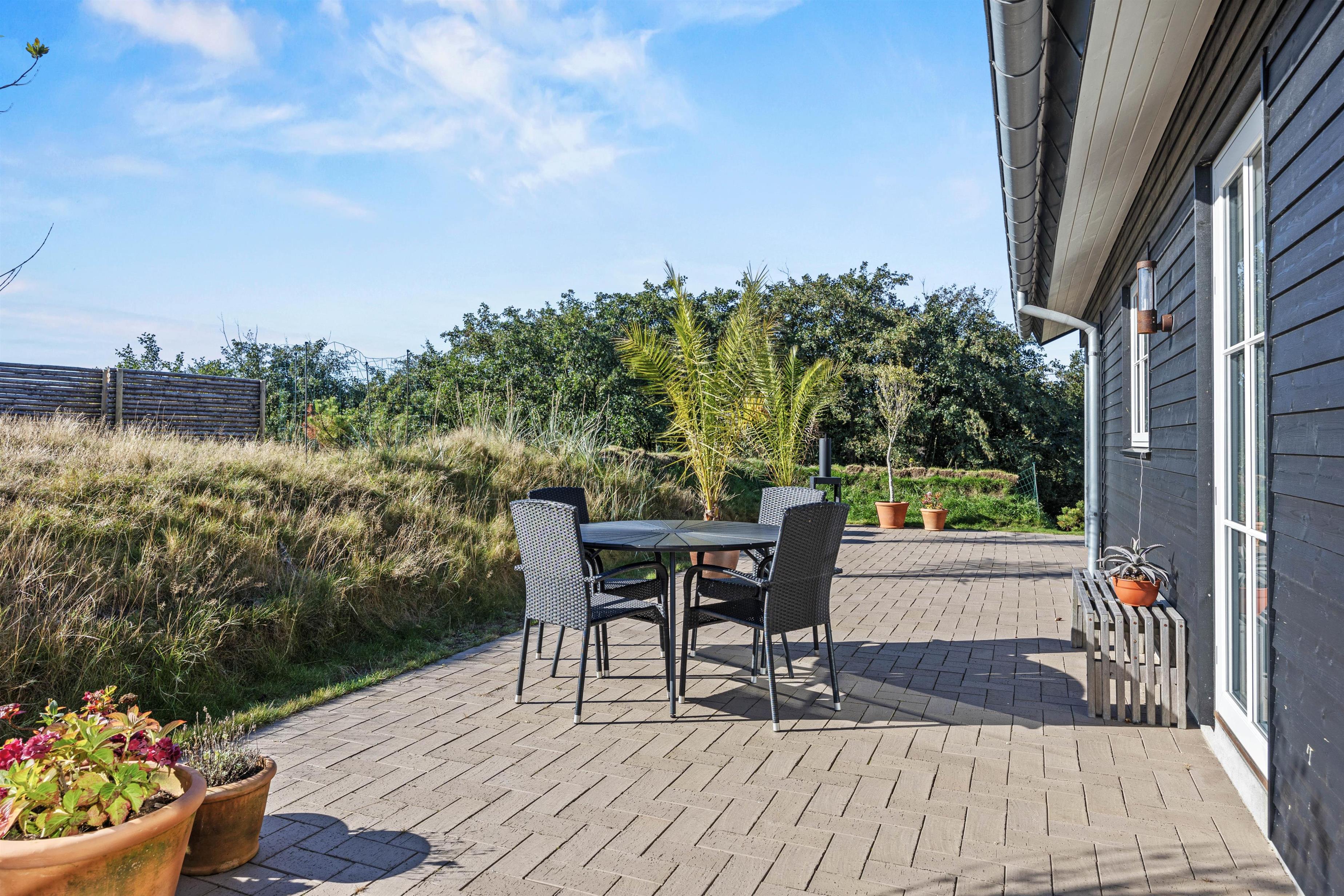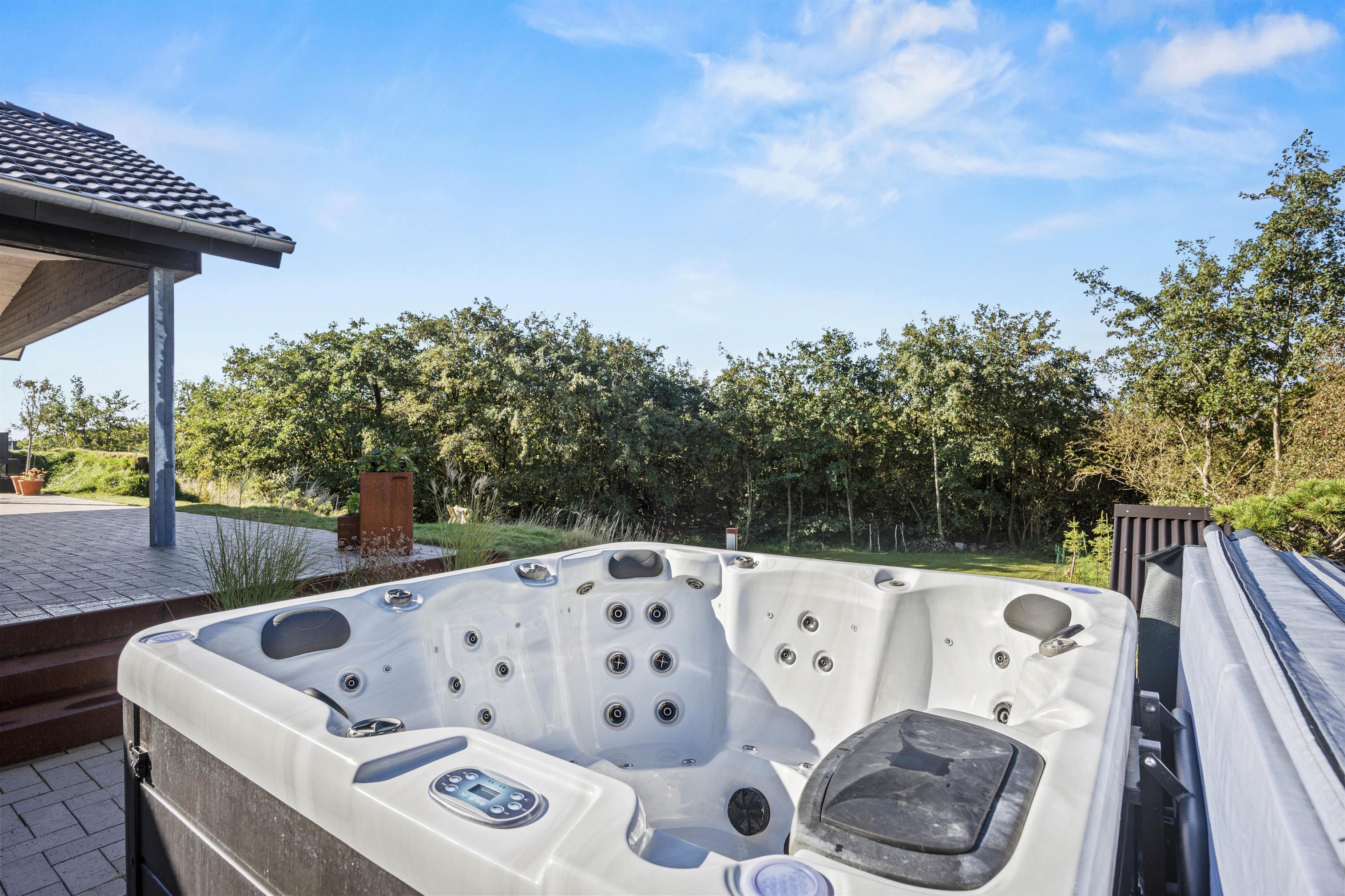 Udeområdet byder på en skøn terrasse rundt om feriehuset, hvor der både er et åbent og et overdækket afsnit. Den skønne naturgrund ligger på en bakketop med skøn udsigt til store vidder med lyngklædt hede og bølgende klitlandskab. Her kan I dase i havemøbler og solvogne og grille, mens solen går ned, og naturligvis nyde livet i den varme udespa til 6 personer.