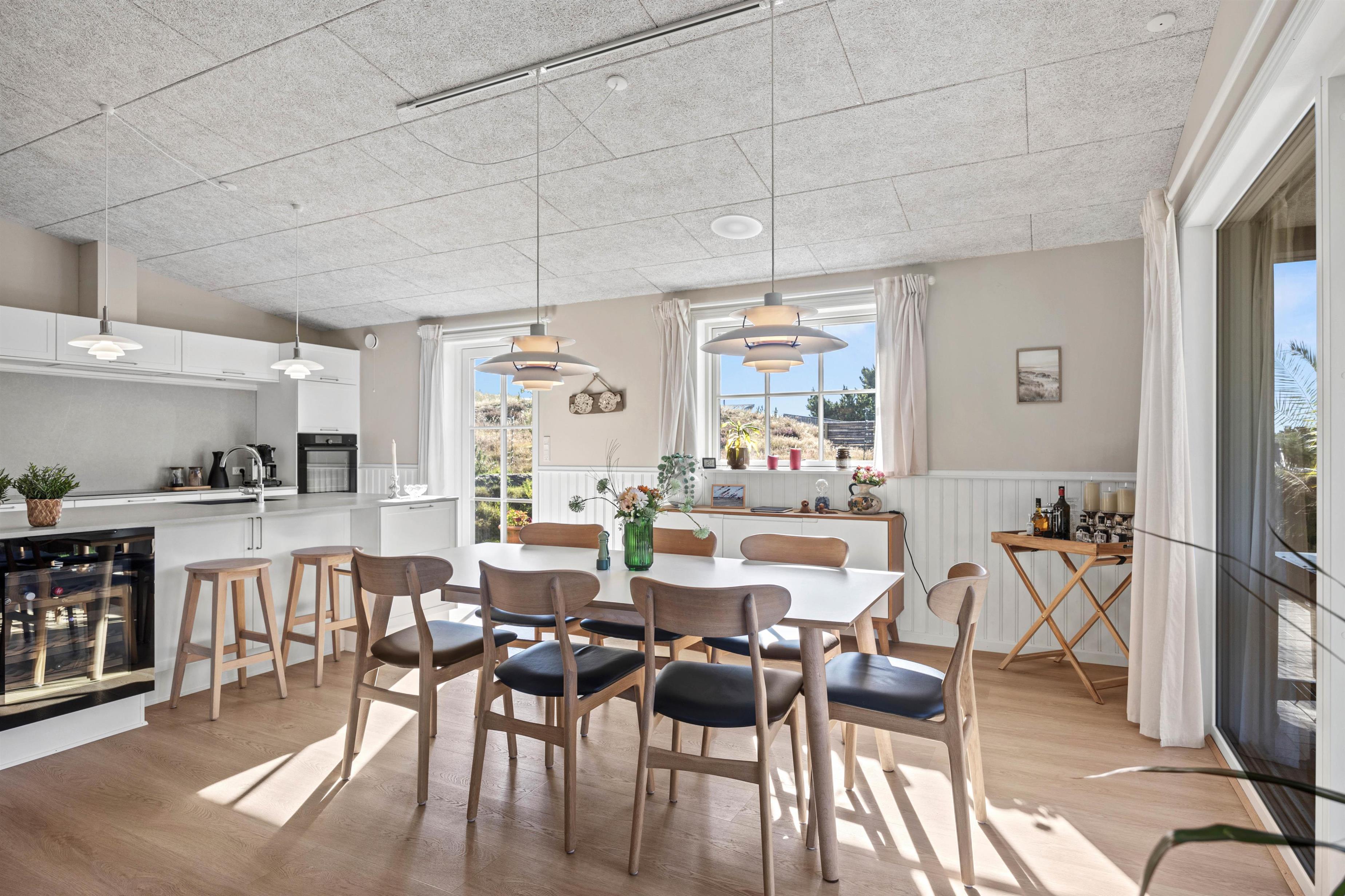 Det hyggelige køkken og alrum danner rammen for den perfekte feriehygge og aktiviteter, I kan lave sammen. Om det nu er tilberedning af lækker mad, hygge med spil, læsning eller en god film på tv. Køkkenet har opvaskemaskine, køleskab, induktion med ovn og en separat 60 liters fryser. Desuden er der både vaskemaskine og tørretumbler til rådighed.