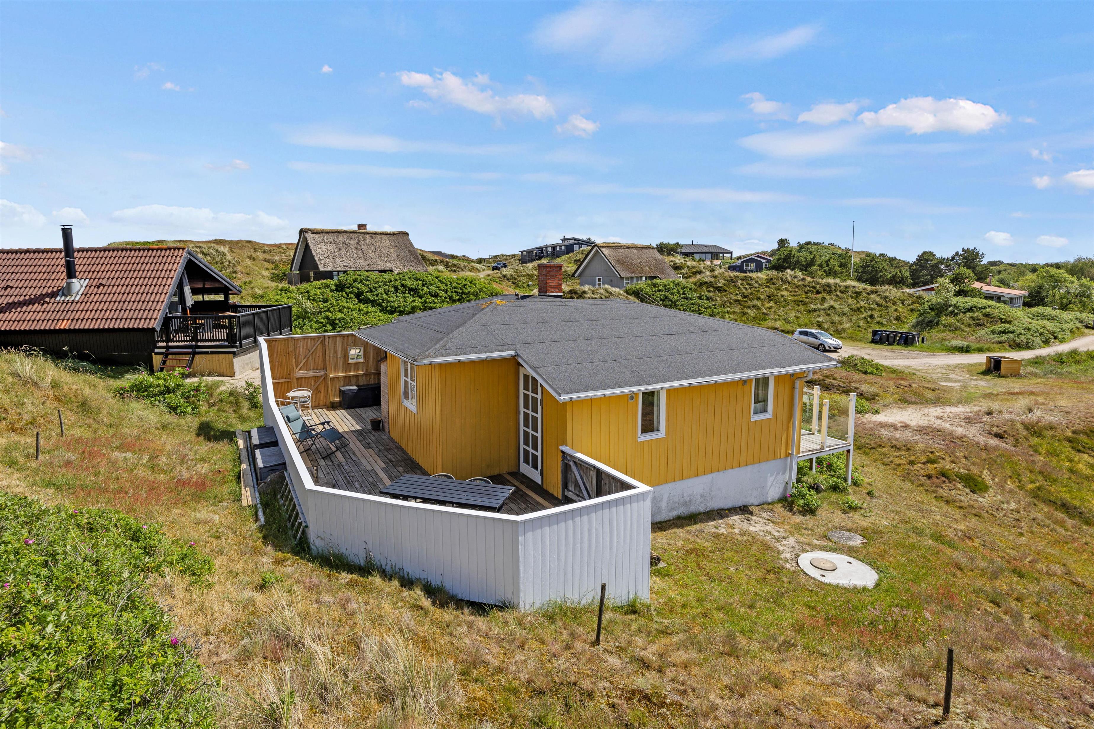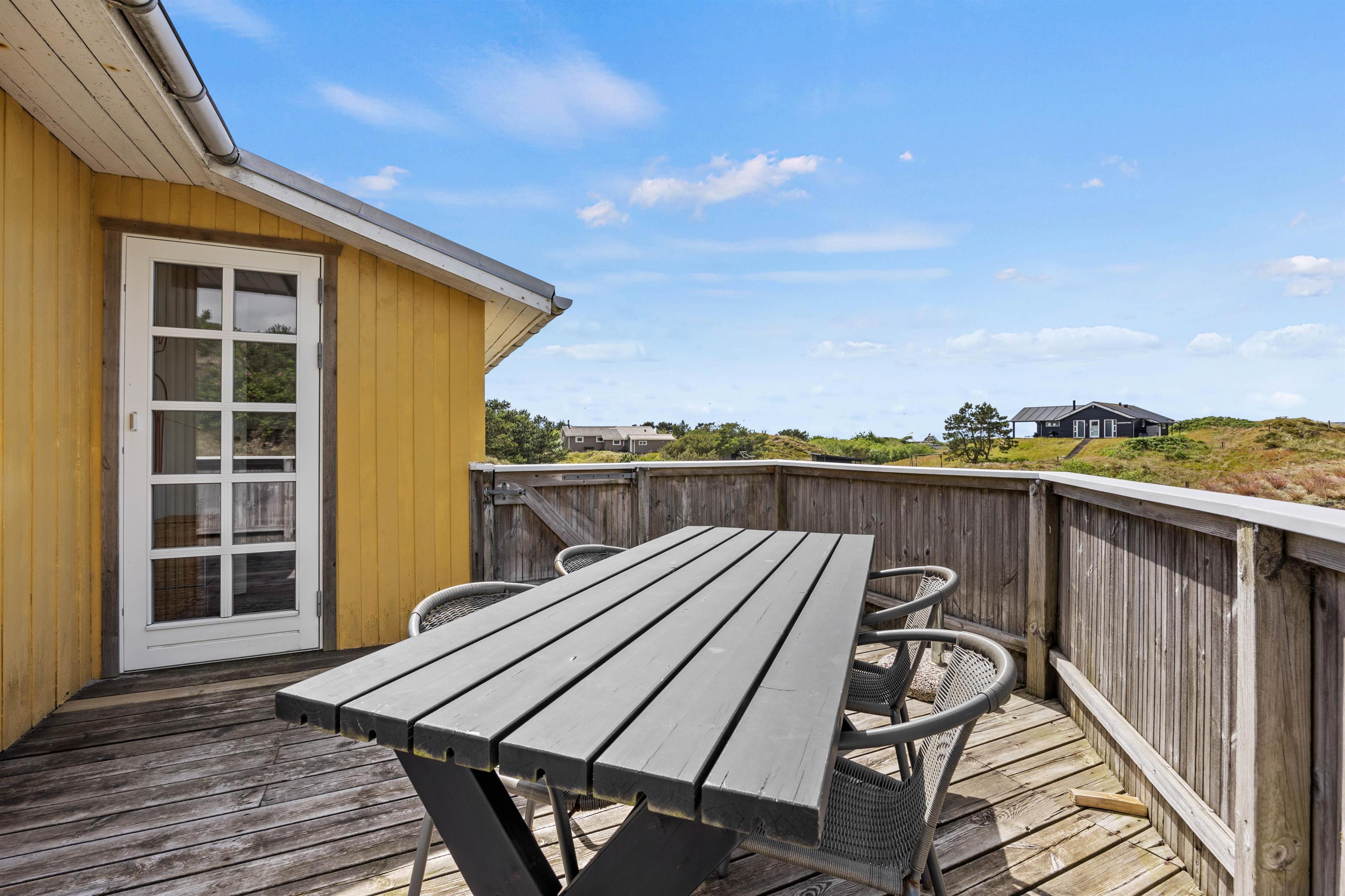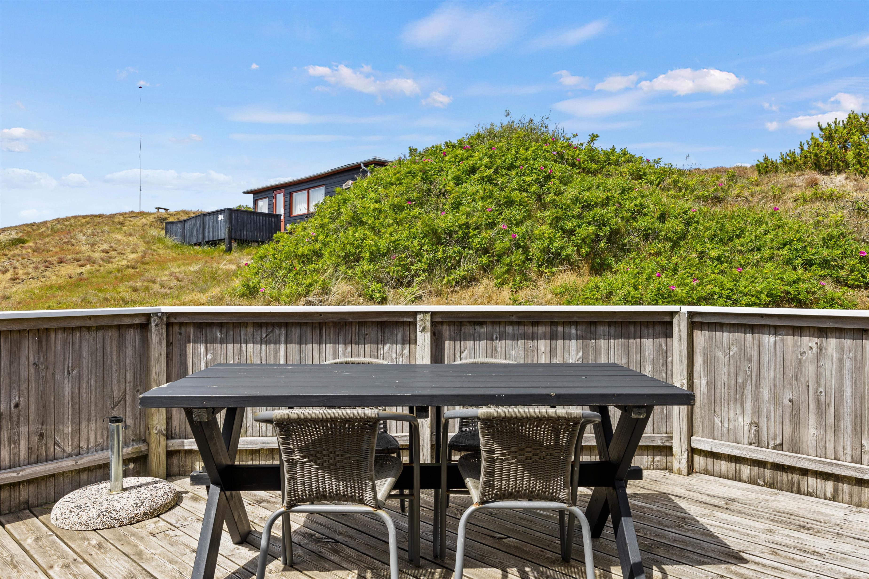 Udendørs venter jer flere skønne terrasser, som I kan nyde de solrige feriedage på. Den ene terrasse vender mod nordøst, og denne terrasse er oplagt at søge mod, når I skal nyde dagens første kop kaffe. Denne terrasse er også helt lukket. Den anden terrasse vender mod sydvest, og her kan I nyde sol det meste af dagen.