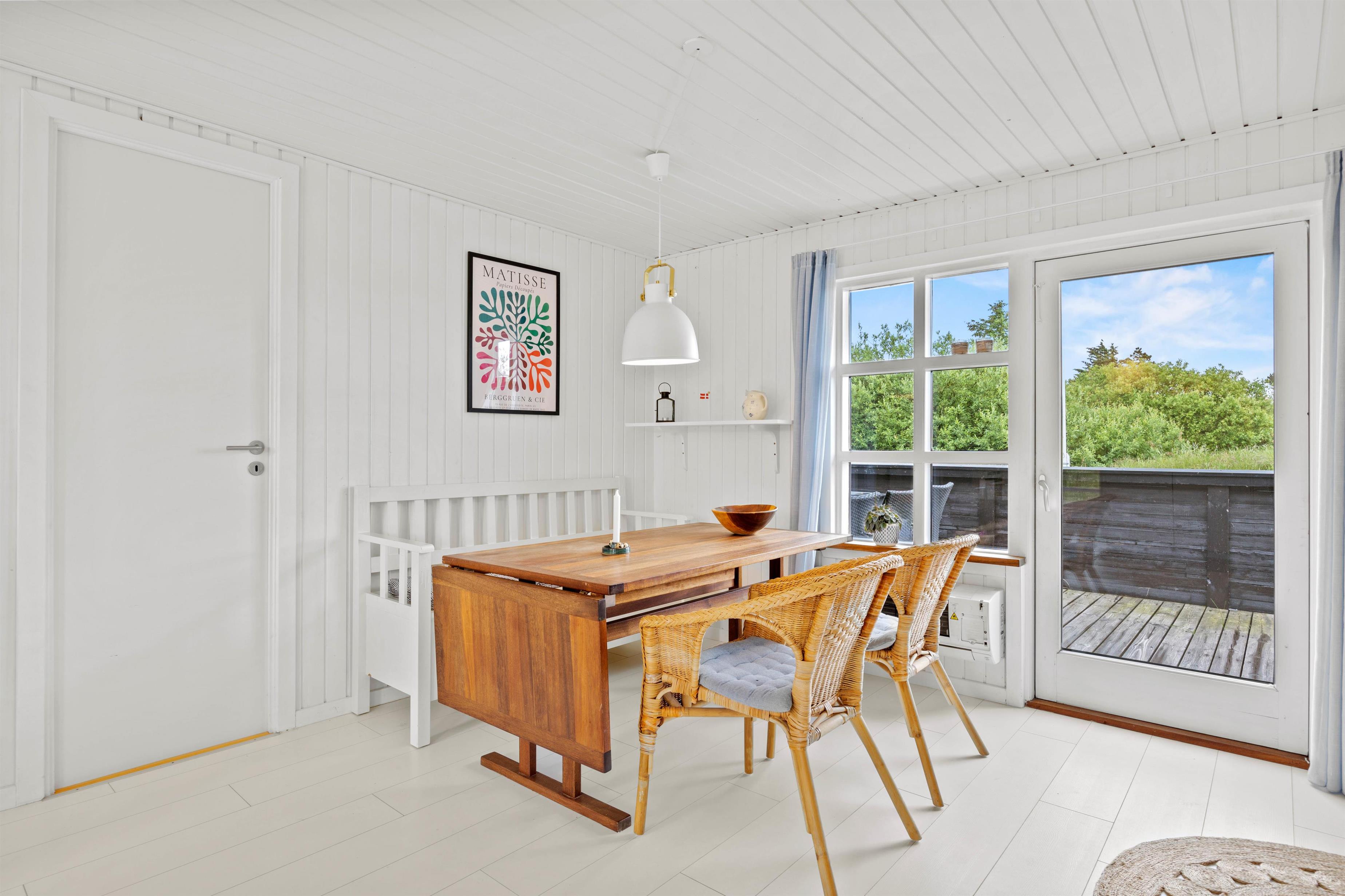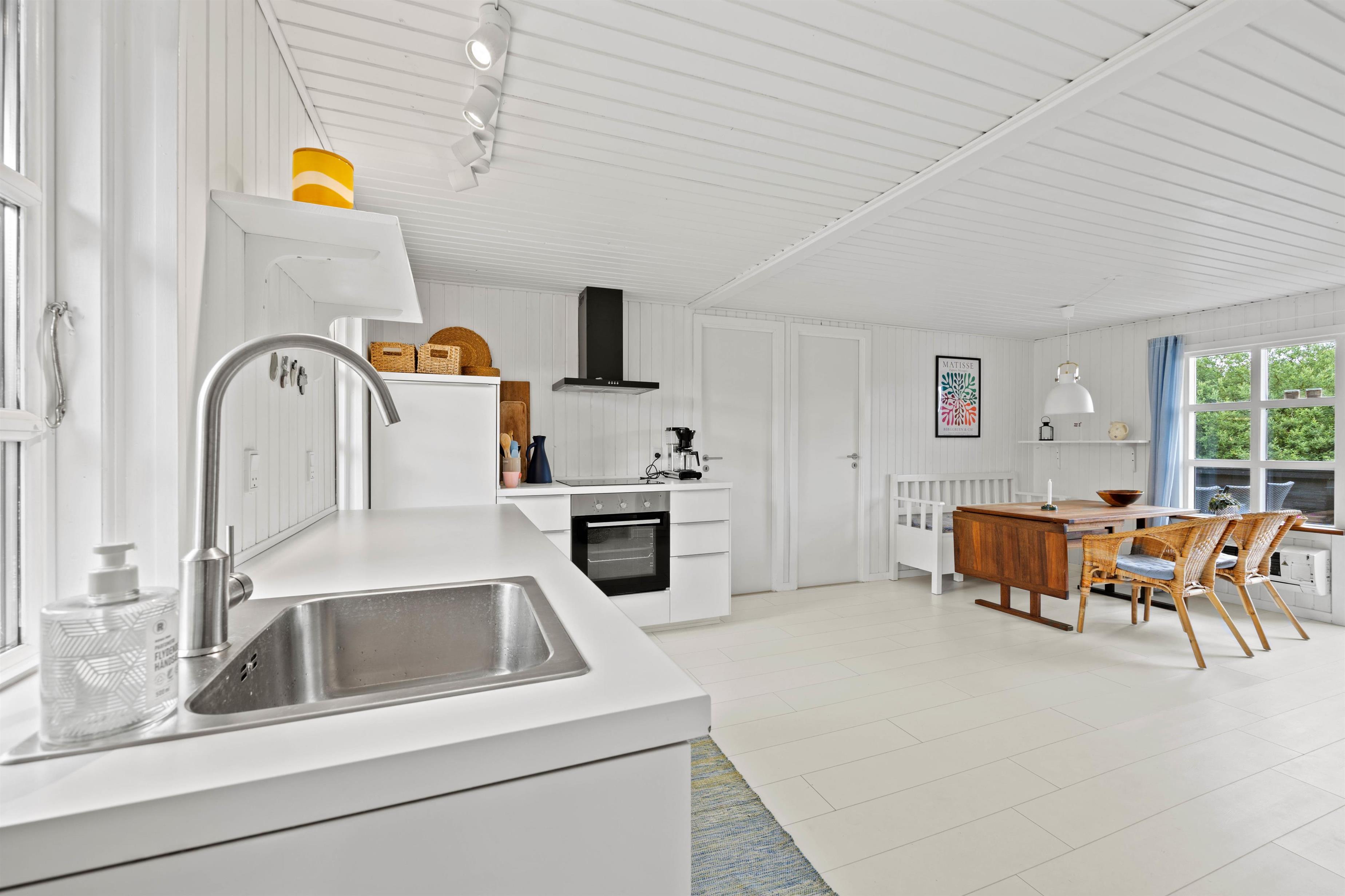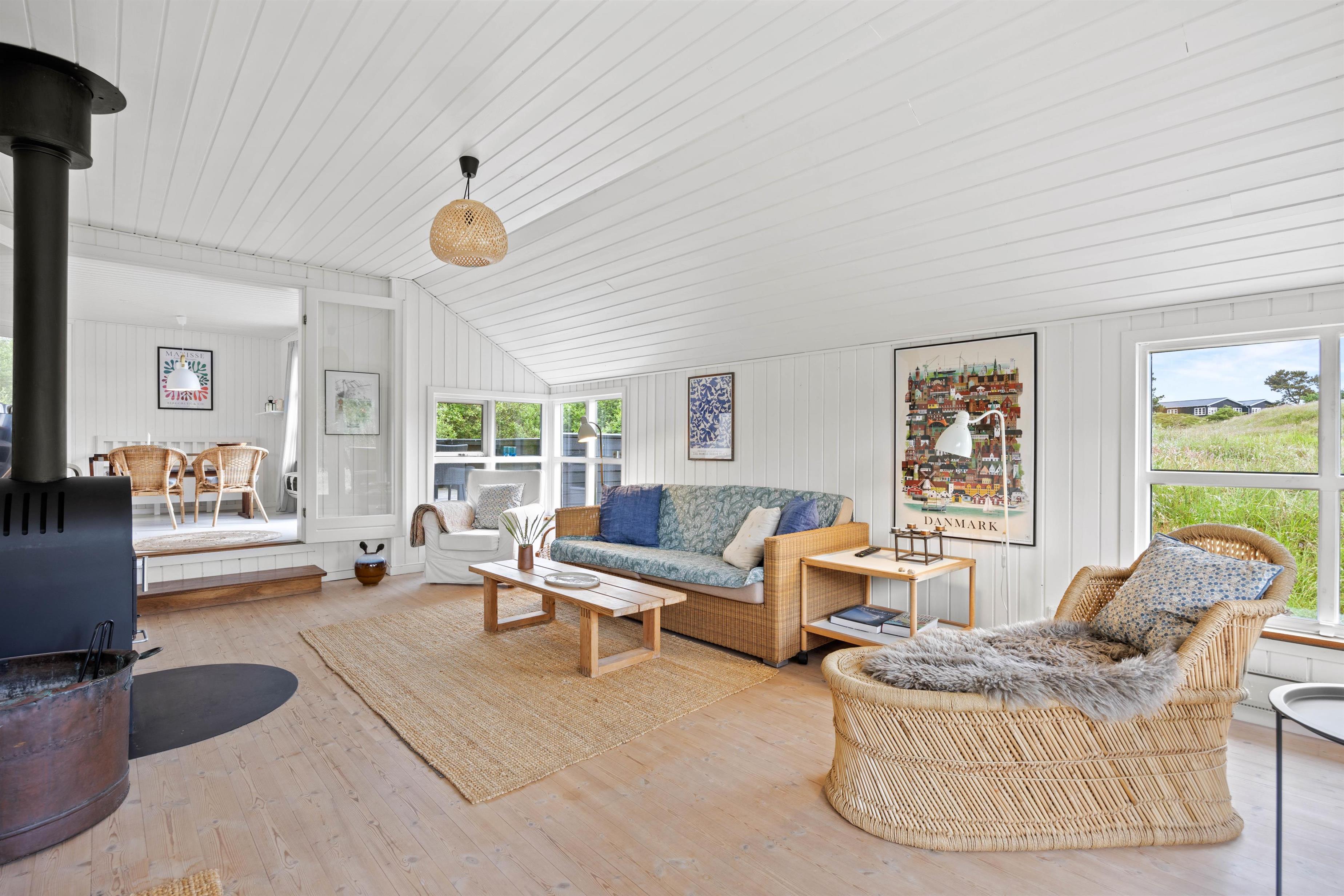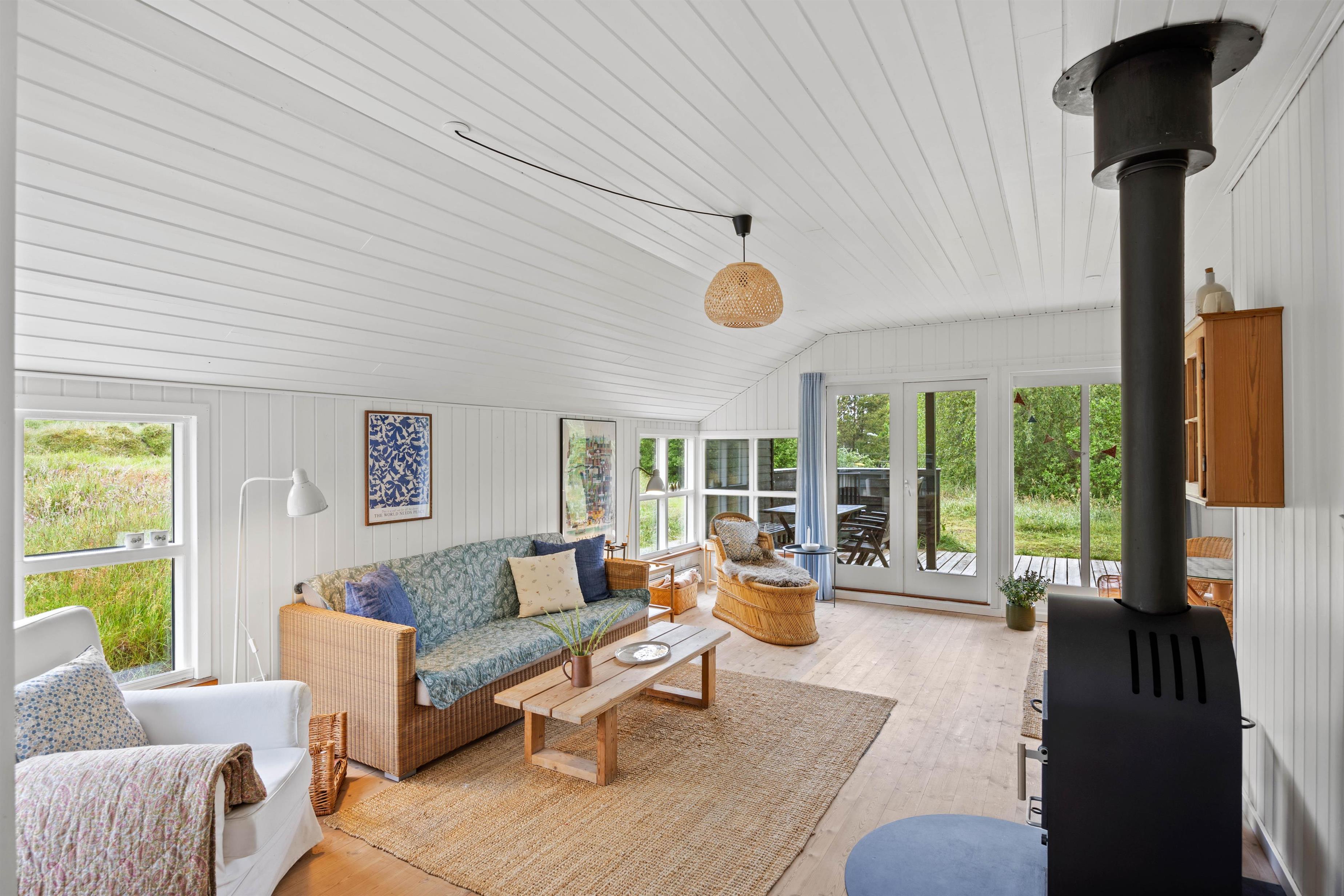 Træd ind i dette fine sommerhus, der har en lys og venlig indretning. Her er et dejligt køkken-alrum med god plads til familielivet, og i stuen sørger den varme brændeovn for en hyggelig atmosfære til de afslappende aftner. Her kan I spille brætspil, se tv eller få varmen foran brændeovnen. Til de køligere dage er her også en klimavenlig varmepumpe. For at gøre opholdet så behageligt som muligt, finder I også moderne bekvemmeligheder såsom opvaskemaskine samt et praktisk bryggers. Her er både vaskemaskine og tørretumbler!
