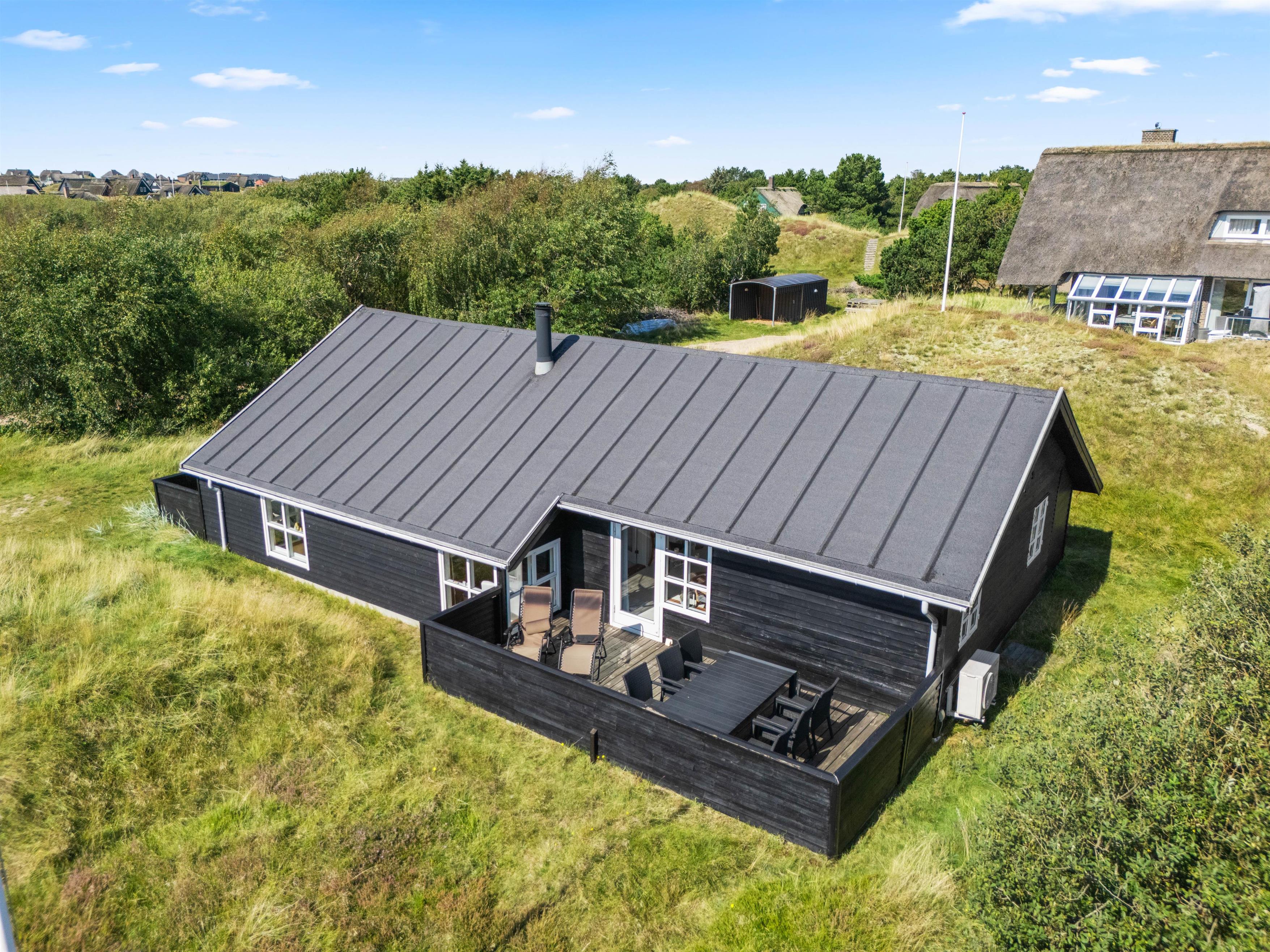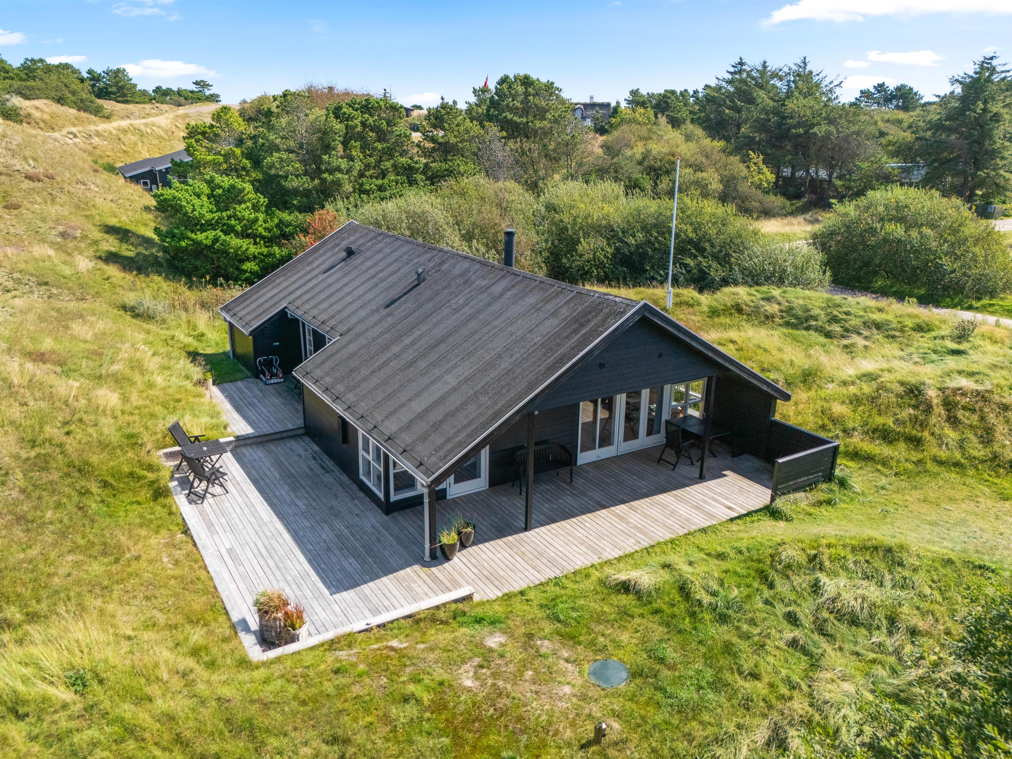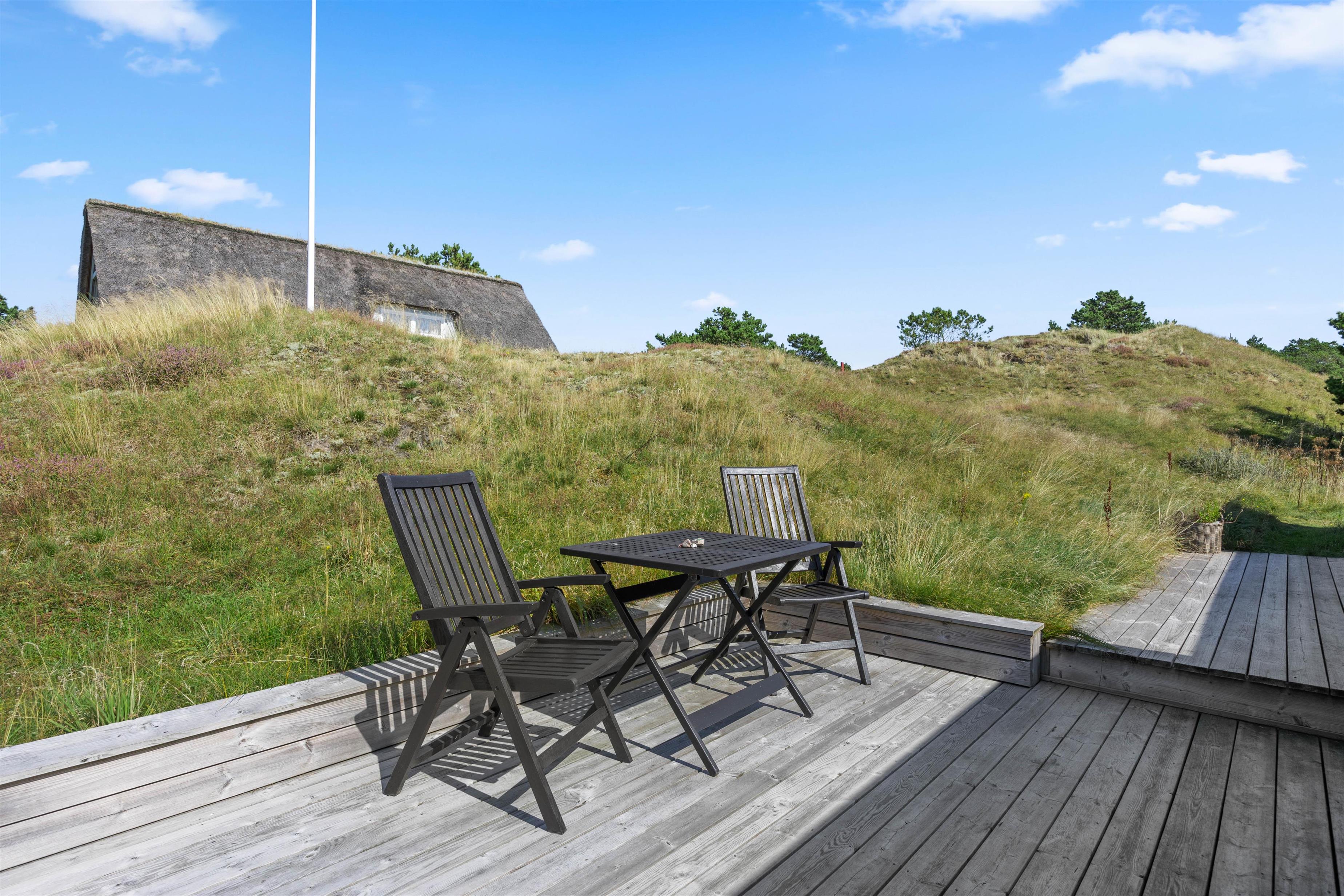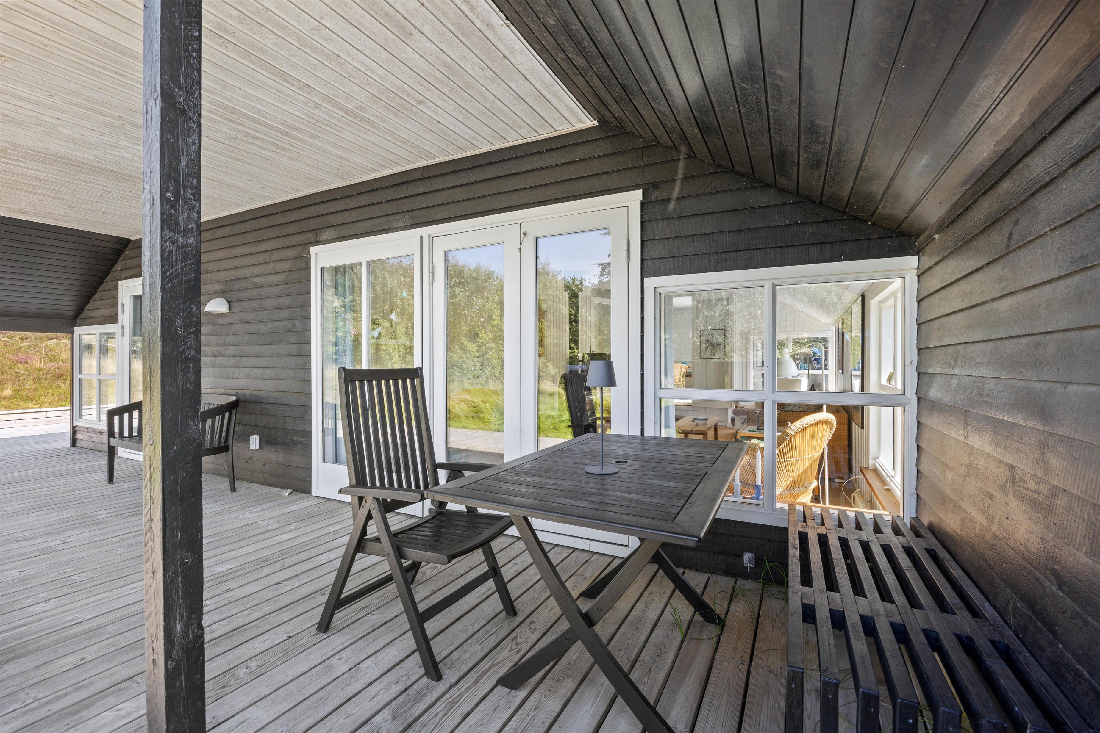 Om sommerhuset finder I flere dejlige terrasser. En af terrasserne har adgang fra køkken/alrummet og er godt afskærmet, så små børn og firbenede venner ikke kan slippe væk, mens den overdækkede terrasse er perfekt til udendørs spisning og afslapning. Både havemøbler og en grill står klar til jer!