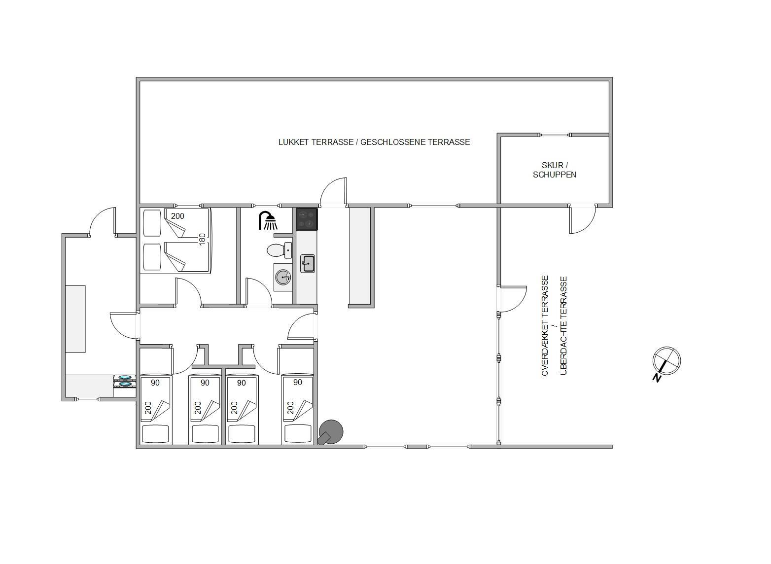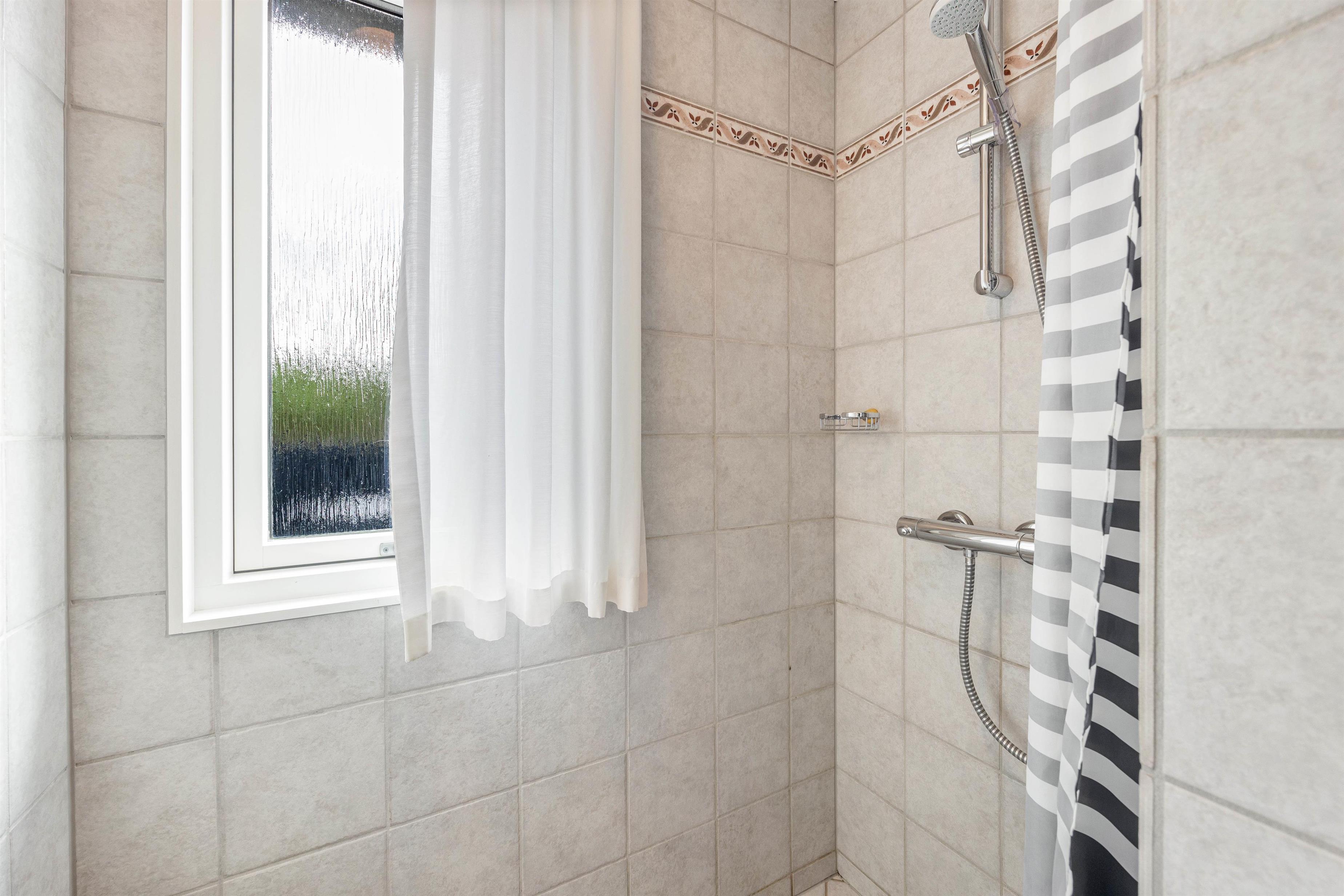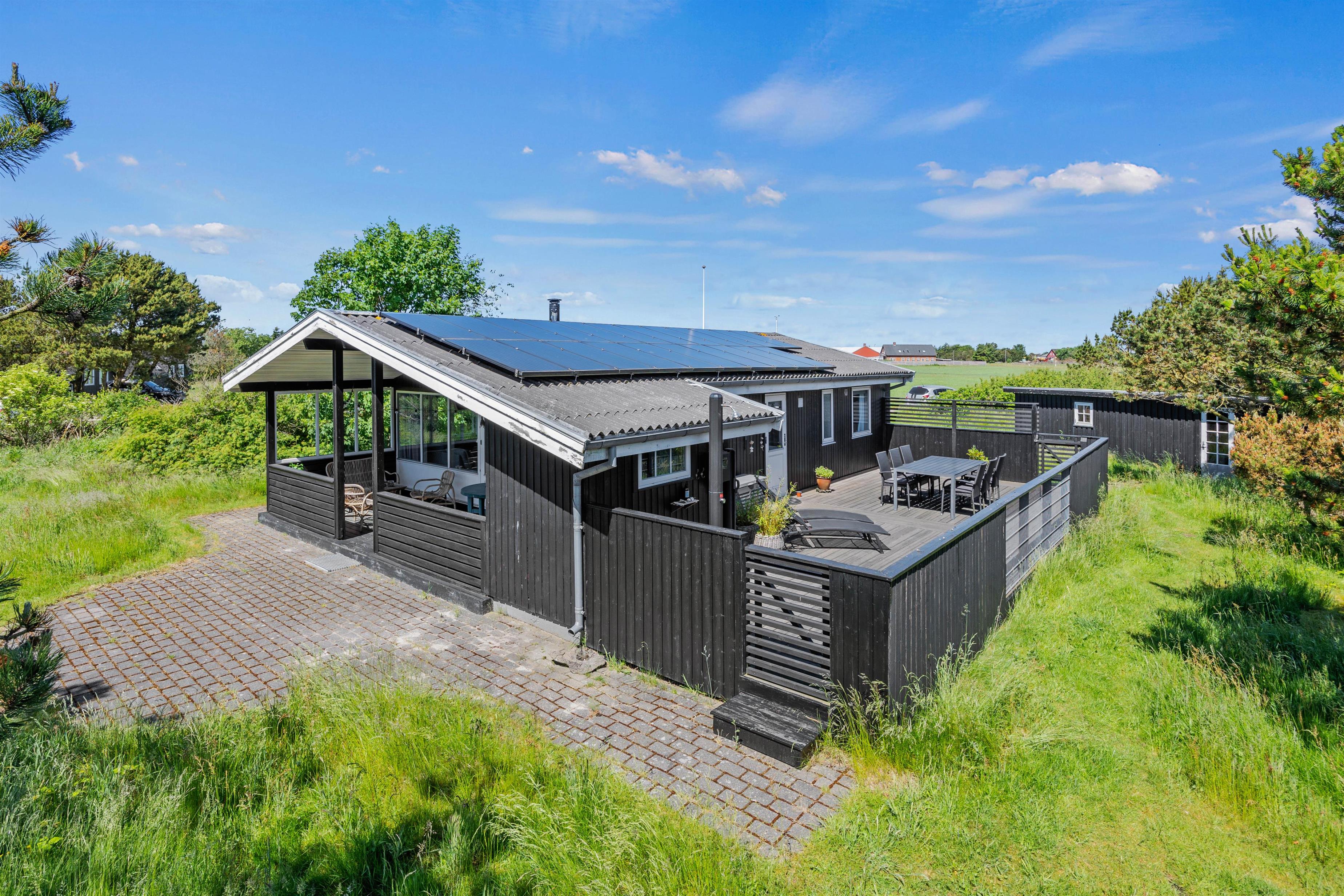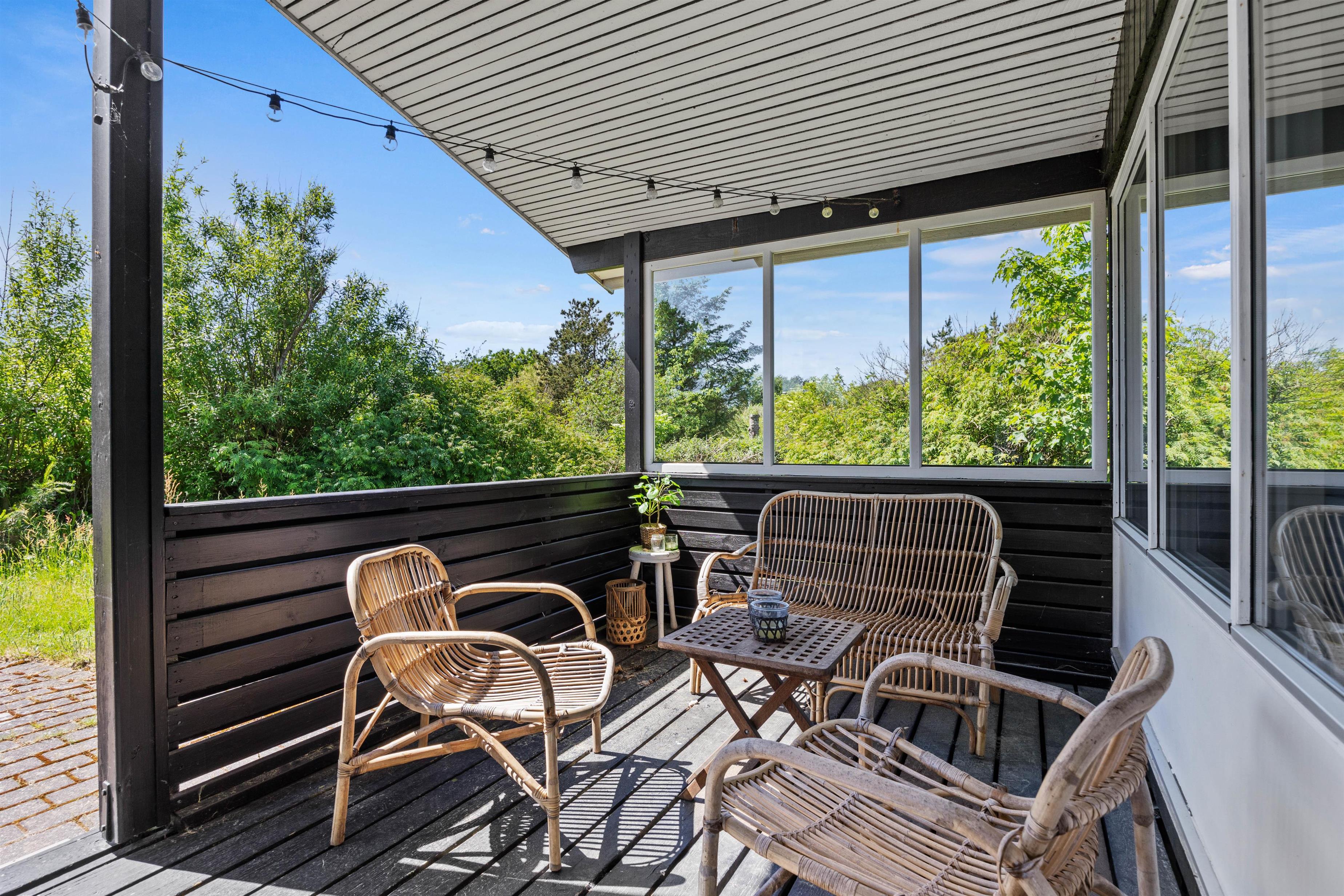 Når I kommer hjem fra en tur på stranden, der ligger 850 meter fra huset, kan det sidste sand skylles af i udebruseren. Denne kan benyttes fra april til november. Der er både åben, afskærmet og lukket terrasse at hygge sig på, når der for eksempel skal grilles. Eller hvis man bare skal dase i havemøblerne og på solvognene, alt imens kan børnene hygge sig med leg på trampolinen eller tage sig en gyngetur.