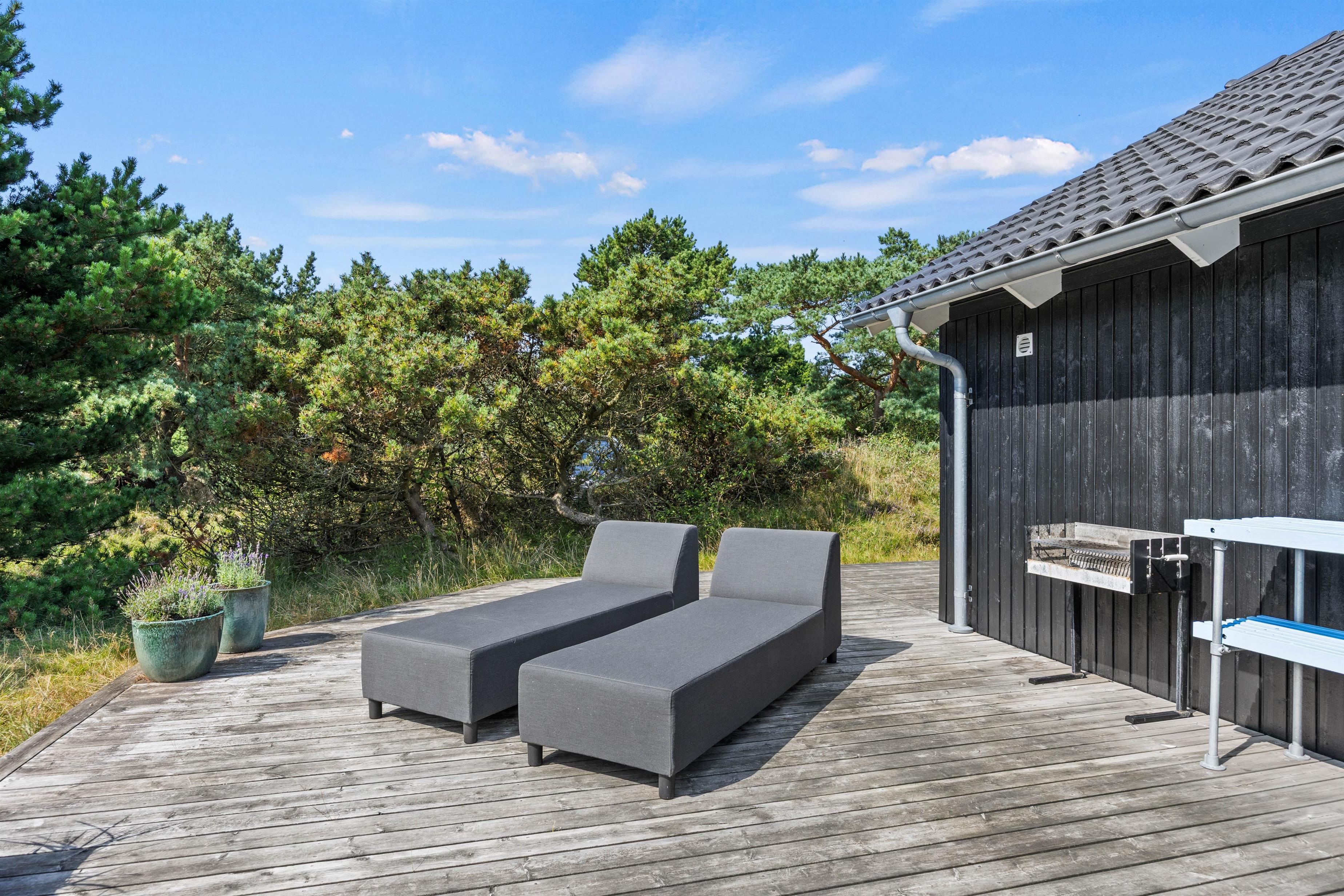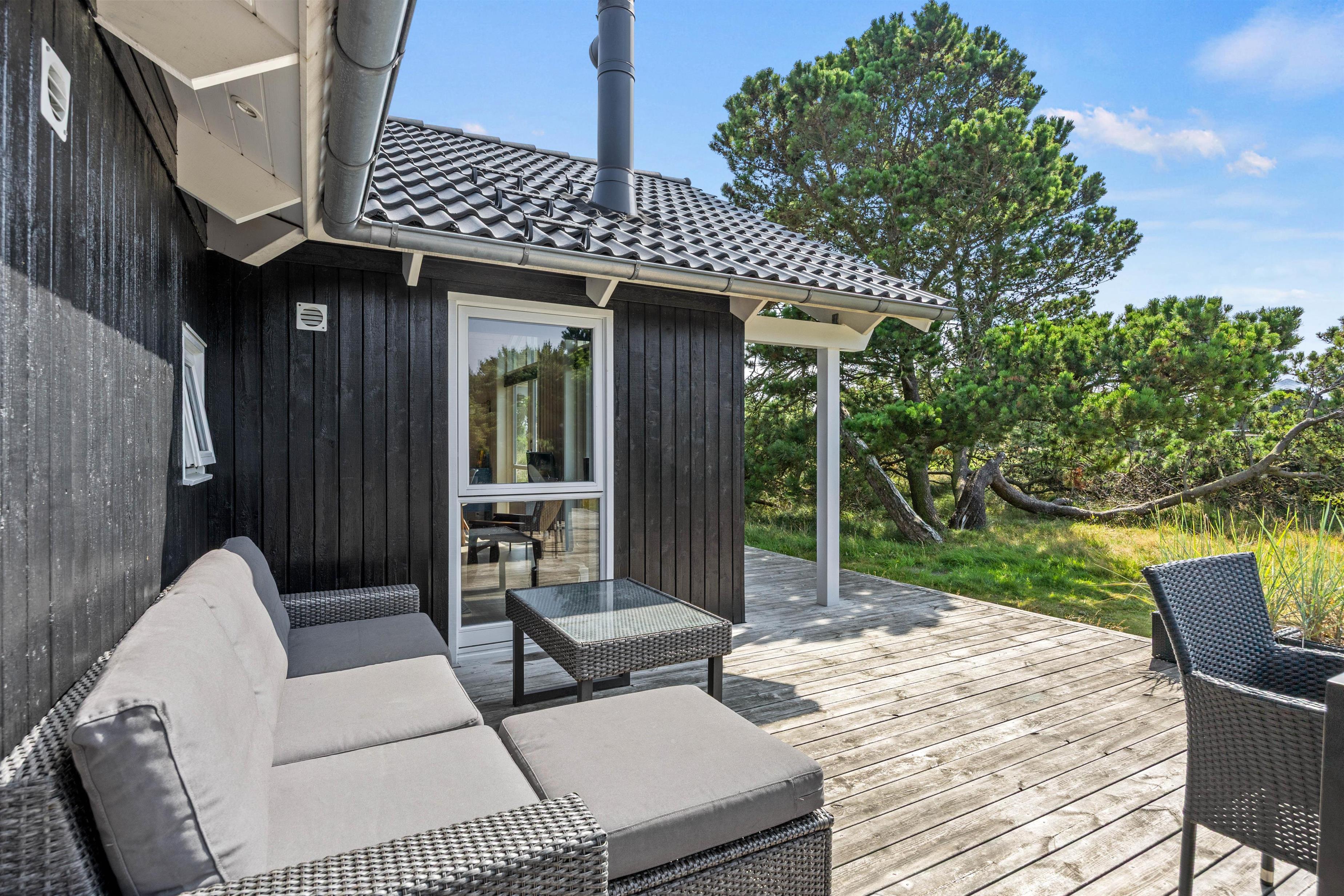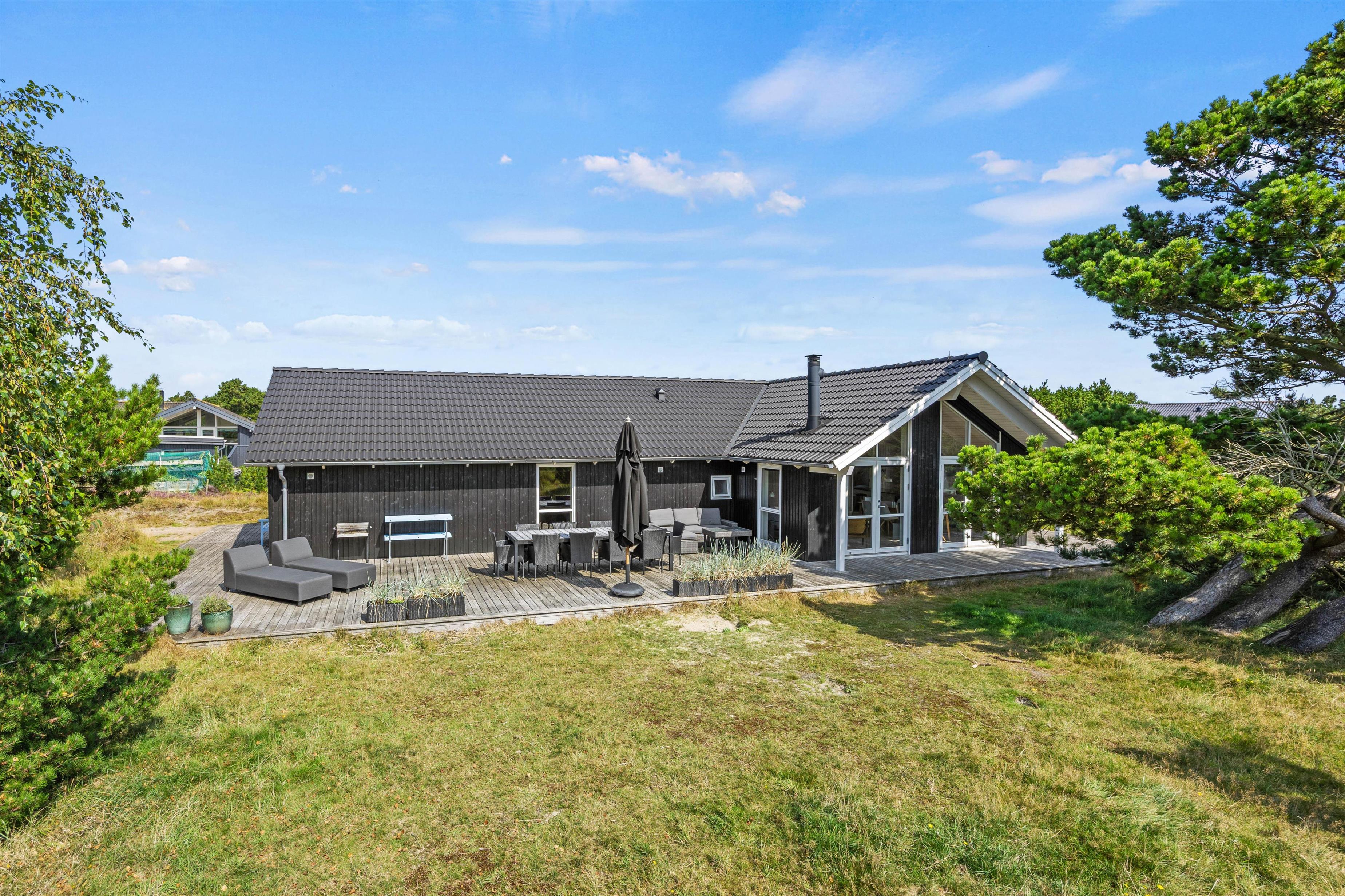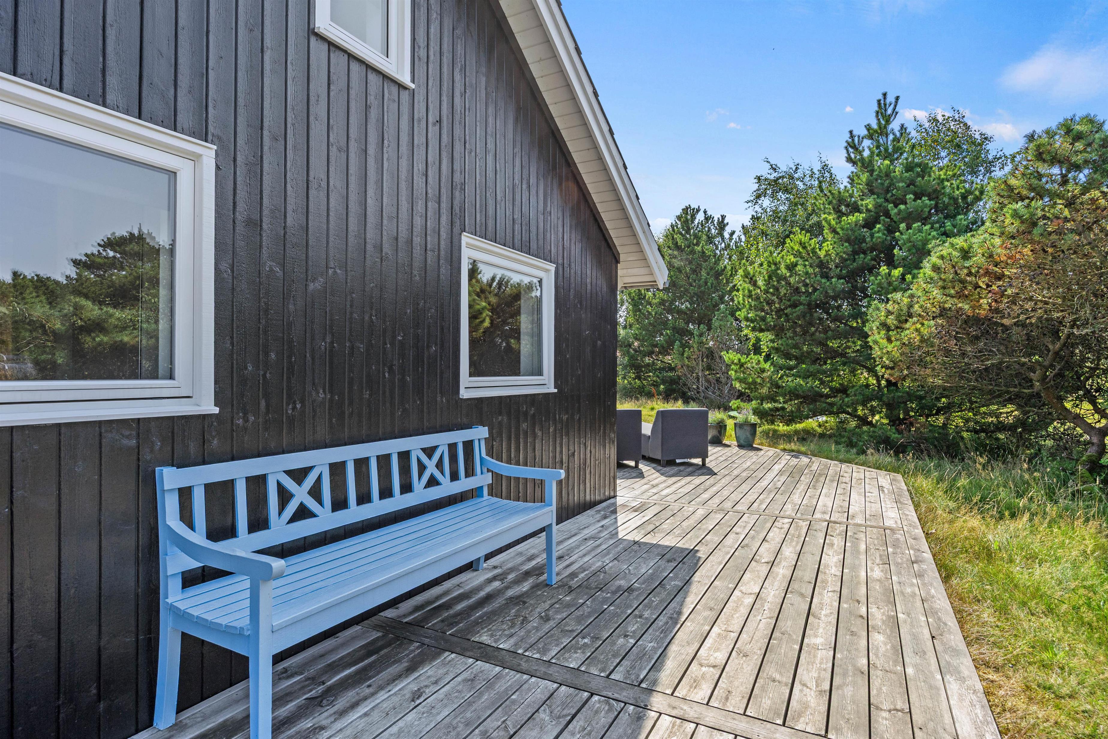Udenfor kan der leges på trampolinen eller gyngen, og I kan nyde den friske vesterhavsluft på terrassen. Der findes tillige en stor udendørs bruser (fra april - november). Feriehuset er hundevenligt, så jeres firbenede venner også kan nyde naturen omkring ejendommen og efter en kort gåtur, når I den brede sandstrand, der indbyder til mange timer ved Vesterhavet i bølgerne blå eller langs strandkanten - eller en vandretur på en af de mange naturstier på Fanø.