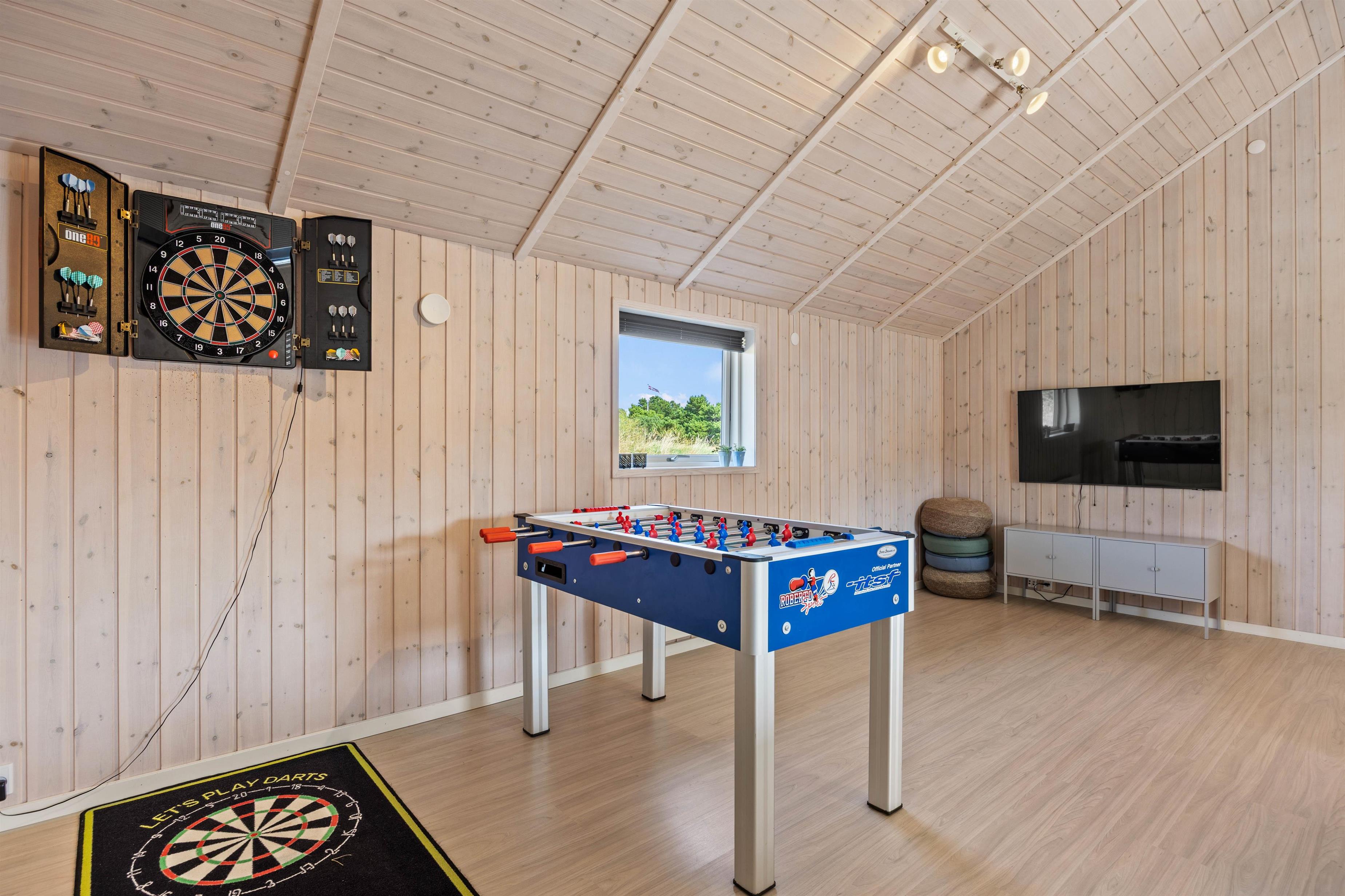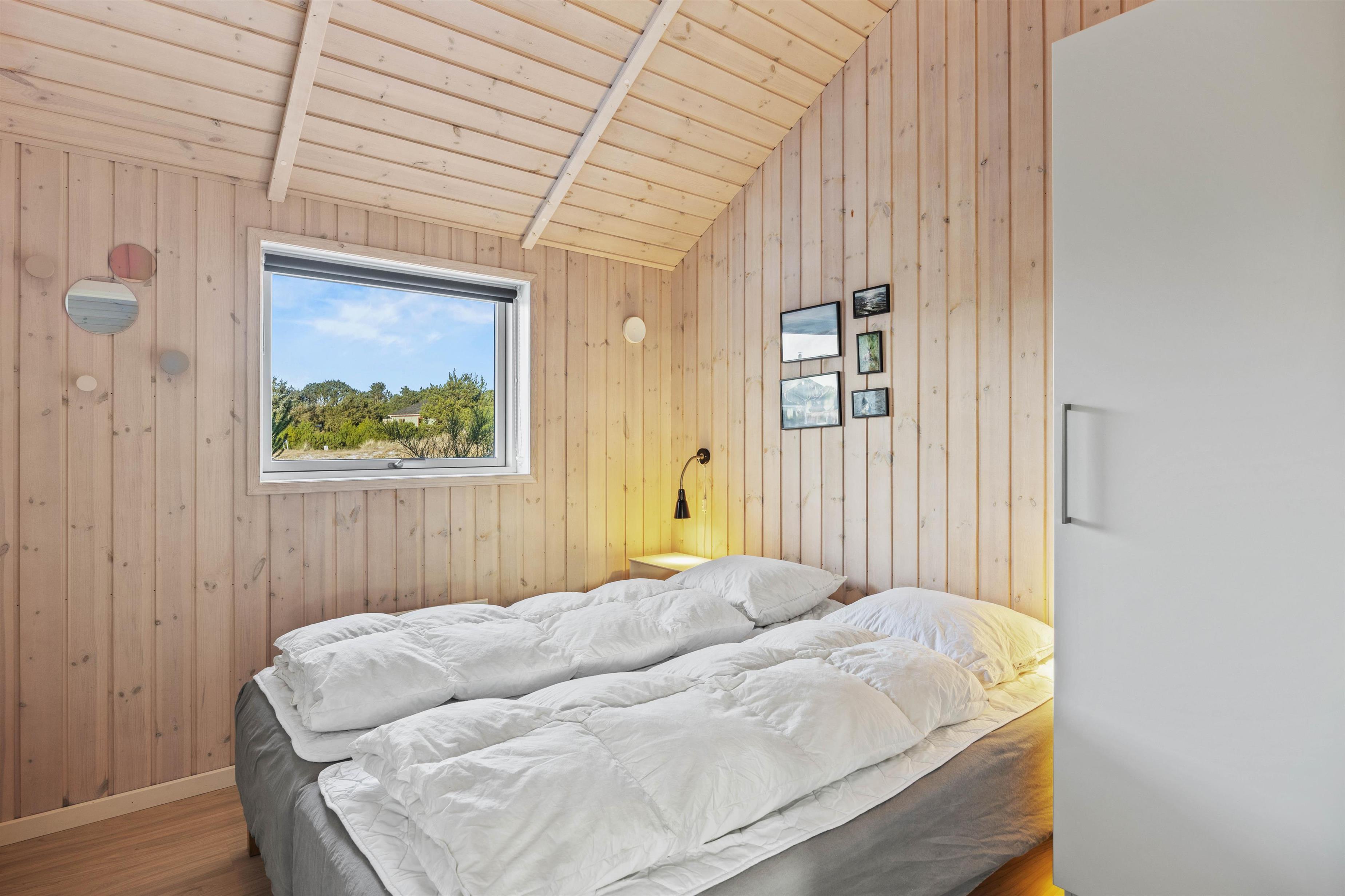 Feriehuset har 4 soveværelser med 4 dobbeltsenge, bestående af i alt 8 enkeltsenge, dertil hems med 3 børnesovepladser, og sommerhuset har 2 badeværelser – begge med gulvvarme. Til afslappende stunder er der både sauna og et spabad til rådighed. Køkkenet indeholder alt, hvad I behøver for at forkæle hinanden med lækre hjemmelavede måltider, herunder induktionskomfur og opvaskemaskine og vinkøleskab. Der er også vaskemaskine og tørretumbler i feriehuset, hvis I får brug for det. Som et ekstra plus har feriehuset et aktivitetsrum med billardbord, bordtennis, elektronisk dart og stort TV mv, der står til jeres rådighed.