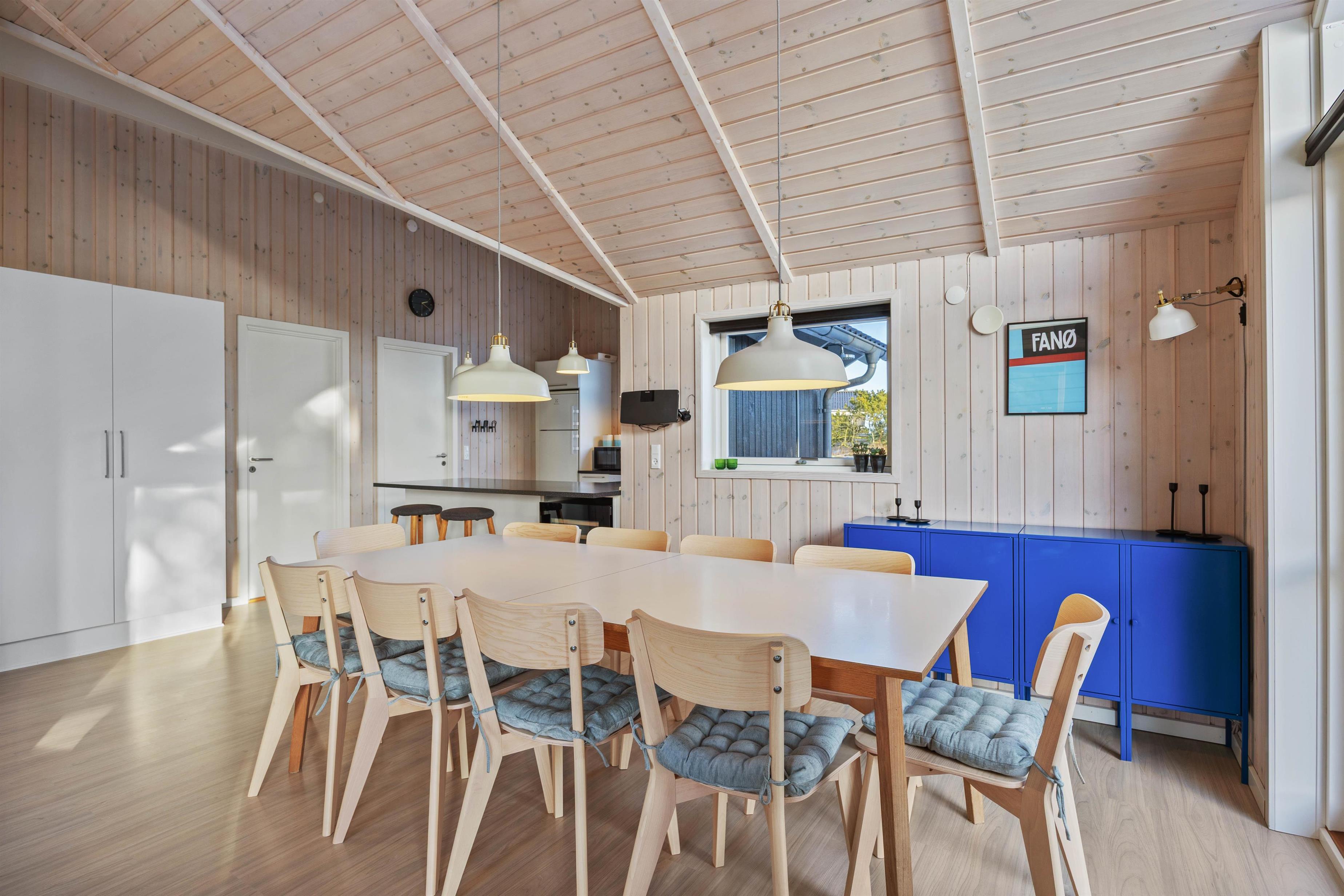 Det åbne opholdsområde udgør hjertet i feriehuset. Her er veludstyret køkken, vinkøleskab og spisestue og stue i åbent plan. Når der laves mad, kan I samtidig snakke sammen, andre spille eller slappe af - og I kan stadig være sammen. Den hyggelige brændeovn sørger for en behagelig varme på koldere dage, mens den moderne varmepumpe sikrer et behageligt indeklima hele året rundt. Den åbne indretning skaber en behagelig fornemmelse, der er 'højt til loftet', en lys og indbydende atmosfære.