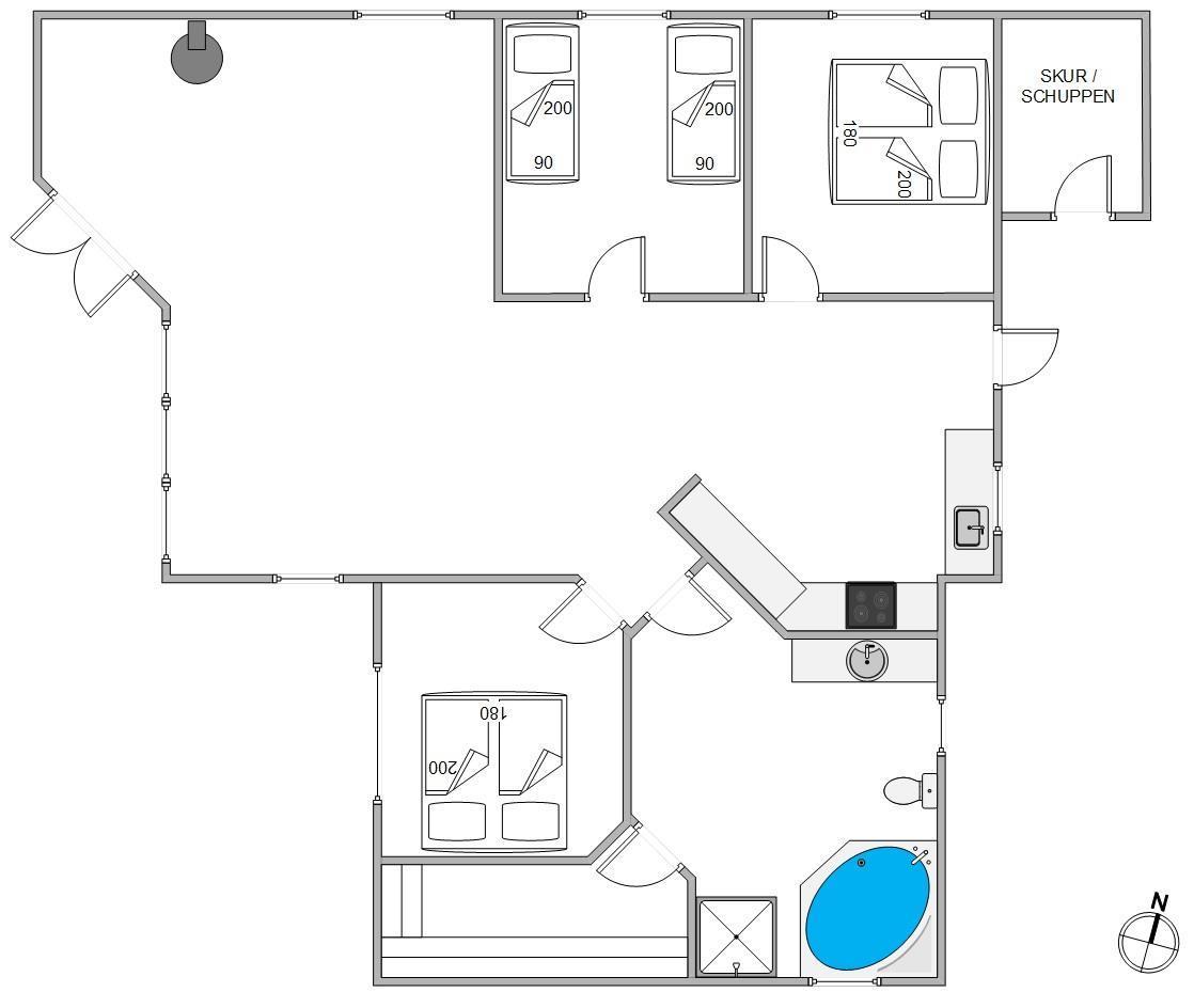 I det rummelige badeværelse med gulvvarme er der både spabad og sauna. Efter en begivenhedsrig feriedag er det boblende vand i spaen og varmen i saunaen perfekt til afslapning og velvære. Der er også vaskemaskine og tørretumbler til rådighed, så I kan opfriske håndklæderne i løbet af ferien. I de 3 soveværelser er 6 komfortable sovepladser. 2 værelser er indrettet med dobbeltsenge, det sidste værelse har 2 enkeltsenge, så I kan arrangere jer, som det passer jer bedst.