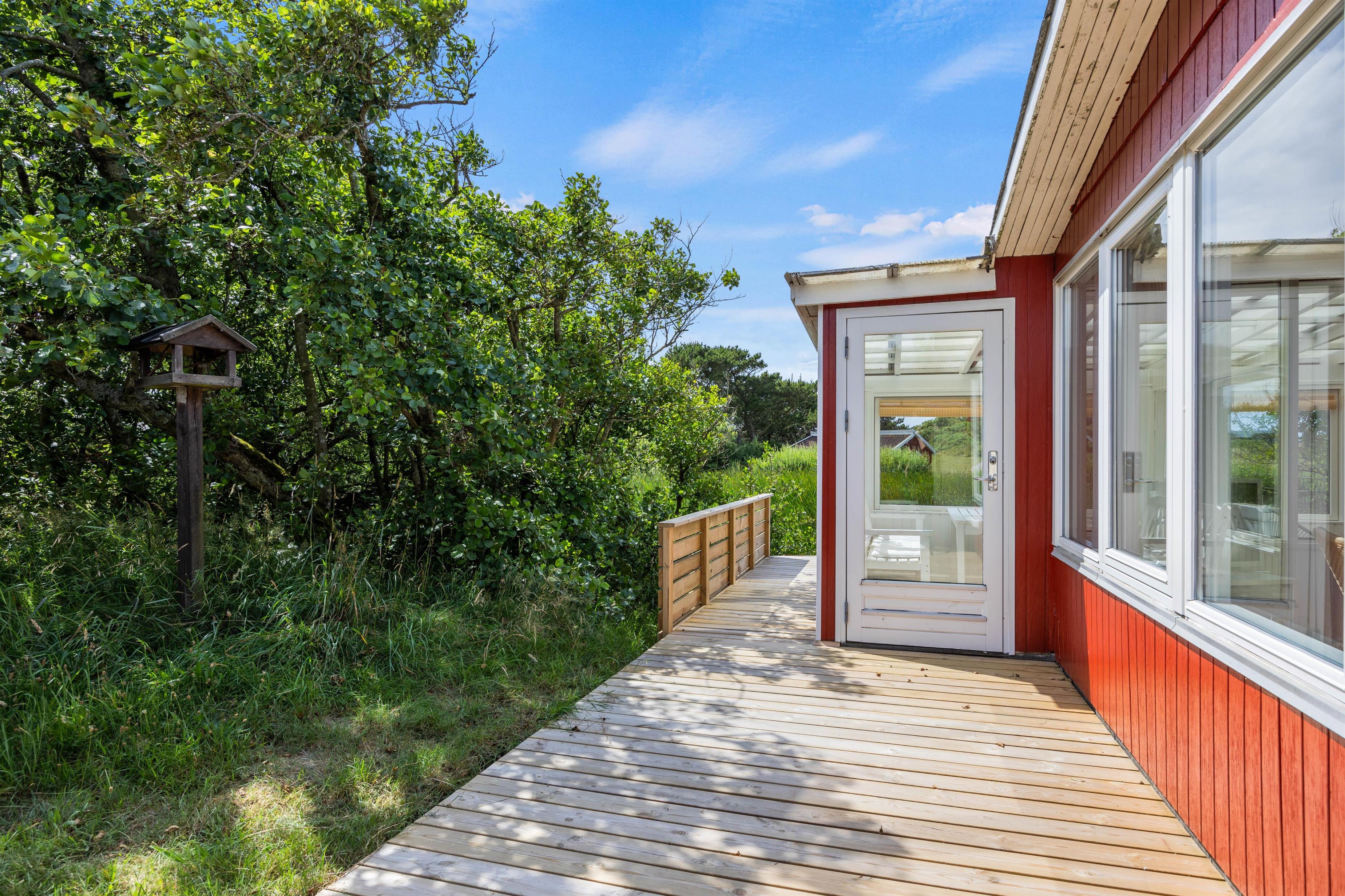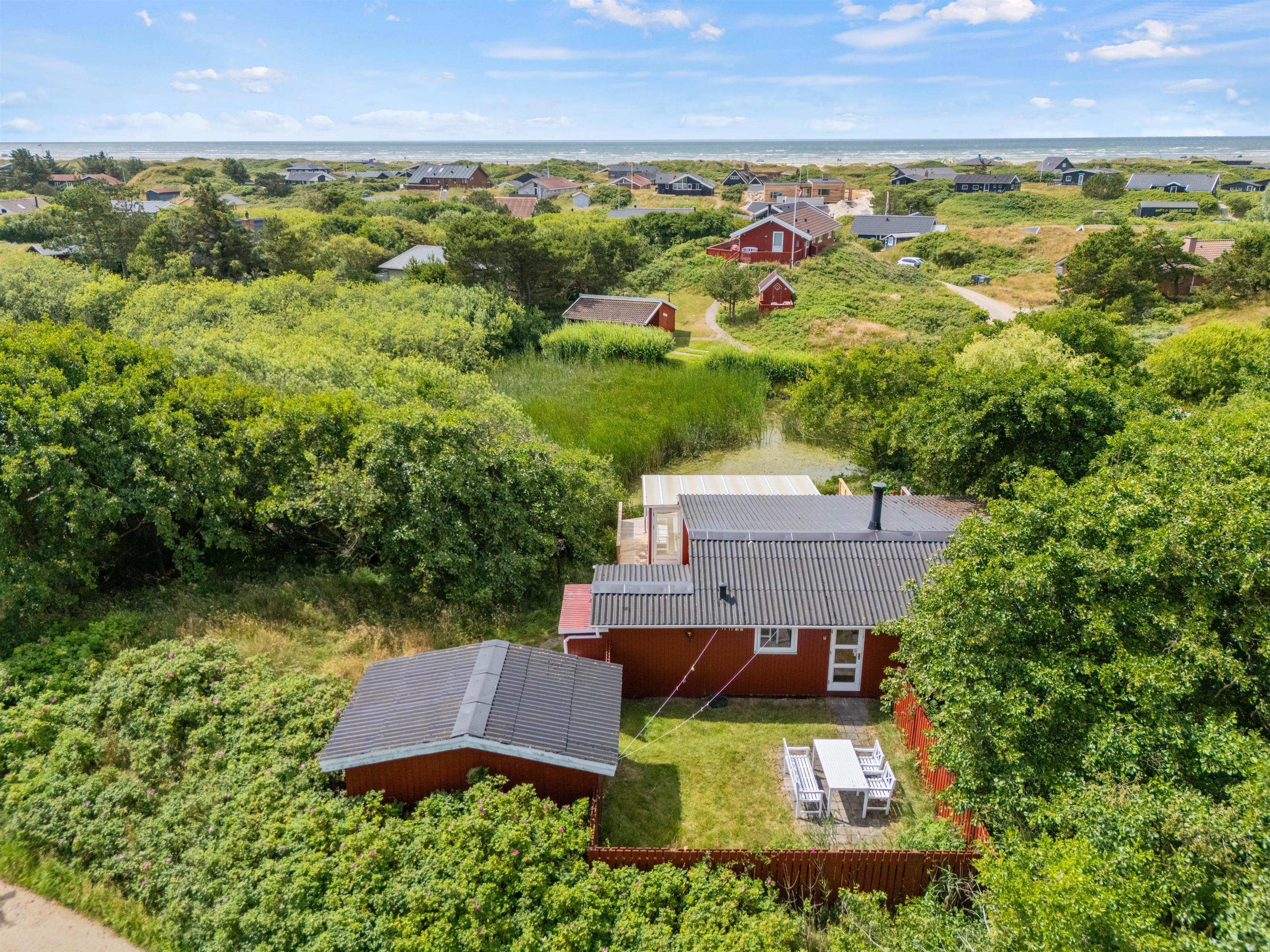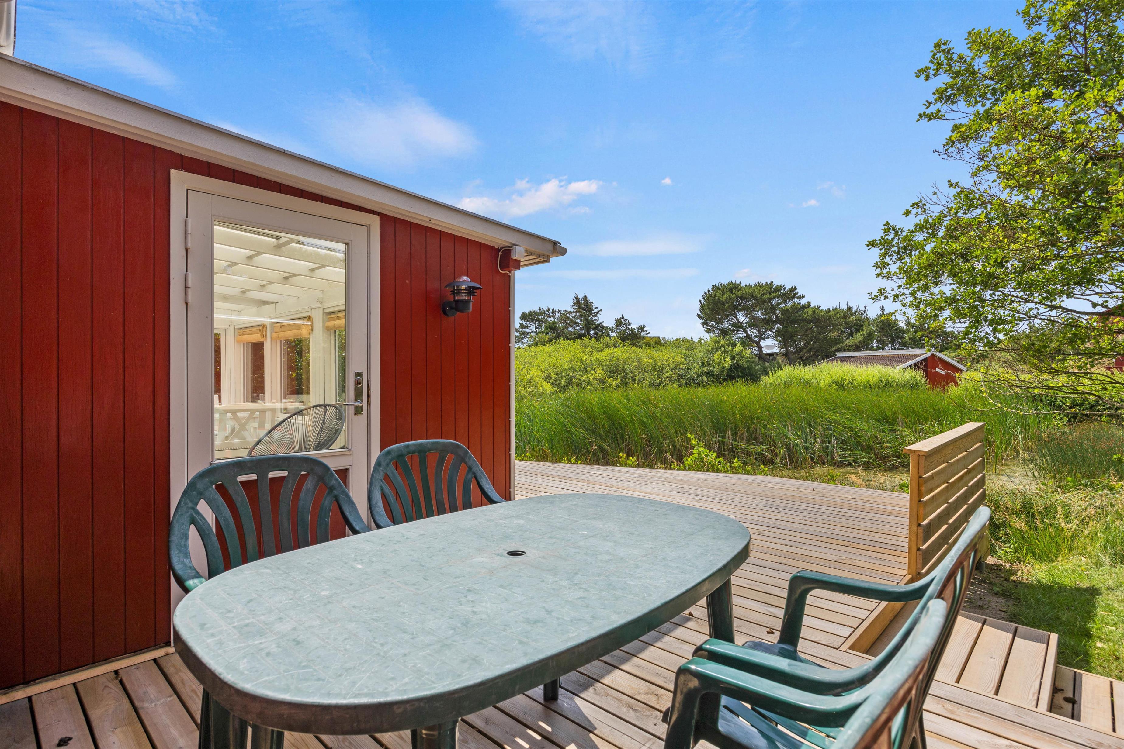 Fra den åbne terrasse har I den dejligste udsigt over både søen og naturgrunden. Her kan I solbade i liggestolene eller trække jer tilbage i havemøblerne med en drink eller en kop kaffe. Med kun 600 m til Vesterhavet vil en daglig gåtur dertil hurtigt blive et tilbagevendende punkt på ferie-dagsordenen. Her er skønt ved både ebbe og flod. Tænd op i grillen til aften, og nyd et lækkert grillmåltid sammen, imens skyggerne bliver lange. Her I mere energi, og lyst til endnu en ferieoplevelse, kan I bagefter gå til stranden og opleve solnedgangen i Vesterhavet som afslutning på dagen.