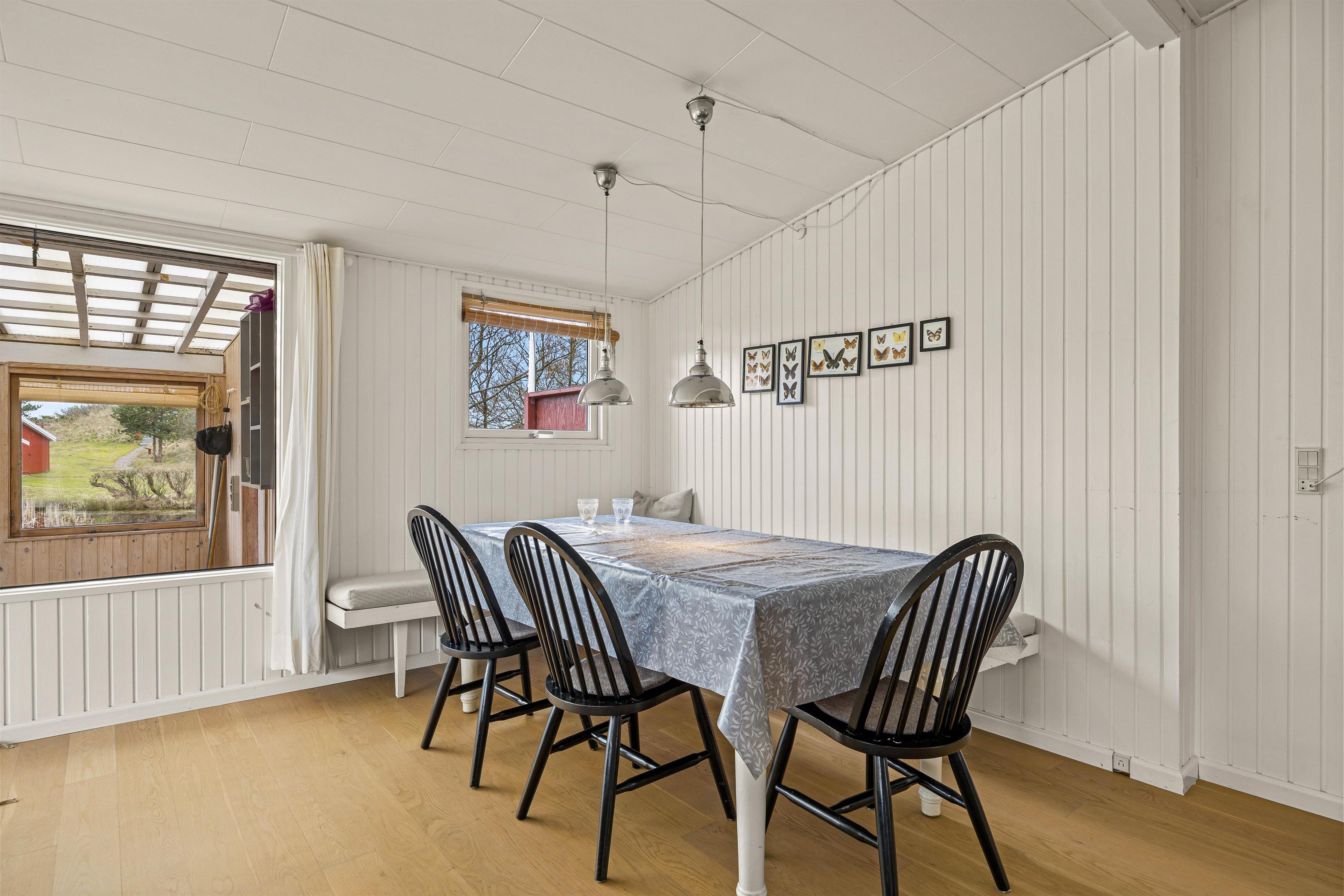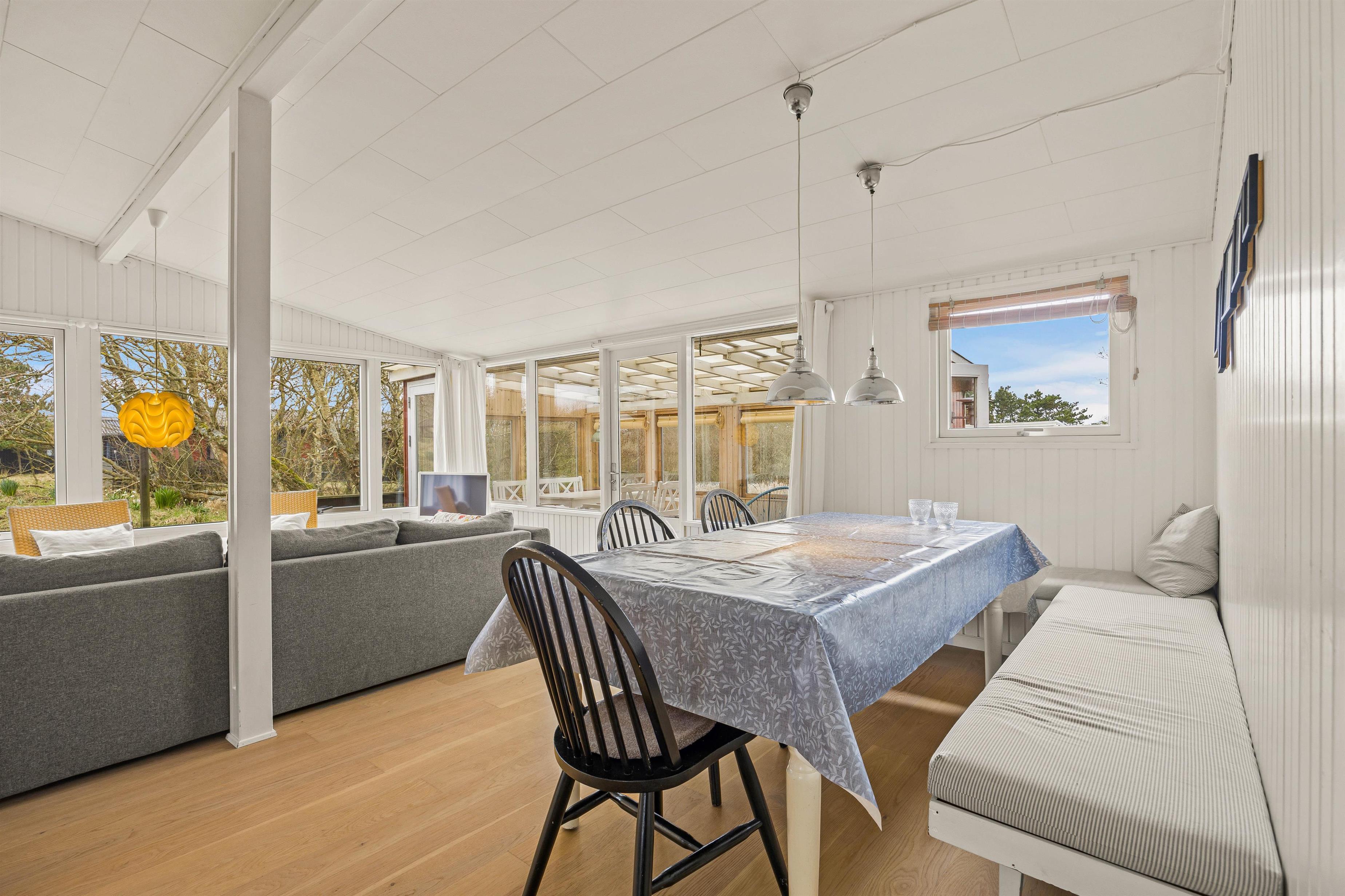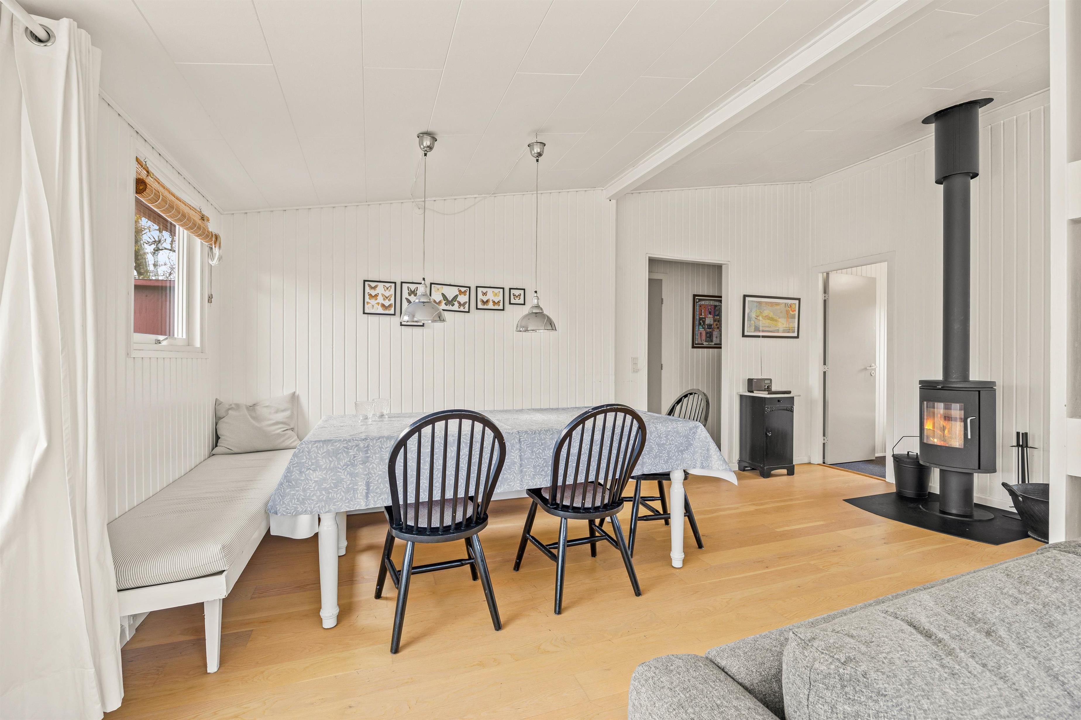 Man føler sig hjemme straks, man træder ind ad døren til Strandgårdsvej 7. De lyse gulve med trælaminat og hvidmalede vægge og lofter giver et dejligt lyst og let miljø. Her kan I hygge jer sammen i stuen eller i bænkekrogen ved spisebordet med ild i brændeovnen. Er det overskyet en dag, kan I forlænge dagen i udestuen, hvor I har den skønneste udsigt over søen. Der er et specielt fint lysindfald gennem de brede vinduespartier, så I kan nyde den skønne beliggenhed på naturgrunden. Det åbne køkken med morgenmads-bar indeholder alt, hvad I behøver for at forkæle hinanden med hjemmelavede retter. Den omkostnings- og energibesparende varmepumpe sørger for behagelige temperaturer i feriehuset.