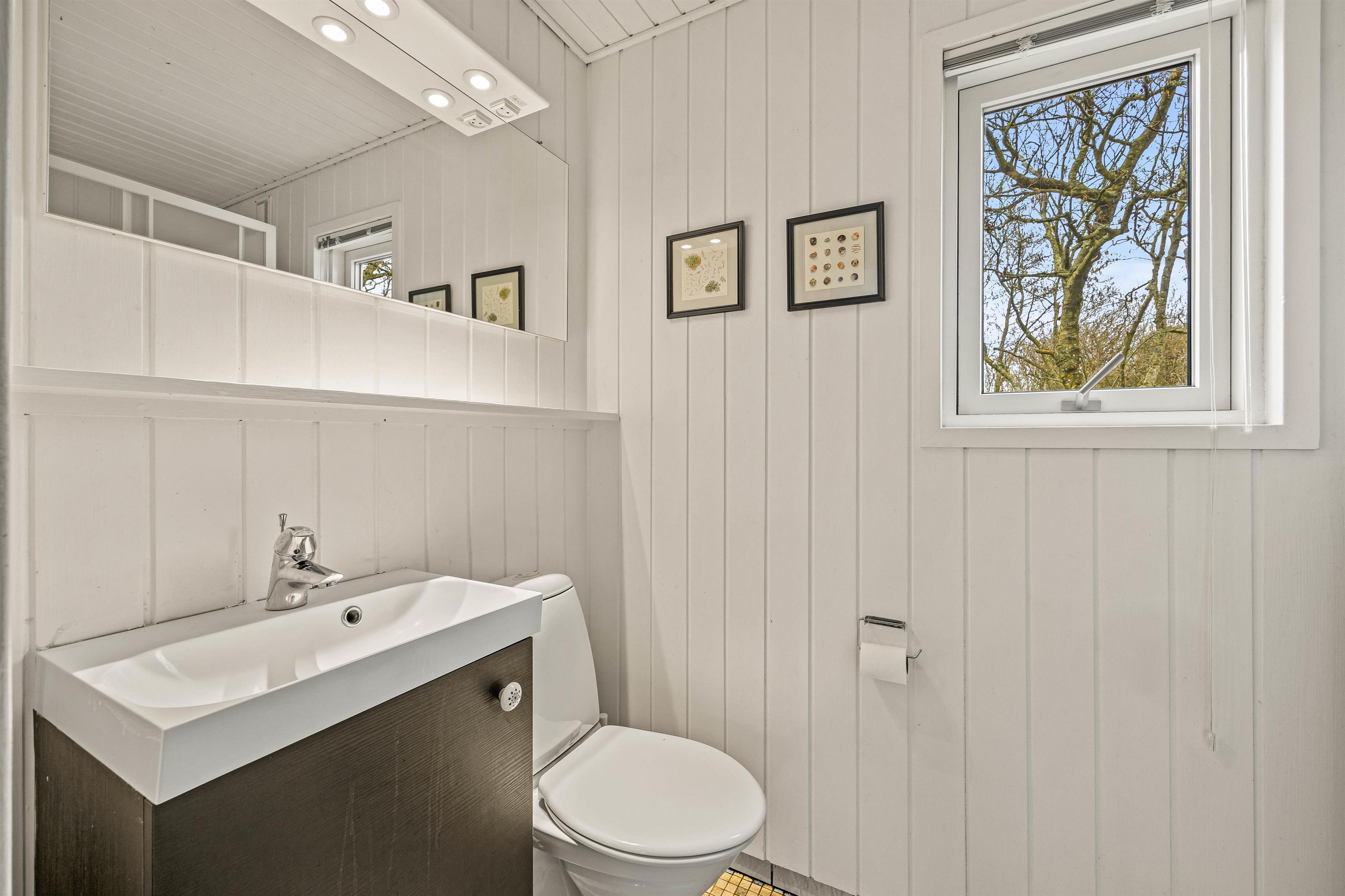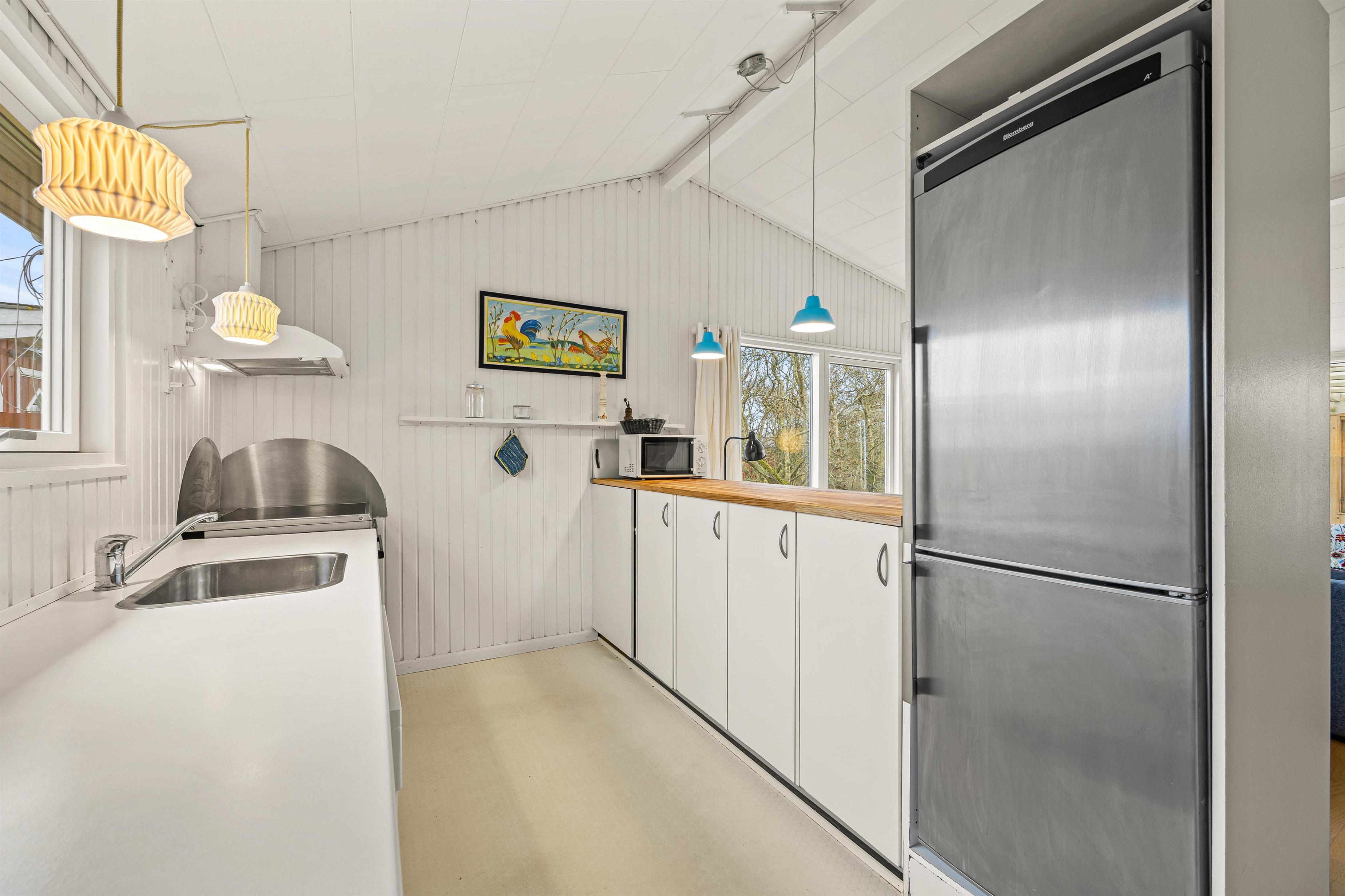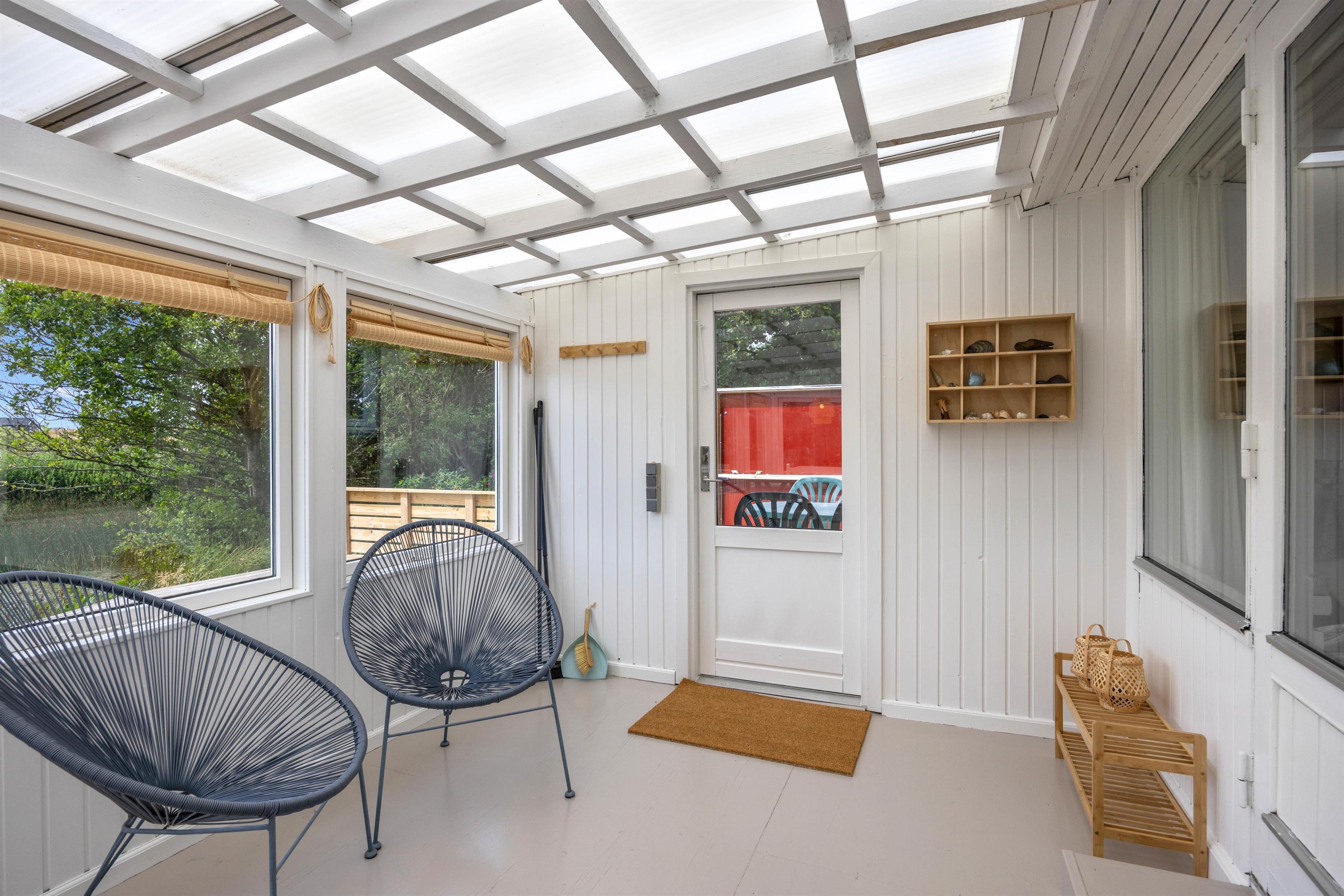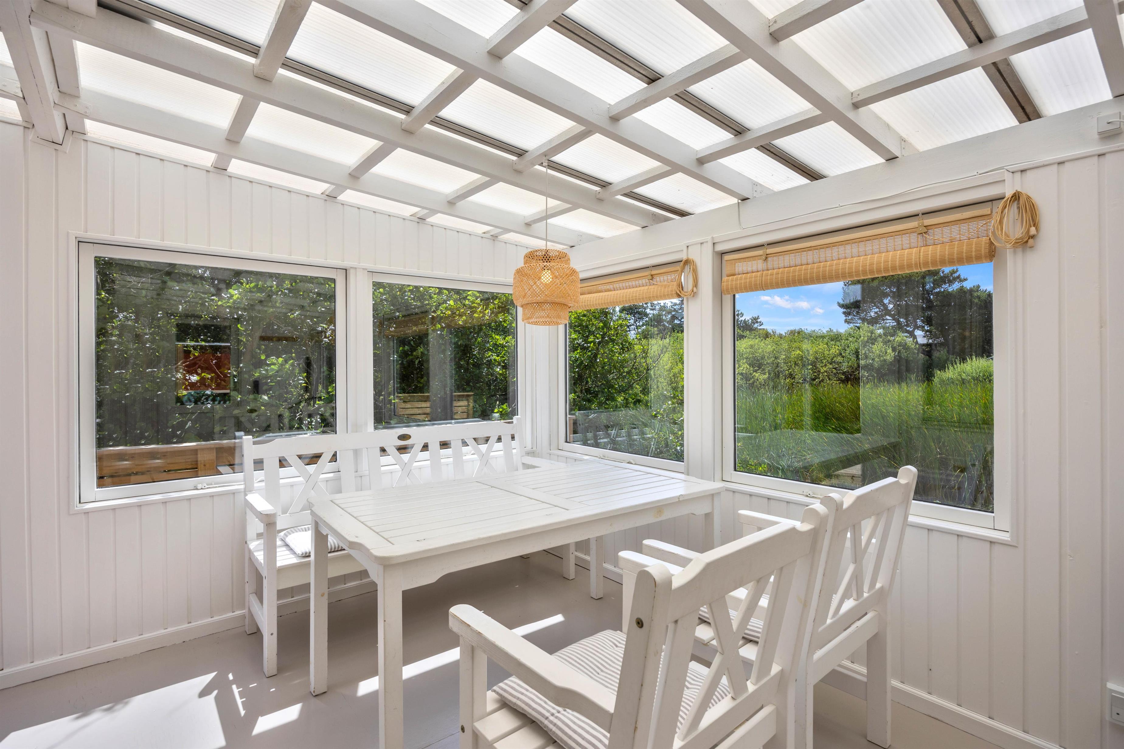 Man føler sig hjemme straks, man træder ind ad døren til Strandgårdsvej 7. De lyse gulve med trælaminat og hvidmalede vægge og lofter giver et dejligt lyst og let miljø. Her kan I hygge jer sammen i stuen eller i bænkekrogen ved spisebordet med ild i brændeovnen. Er det overskyet en dag, kan I forlænge dagen i udestuen, hvor I har den skønneste udsigt over søen. Der er et specielt fint lysindfald gennem de brede vinduespartier, så I kan nyde den skønne beliggenhed på naturgrunden. Det åbne køkken med morgenmads-bar indeholder alt, hvad I behøver for at forkæle hinanden med hjemmelavede retter. Den omkostnings- og energibesparende varmepumpe sørger for behagelige temperaturer i feriehuset.