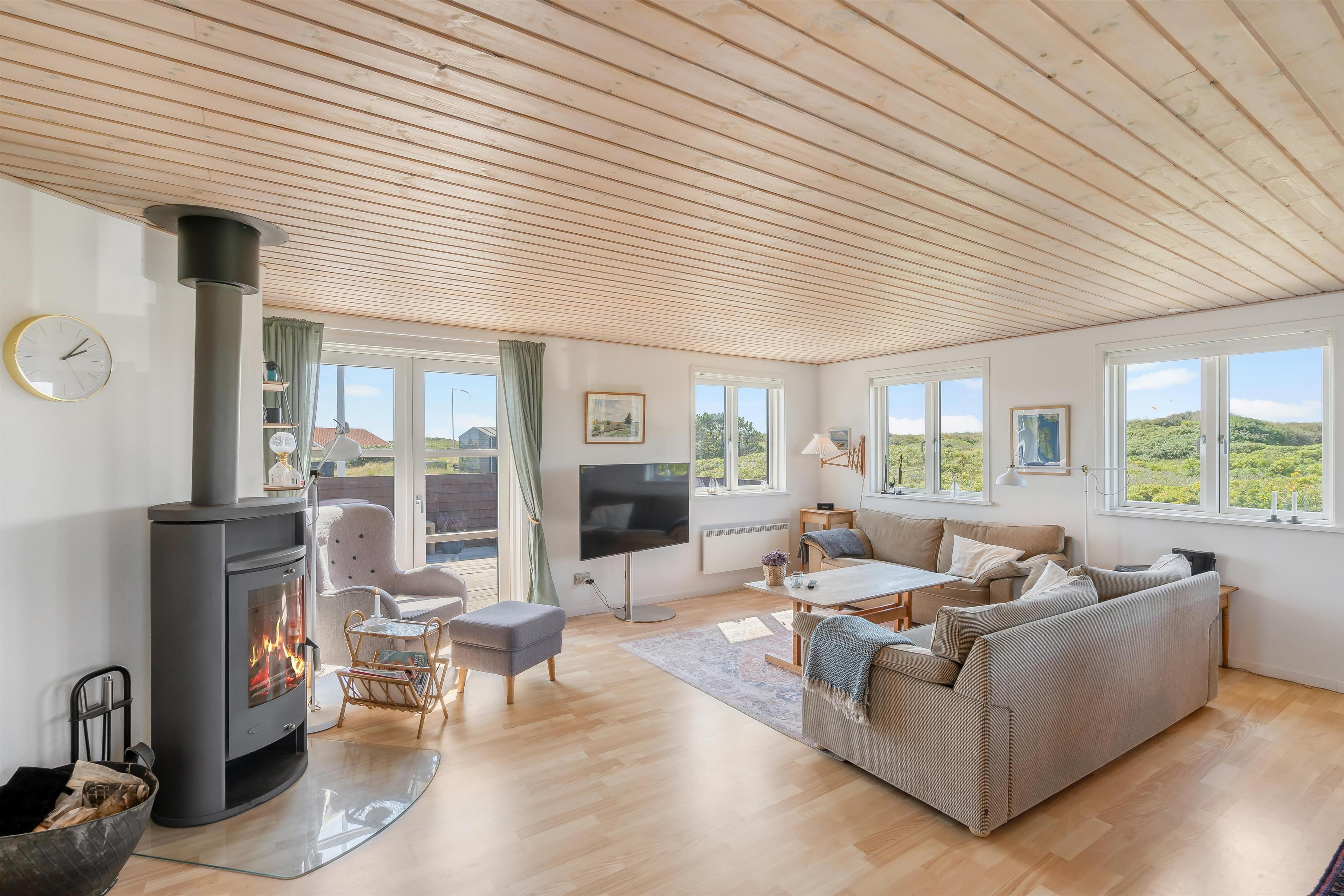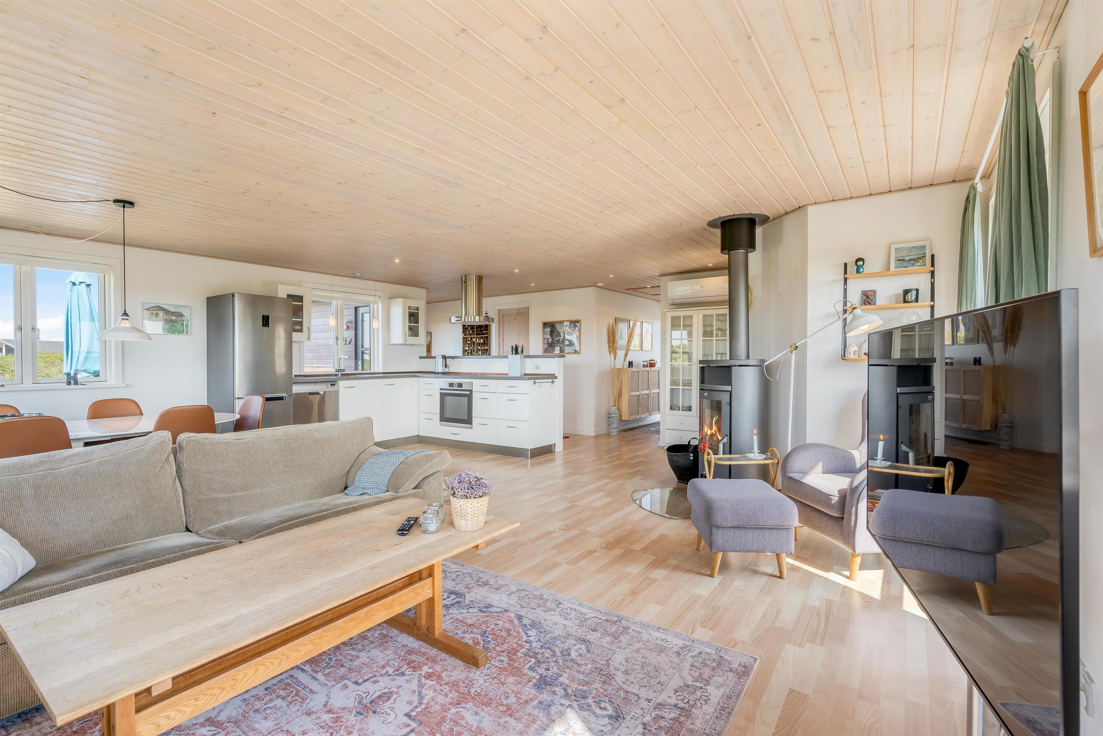 I alrummet står brændeovnen for at fuldende den hyggelige feriestemning, og spreder samtidig en dejlig varme i rummet. Derudover har I en energivenlig varmepumpe i feriehuset, der sørger for behagelige indendørs temperaturer.