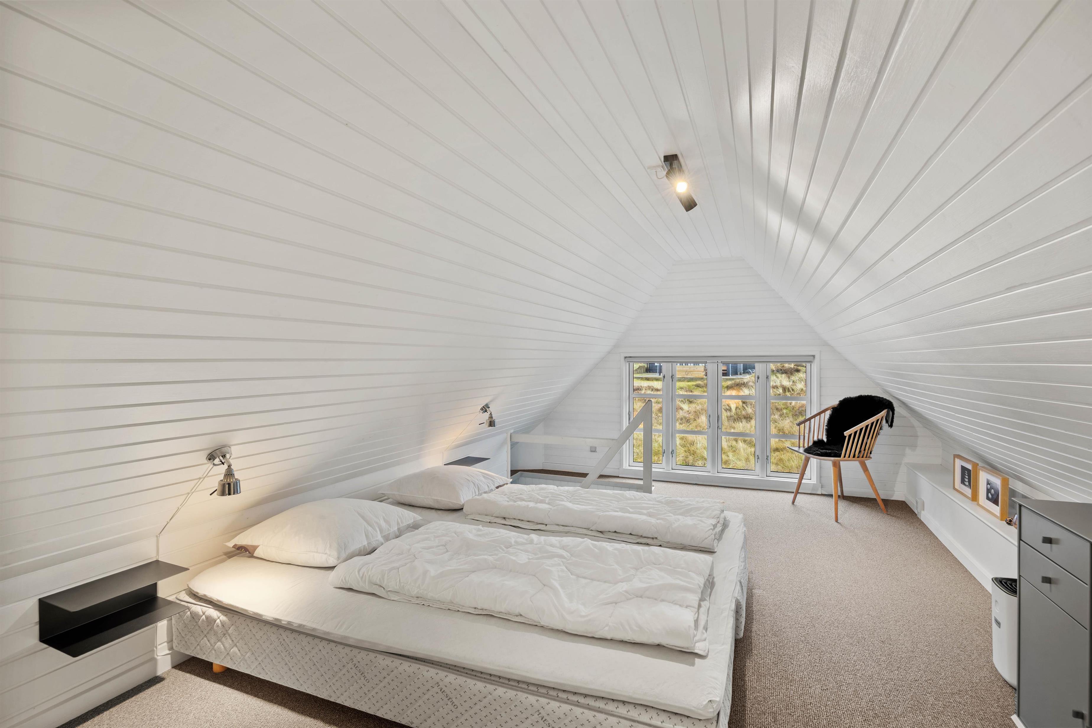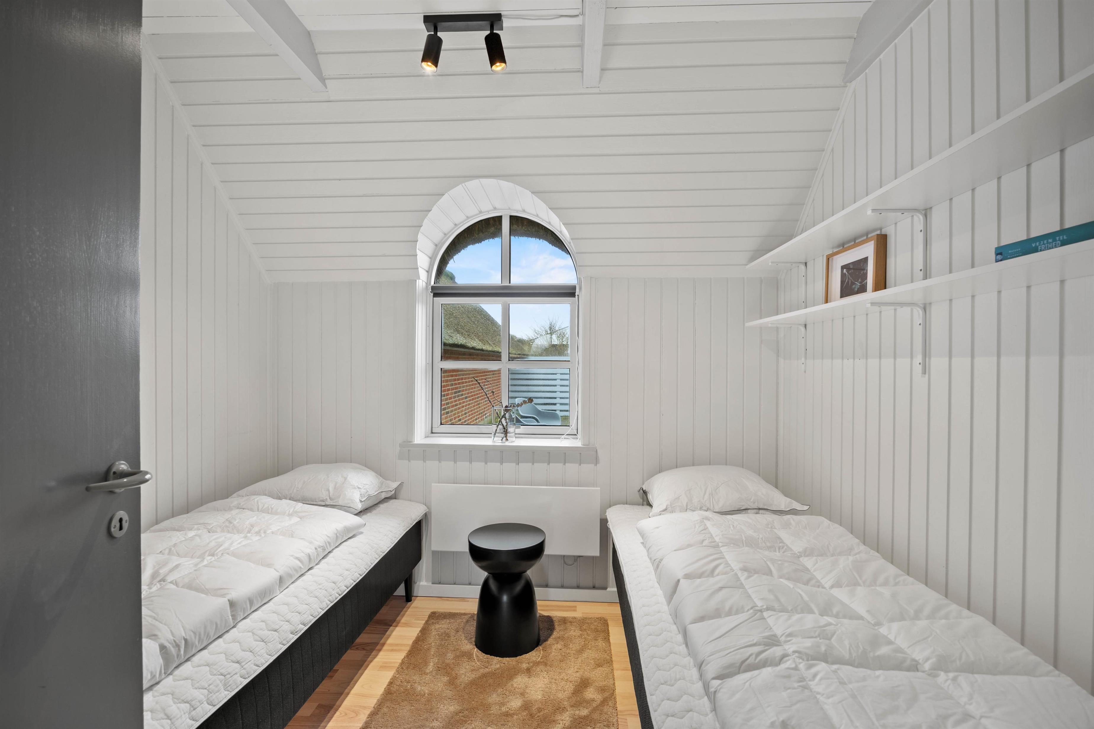 Soveværelserne er lyse, indbydende og praktisk indrettet. Der er 1 soveværelse med dobbeltseng samt 2 værelser med 2 enkeltsenge i hver – så alle har deres egen hyggelige lille base.