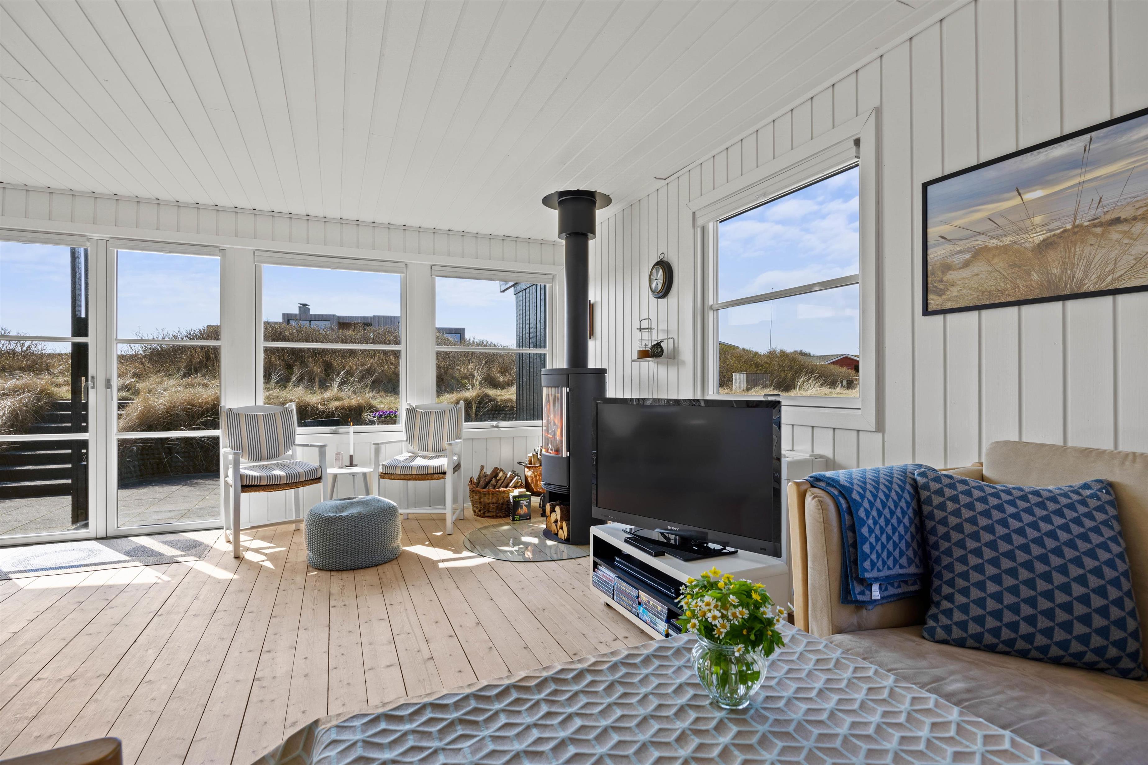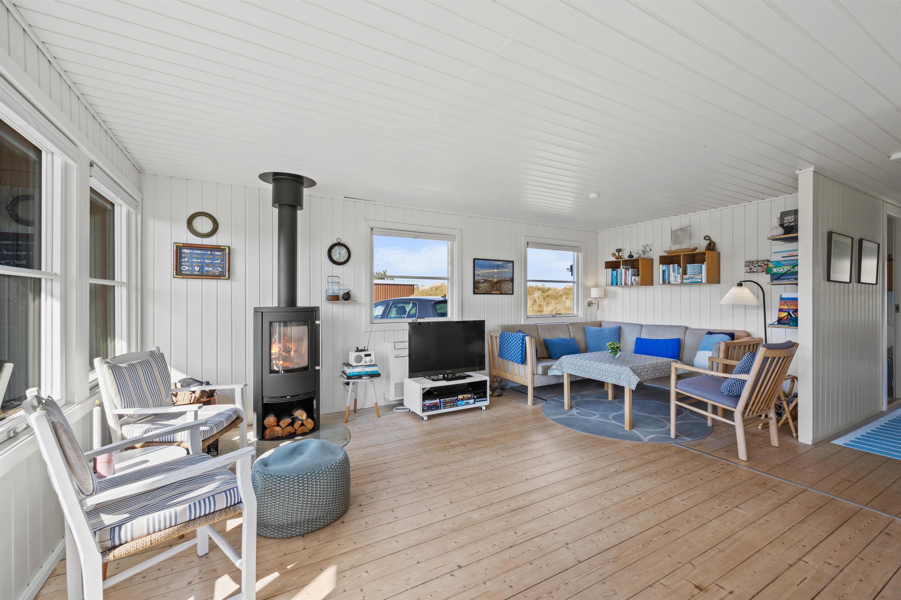 Når hele ferieflokken samles til hyggelige stunder, kan I gøre det i alrummet, der helt naturligt danner rammen for mange forskellige ferieaktiviteter I kan lave sammen. Her kan I blandt andet lave mad, spille spil og se film, alt imens brændeovnen fuldender den hyggelige stemning med sin knitren i baggrunden. Indretningen er lys og lækker og byder på sommerhusstemning med hvidmalede trævægge og lofter - med farvespil af blå nuancer i detaljer, som puder og plaider.