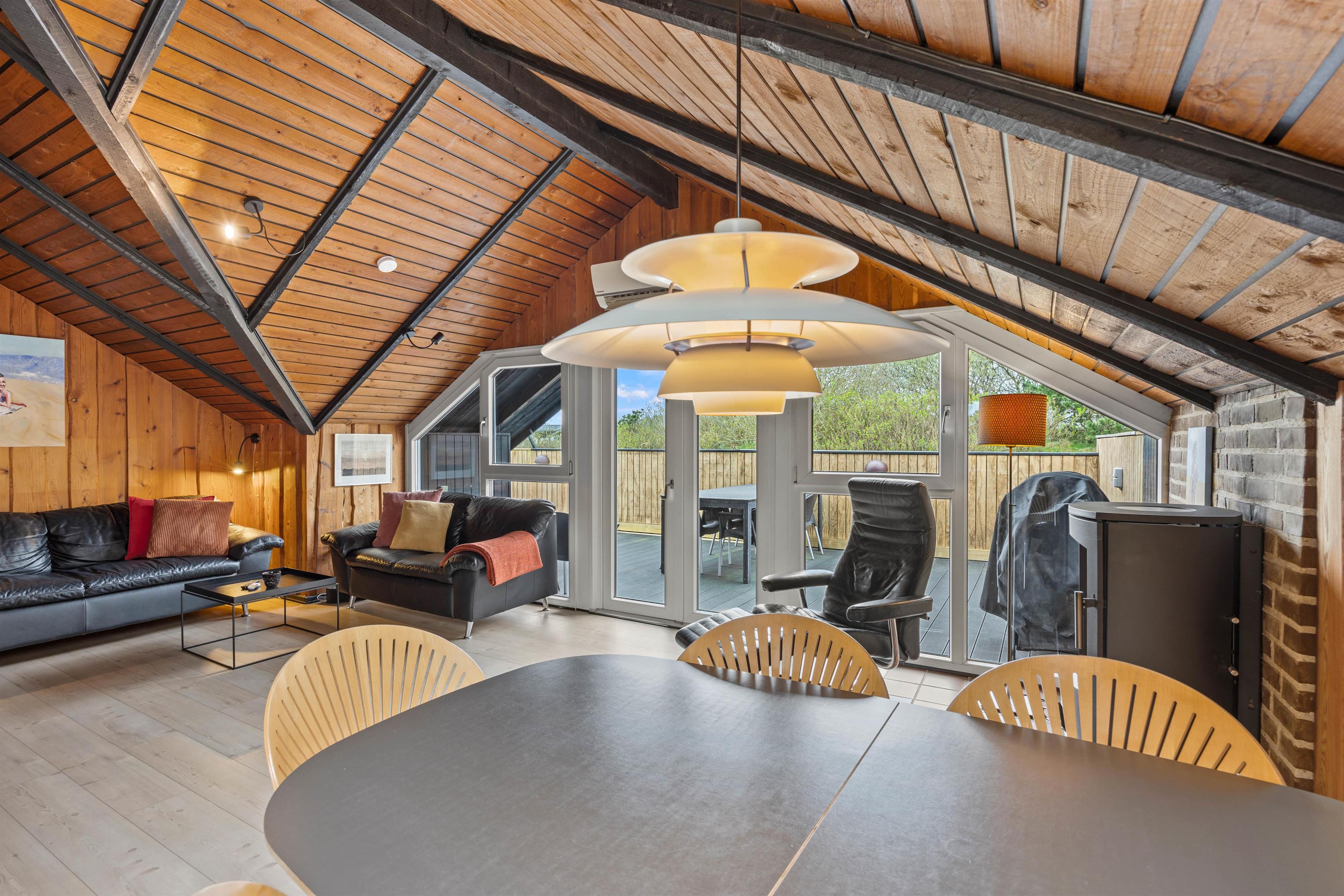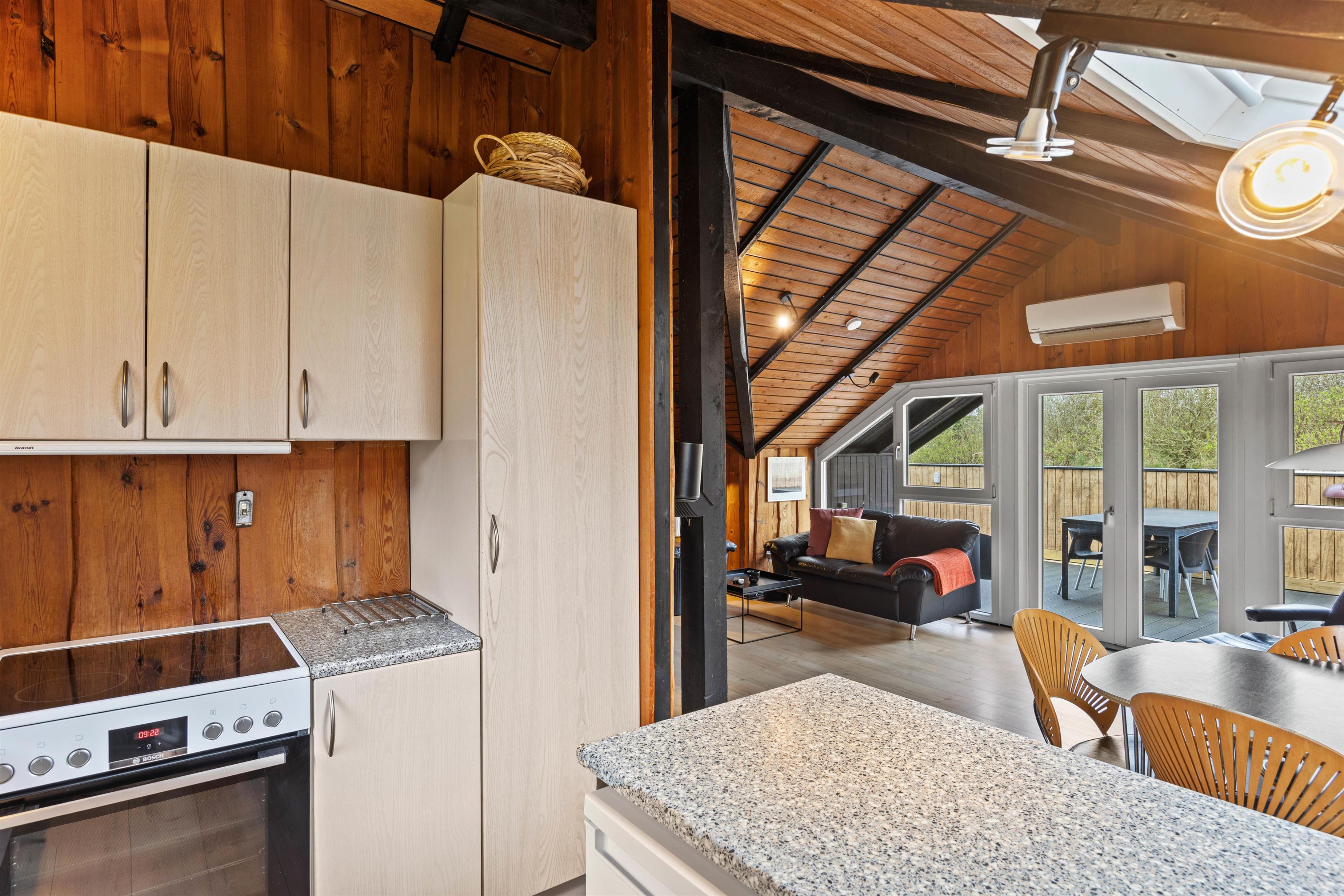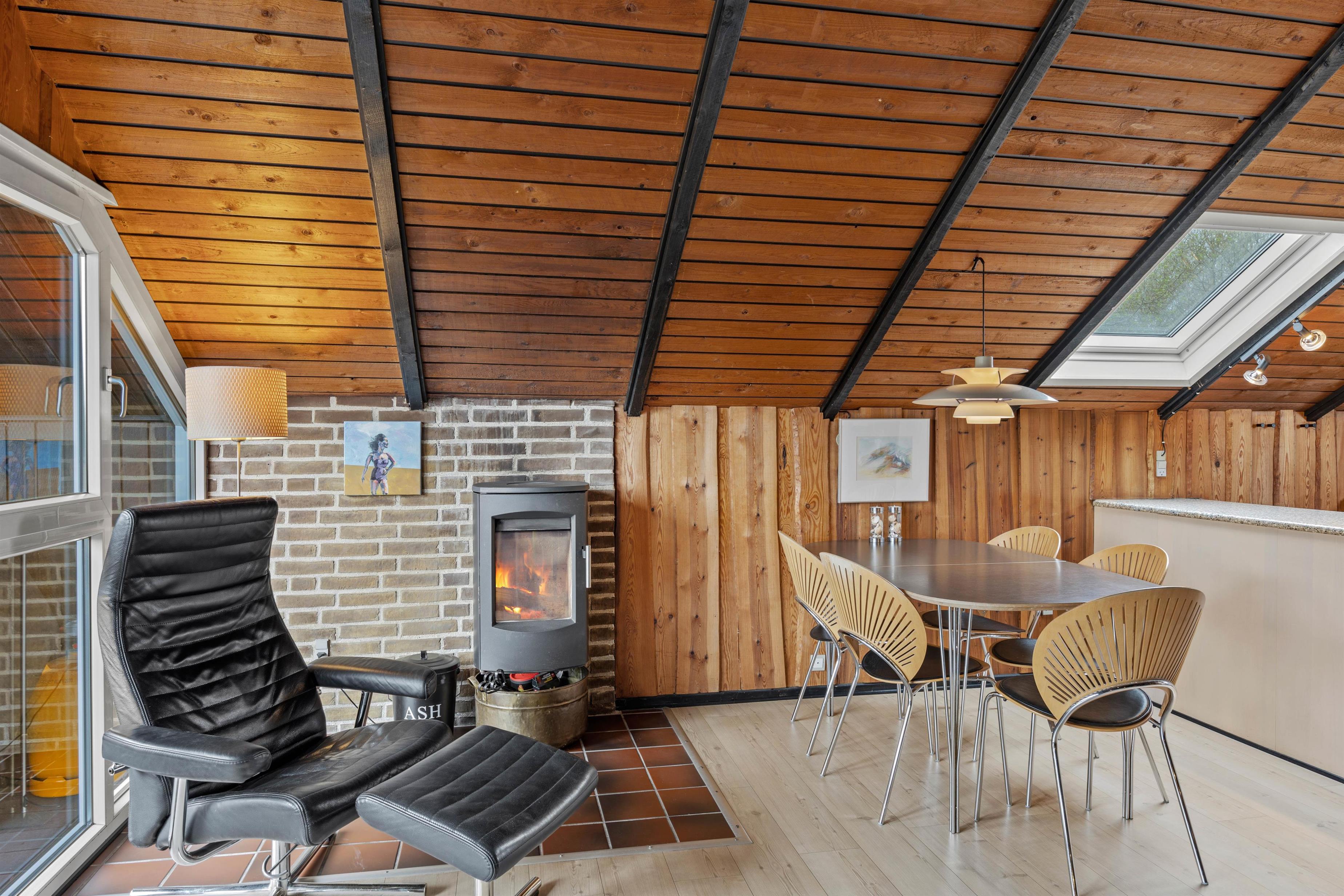 I opholdsrummet finder I en brændeovn, der skaber en varm og hyggelig atmosfære – især på kølige aftener eller i vinterhalvåret. Det knitrende ildsted bliver hurtigt samlingspunktet for hele familien, hvor I kan slappe af med en god bog, spille spil eller bare nyde roen efter en dag med strand, natur og oplevelser. Brændeovnen suppleres af en varmepumpe, der sikrer et behageligt indeklima året rundt.