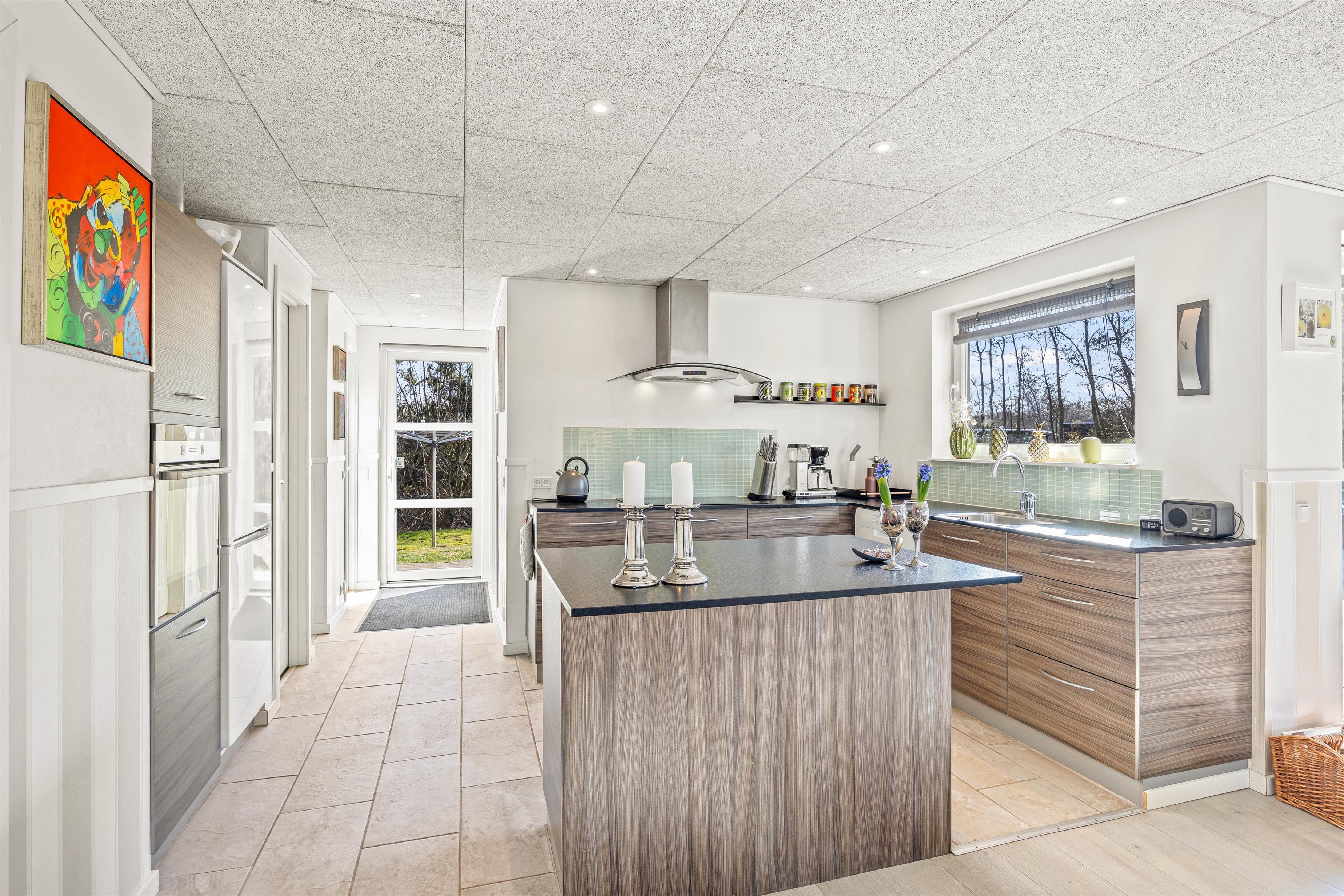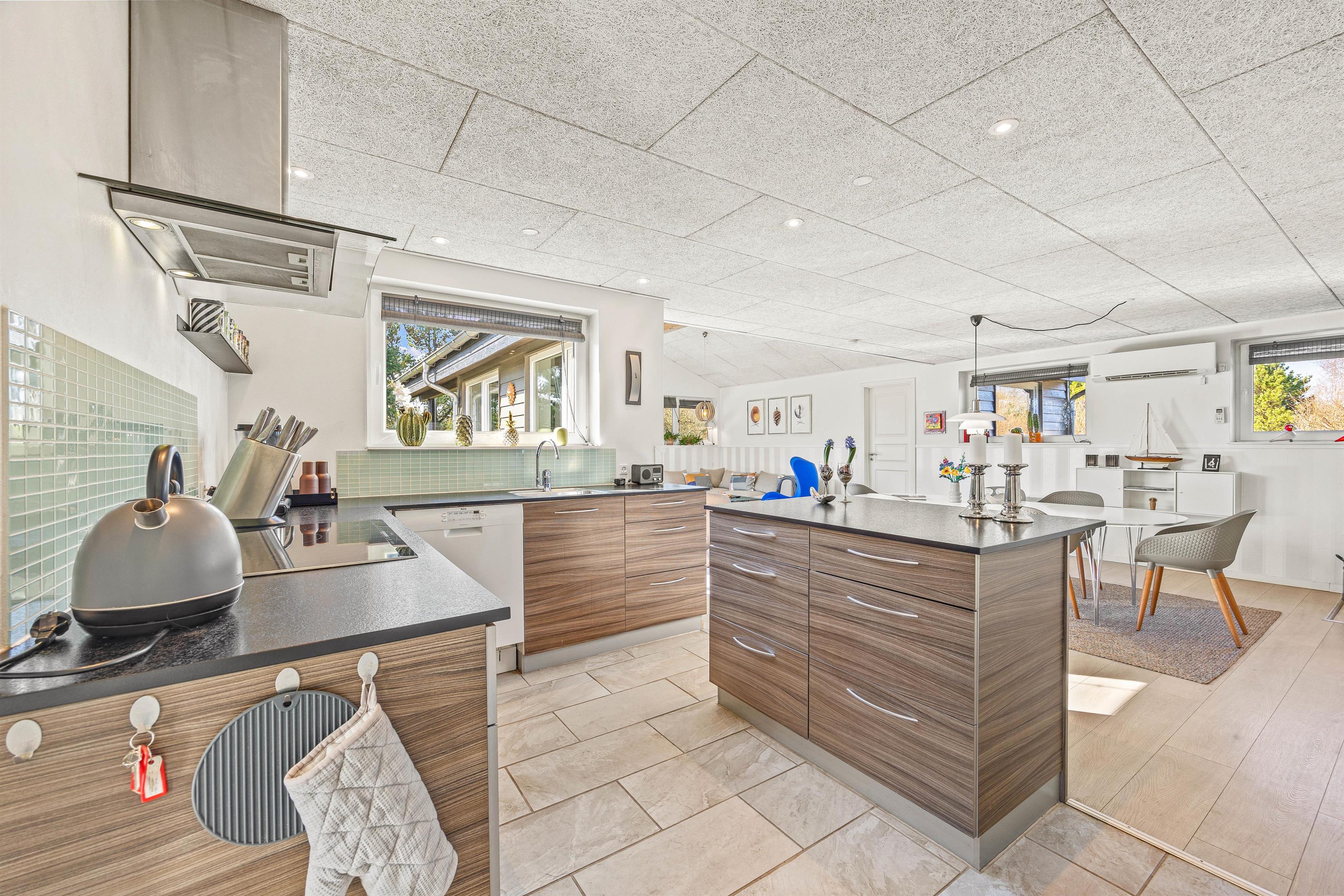 Feriehuset er indrettet således, at der er plads til hele familien. Det store opholdsrum med integreret køkken og spiseplads er moderne indrettet og er udstyret med en brændeovn, som sørger for hygge og varme. Alternativt kan I benytte den energibesparende varmepumpe, som hurtigt og effektivt varmer feriehuset op.