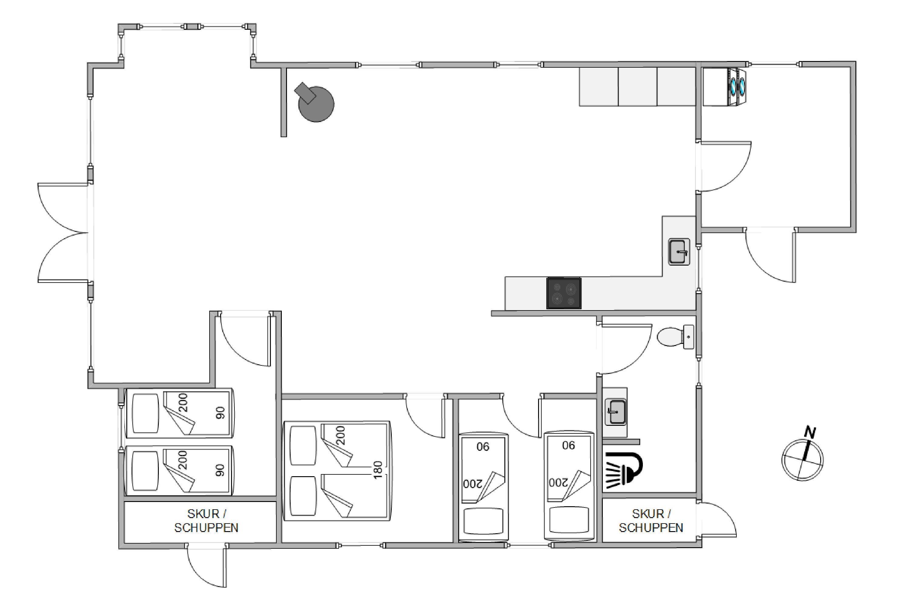 Når I træder ind i sommerhuset, vil I straks mærke den hyggelig stemning, der kendetegner en sommerhusferie. De lyse, træbeklædte vægge og lofter skaber en indbydende atmosfære, og de mange vinduer giver et skønt naturligt lys i det åbne opholdsrum. Uanset hvor I befinder jer i stuen, kan I altid nyde den smukke udsigt til naturen omkring jer.