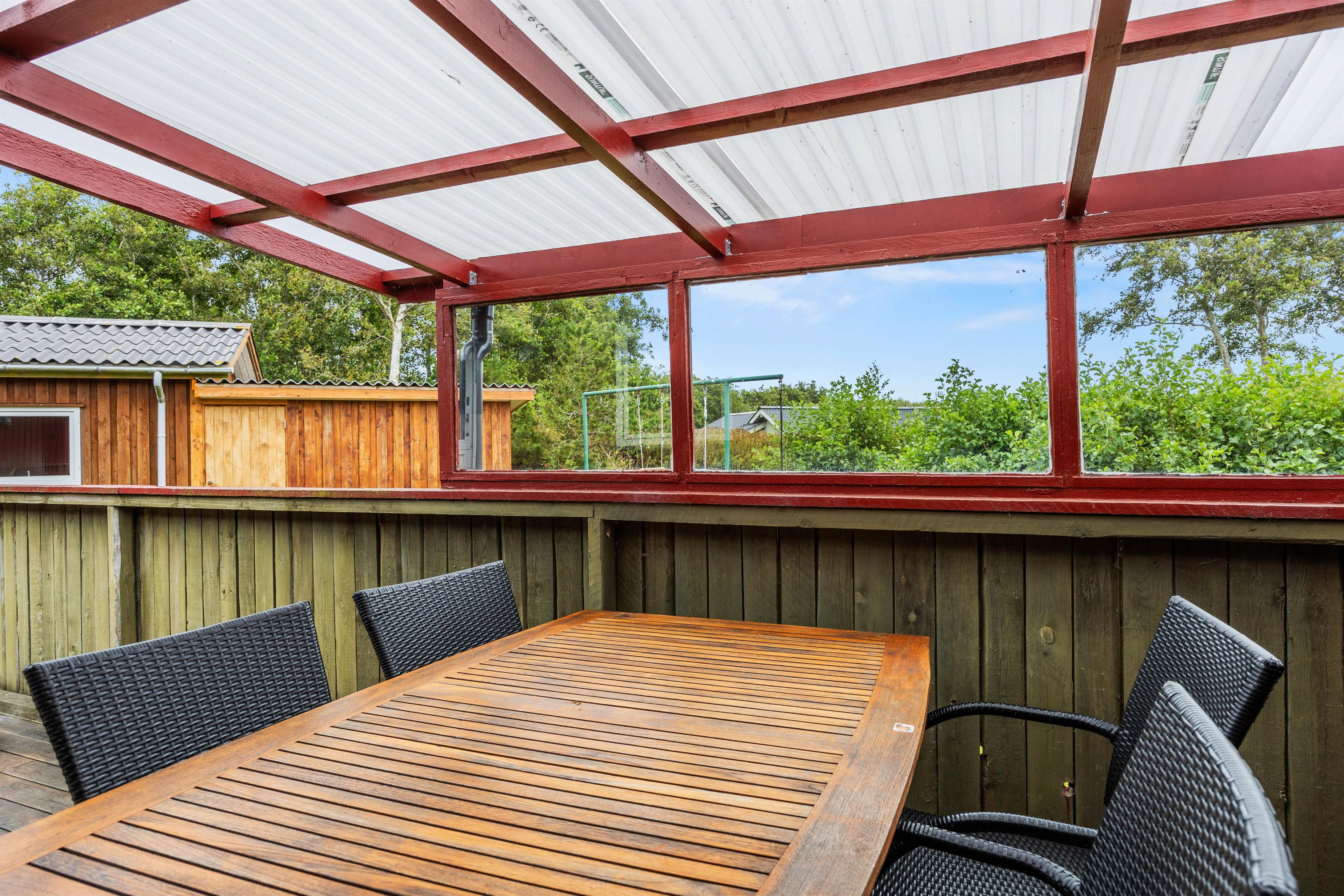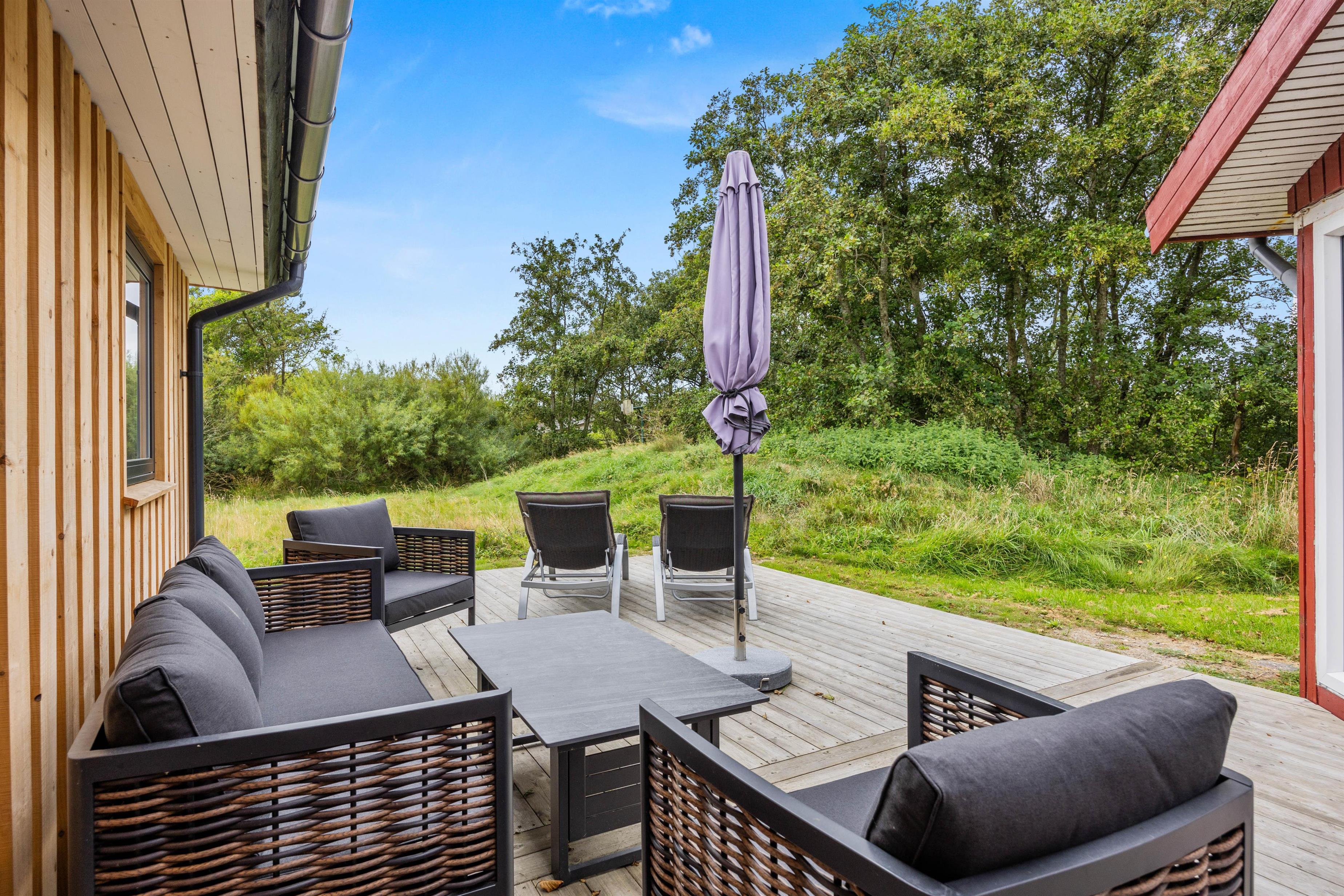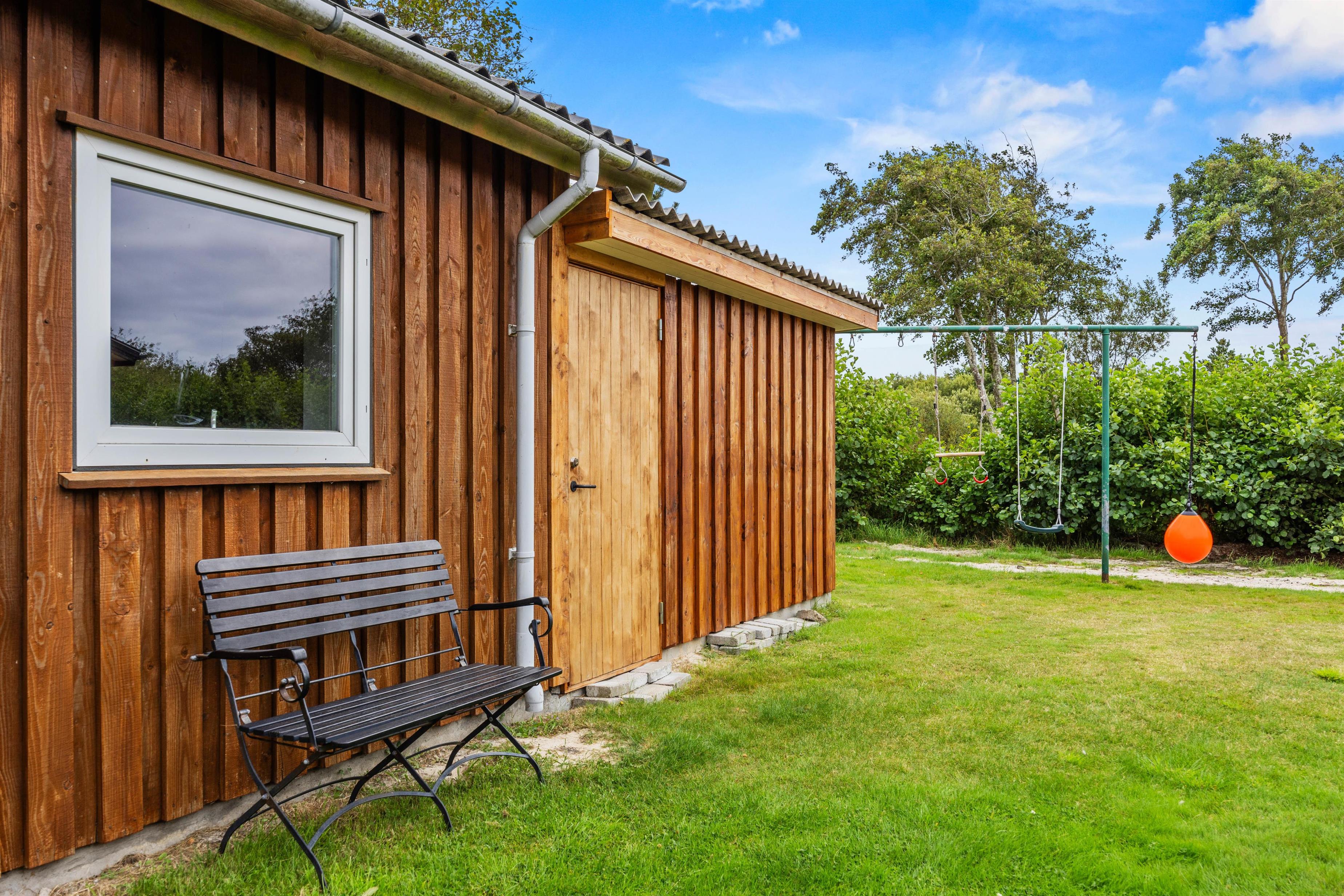 Sommerhuset byder også på et skønt udeområde, hvor der er noget for både store og små, så hele familien kan tilbringe de solrige feriedage ude i det fri. Børnene kan lege i haven, hvor der også er en sandkasse og et gyngestativ til dem.