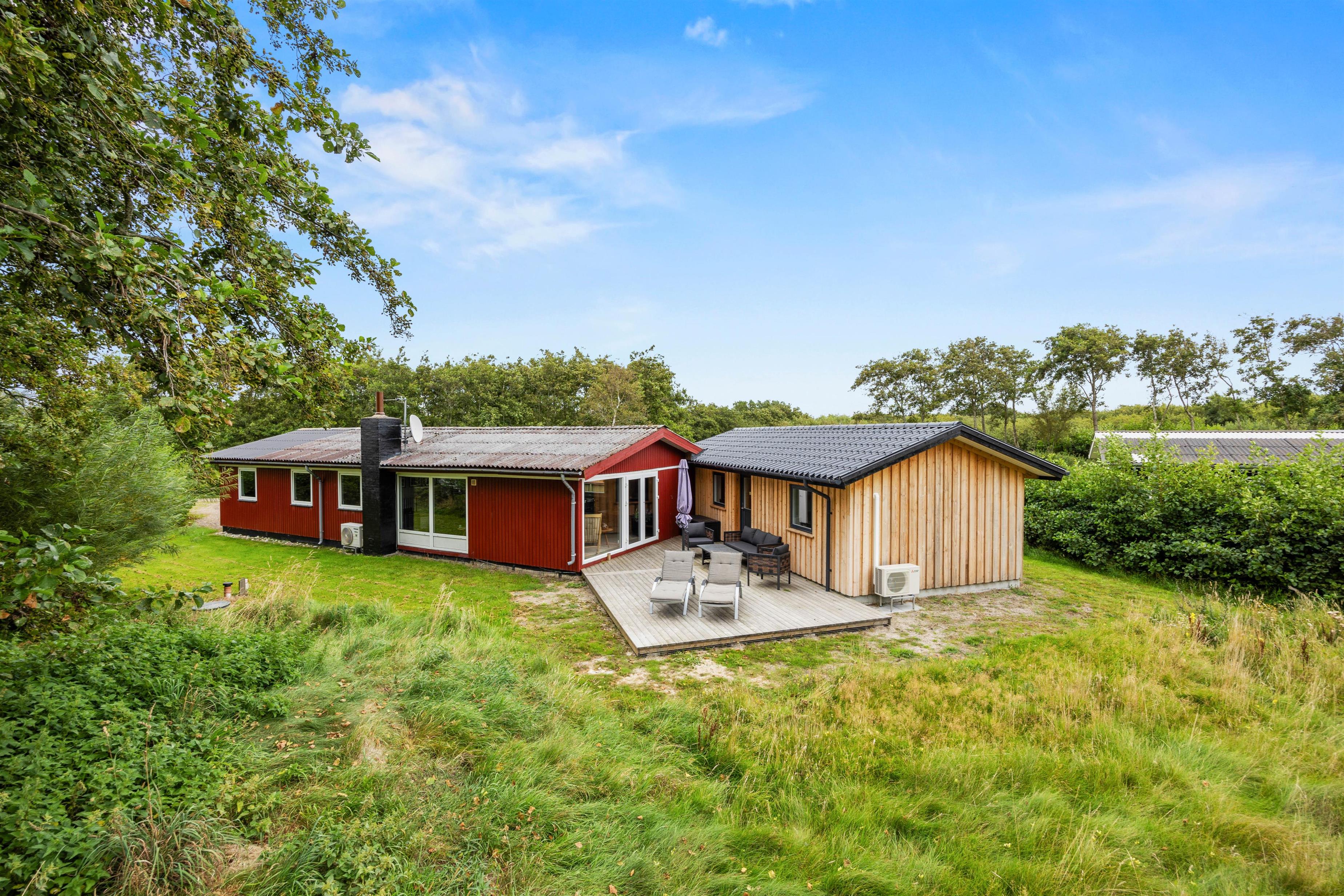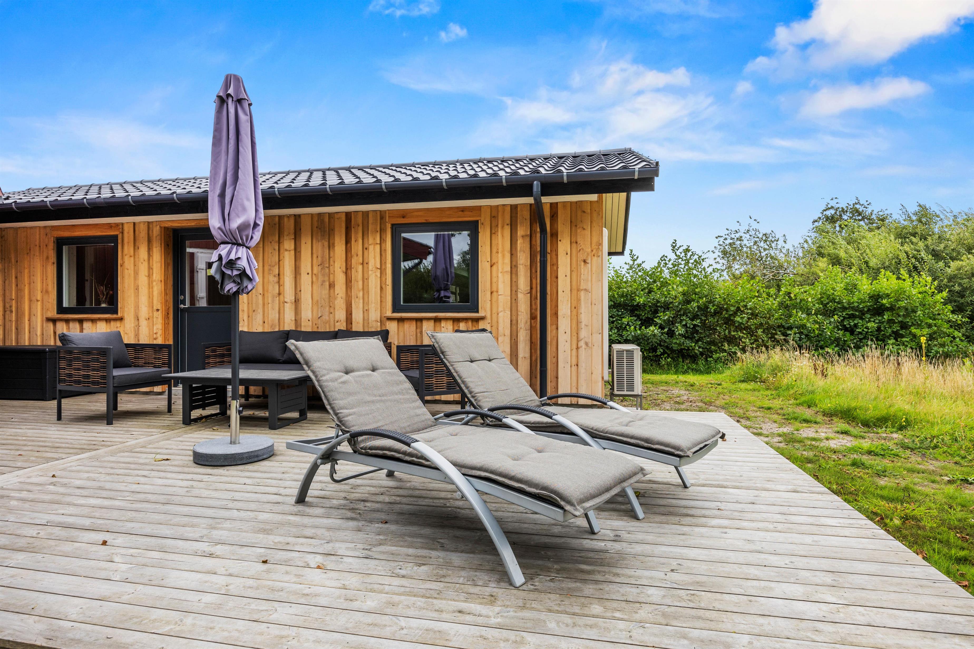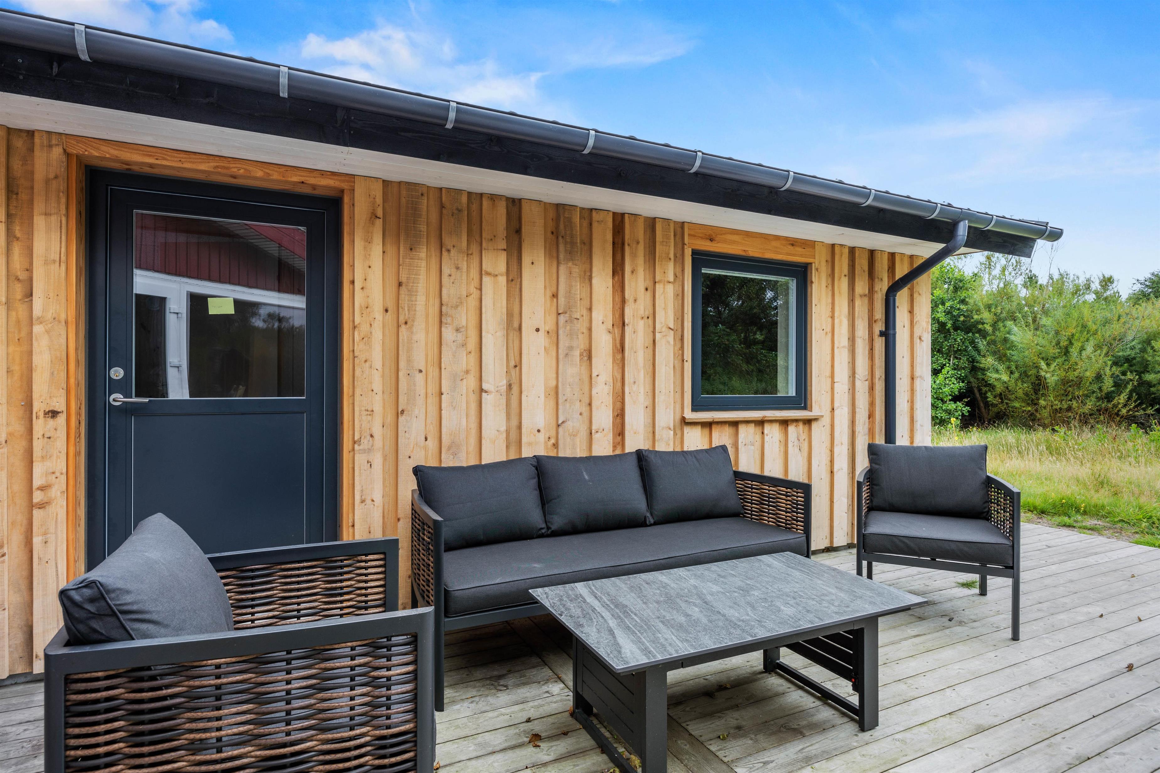 Sommerhuset byder også på et skønt udeområde, hvor der er noget for både store og små, så hele familien kan tilbringe de solrige feriedage ude i det fri. Børnene kan lege i haven, hvor der også er en sandkasse og et gyngestativ til dem.