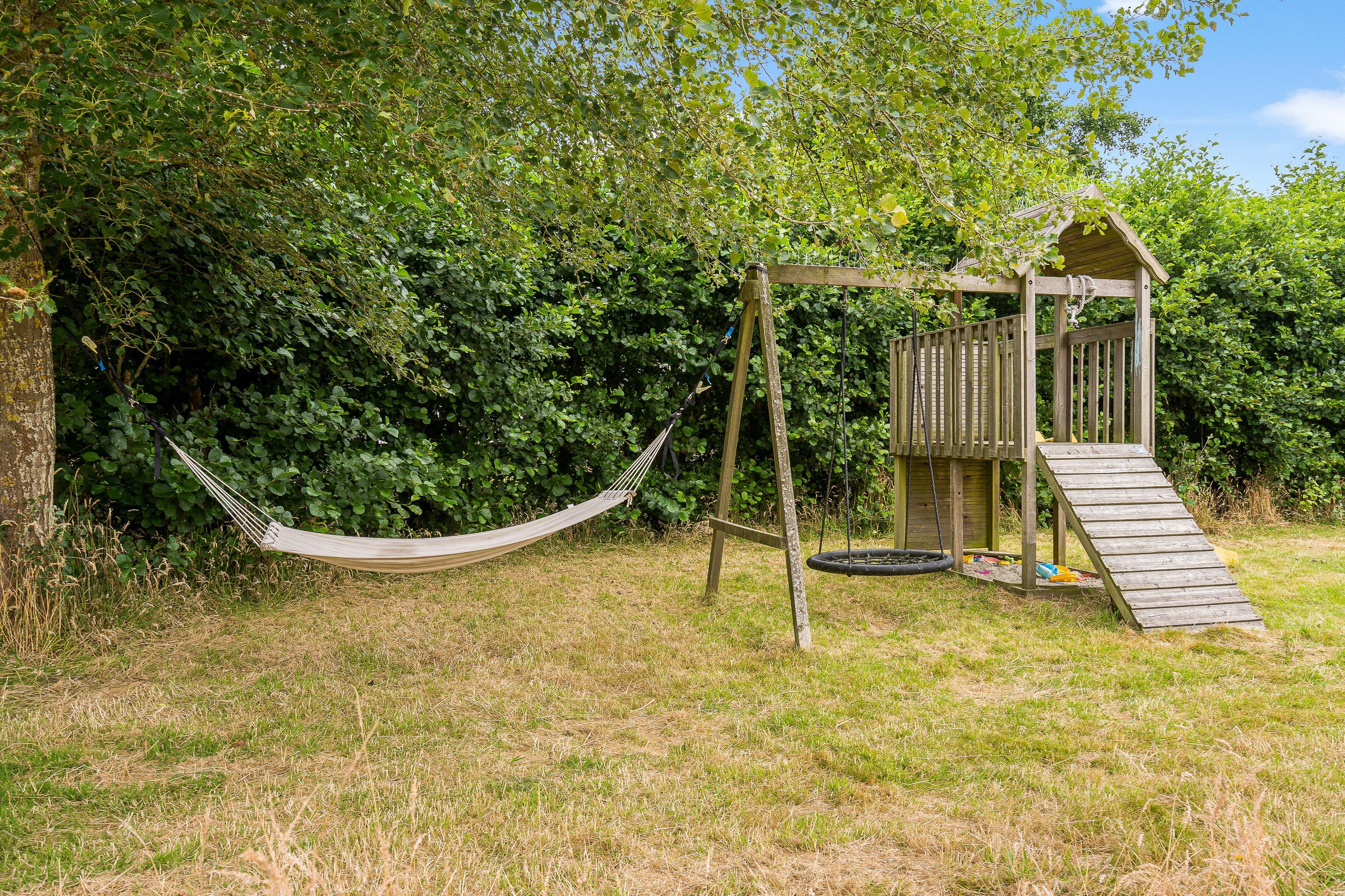 På sommerhusets 2800 kvadratmeter store plænegrund venter jer et dejligt udeområde, hvor hele familien kan nyde de solrige feriedage. I haven er der god plads for børnene at boltre sig på, og her står der også et gyngestativ klar til dem.