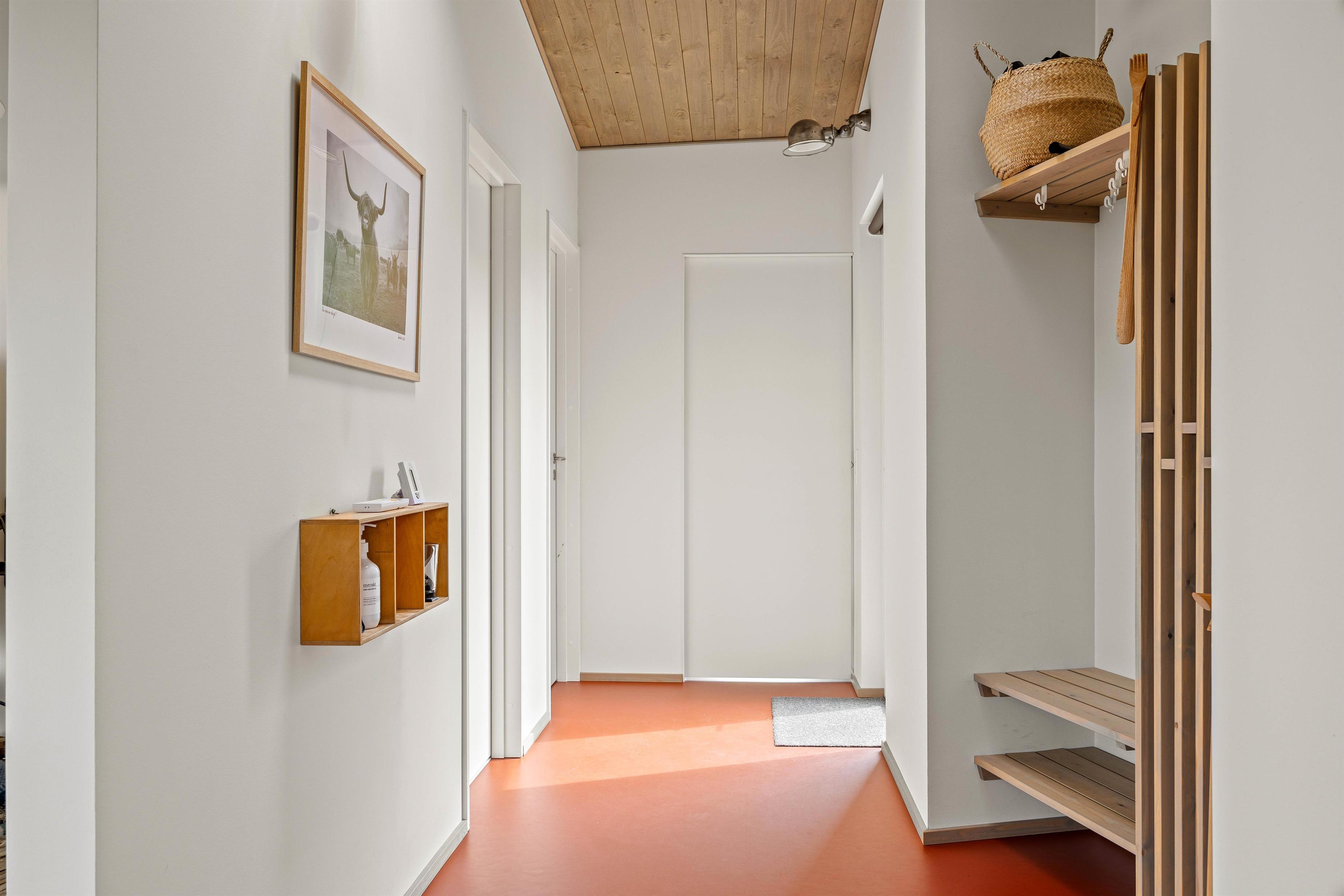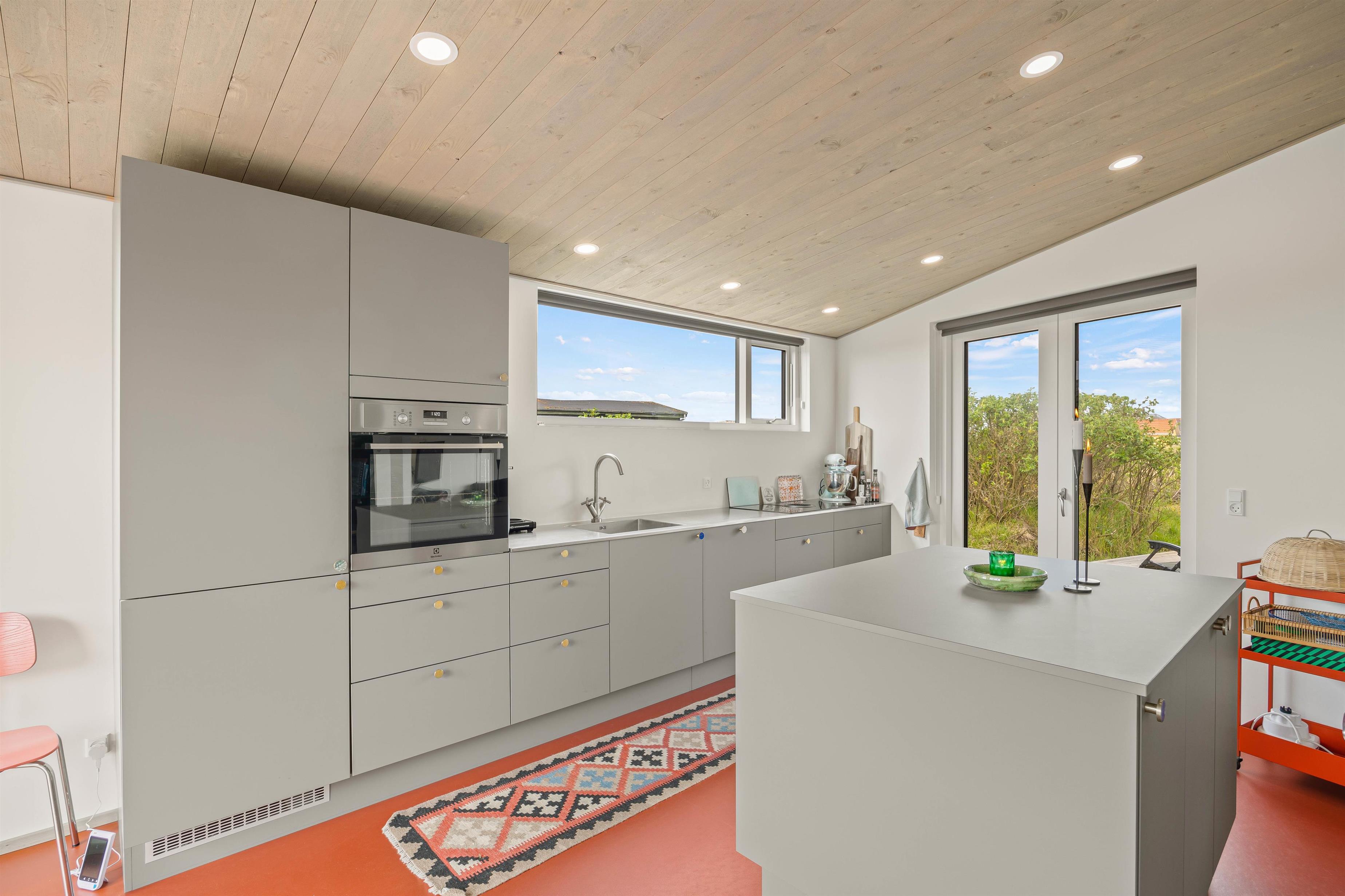 Det praktisk indrettede og indbydende køkken fremstår med en separat 85 liters fryser, samt med et induktionskomfur og en opvaskemaskine, der gør husarbejdet nemmere. Den farverige indretning løber som en rød tråd igennem hele feriehuset, og binder rummene sammen i en herlig forening af farver og teksturer.